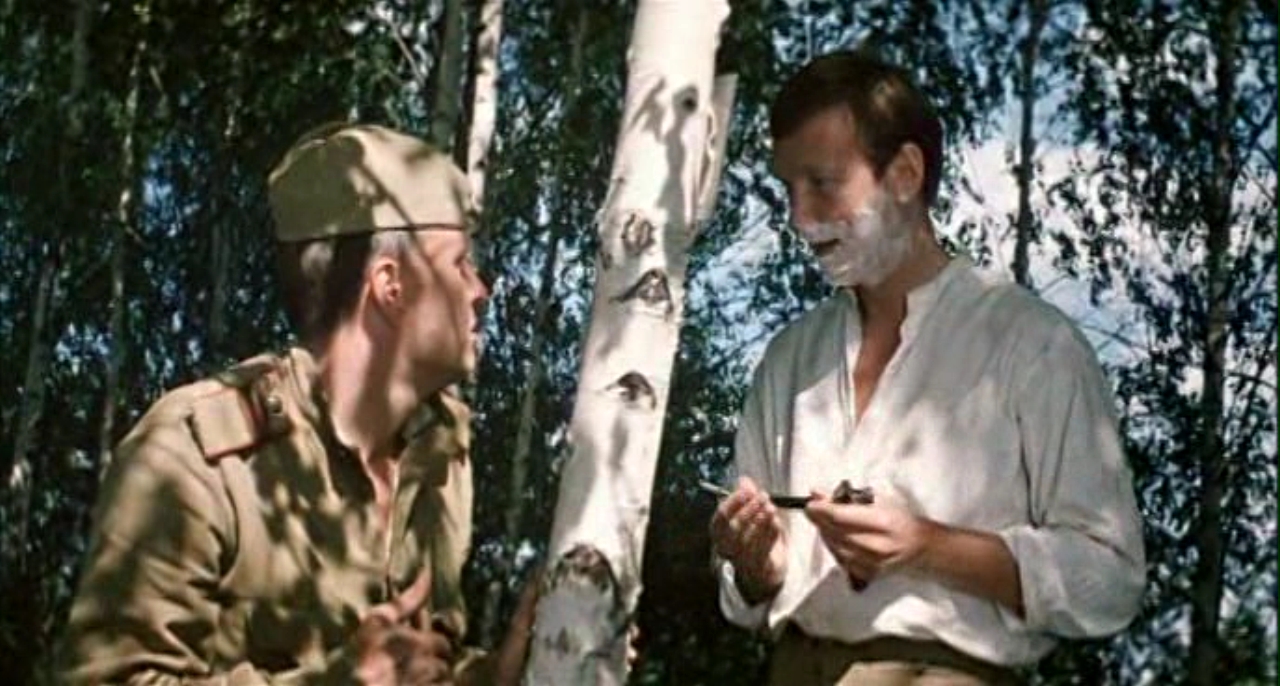 Сначала герой Бориса Галкина обнаруживает бритвенные принадлежности в офицерском кожаном несессере, находящемся в брошенном немецком автомобиле. Часть из них (бритву, кисточку с чашей и, видимо, коробочку с бритвенным мылом) он забирает как трофей, перекладывая их в свой вещмешок. Затем в фильме следуют 4 сцены бритья- две в исполнении самого Галкина, две- других актеров. Примечательно, что по сюжету герой Галкина- рядовой Белов- большой поборник чистоты. Во время второй сцены бритья между ним и одним из бойцов группы возникает диалог: - Что, командир, на танцы собрался? - Глянь в зеркало. Скоро ёж в бороде заблудится! Волхвы не боятся могучих владык,