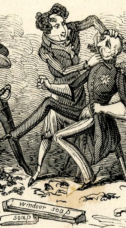 Исаак Роберт Круикшанк, иногда известный как Роберт Круикшанк, был карикатуристом, иллюстратором и портретистом-миниатюристом, менее известным братом Джорджа Круикшенка. „Windsor soap” „Виндзорское мыло”, 1841 г. Сатира против Виндзоров (англ. House of Windsor) - царствующая королевская династия в Великобритании и других королевствах Содружества. Виндзоры - ветвь Саксен-Кобург-Готской династии. Взглянем поближе: С 2013 г. с кайфом бреюсь опасной бритвой пять раз в неделю, в три прохода.