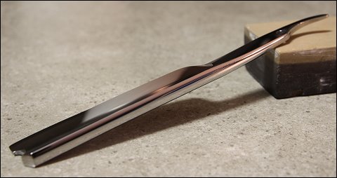 А можно еще ссылку на мастера? м.б. тему на стрйтразоре. Небольшая фаска на спинке не дает понять откуда она взялась если клин идеален, или он же всеж на пару десяток милиметров не клин? Но ручка карбон с такой бритвой - шик.