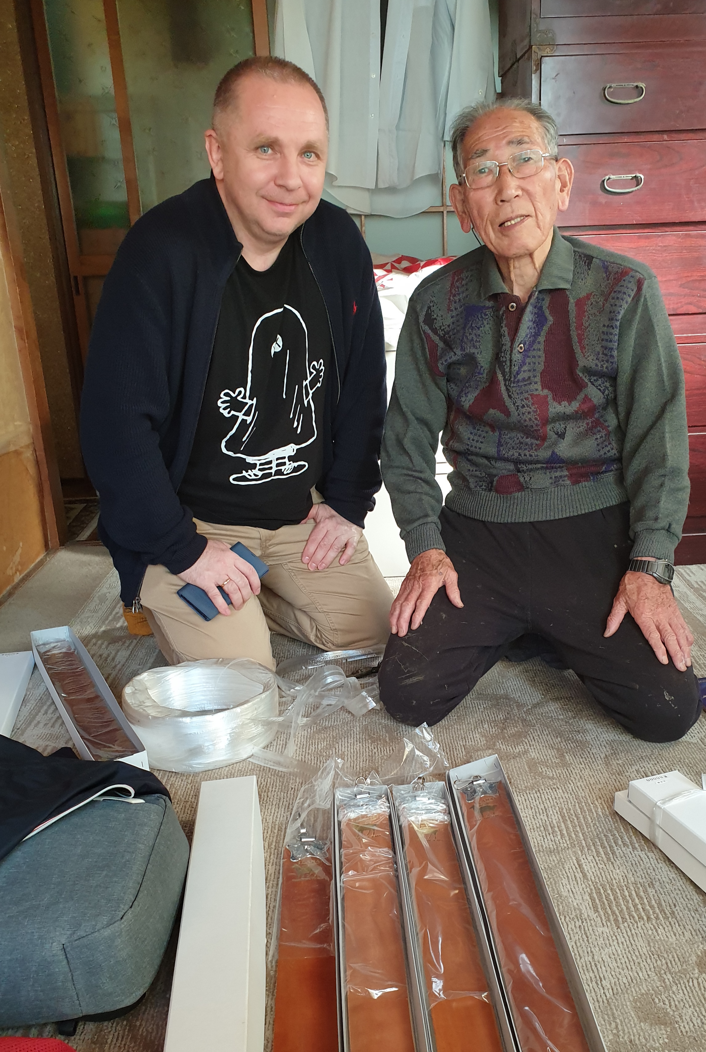 В конце, чтобы уж совсем у меня был "маузер Дзержинского" - я попросил Мастера подписать ремни, он ответил, мол есть лучше вариант - и принес и вручил свою визитную карточку. В Японии визитки вручают двумя руками и с поклоном, выглядит необычайно торжественно. Тут я совсем растерялся, тупанул и не сообразил достать свою визитку, чтобы уж совсем всё по-взрослому было. Хорошо жена не подвела и небольшой сувенир из Москвы мы не забыли подарить))) Ну и фото на память сделали