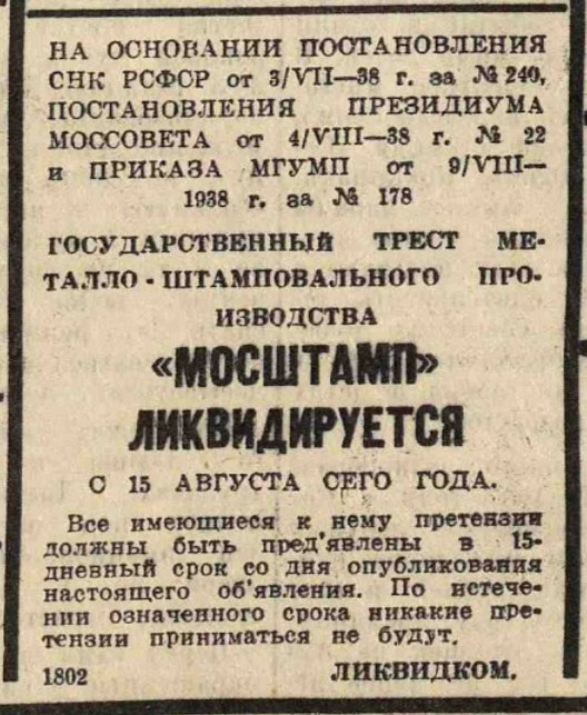 вот, что нашлось: Это шапки внутренних приказов по заводу №1. Содержание приказов не интересно, рабочие моменты. А вот изменения названия и даты очень даже. 19 августа 1938 года - завод №1 Треста "МОСШТАМП" 20 августа 1938 года - завод №1 "МОСШТАМП" 30 ноября 1938 года - завод "МОСШТАМП" Видно, что трест "Мосштамп" или ликвидировали 20 августа 1938 года или завод №1 вывели из этого треста. А вот приказ вышестоящей организации МГУМП (московское городское управление местной промышленностью):