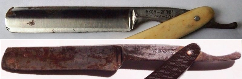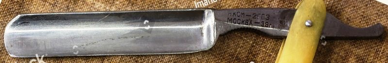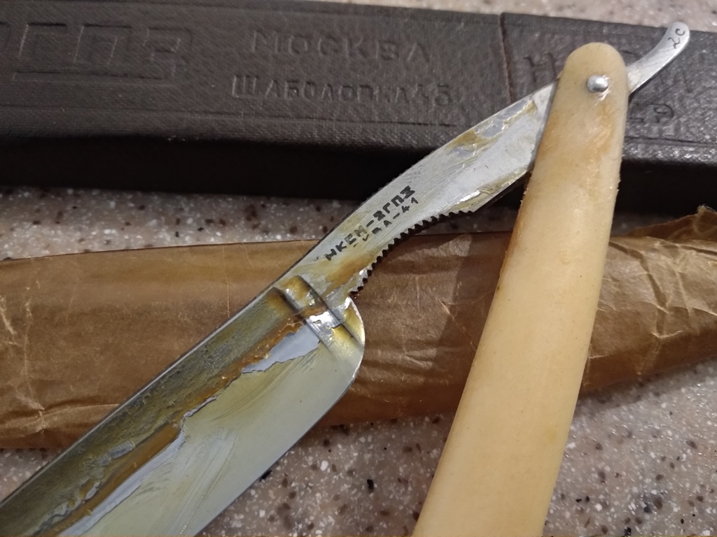 А на бритве 1939 года кто-то вообще его сточил... Из заметки в Рабочей Москве, ясно сколько было выпущено бритв в 1938 году ( синяя коробочка НКМ СССР). Примерно 128 тысяч (верхняя оценка)