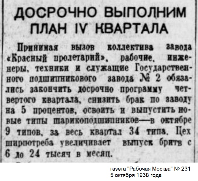 Не смотря на то, что это был первым в СССР заводом (да и в России, до национализации его в 1917 году ) по производству подшипников, он стал №2. Это произошло потому, что пока работала концессия SKF, в Москве начали строить ГПЗ-1. Вот такое стечение обстоятельств, когда концессия перестала существовать, ГПЗ-1 уже работал и ничего не оставалось, кроме, как стать вторым. 28 августа 1937 года из Народного комиссариата тяжёлой промышленности СССР выделен Народный комиссариат машиностроения СССР или НКМ. Так что начало выпуска бритв в цеху ширпотреба приходится на конец 1937 - 1938 годы. 5 февраля 1939 года НКМ СССР разделён на три наркомата — Наркомат тяжёлого машиностроения СССР, Наркомат среднего машиностроения СССР и Наркомат общего машиностроения СССР. ГПЗ-2 подчинили НКСМ СССР. Осенью 1941 года завод начали эвакуировать в Томск. Но, частично отпавленное оборудование разверули и, через несколько месяцев, возобновили работу в Москве. Реэвакуация. (Для примера скажу, что завод по производству безопастных бритв "Красная Звезда" попал в такую же ситуацию. Его начали эвакуировать в первых числах ноября 1941 года, погрузили все станки на баржи, но река Москва покрылась льдом и все баржи вмерзли за Коломной. Пришлось на грузовиках всё перевозить обратно в Москву.) Про бритвы: Первая, синяя коробочка - 1938 год. НКМ СССР. Вторая коробочка - 1939 - 194? год. НКСМ СССР. (не позднее 1946) У ГПЗ-2 было две линейки бритв первая дорогая, с костяной ручкой, бритва похожа на шведские с выемкой под большой палец, а вторая обычная. 1938 год Show