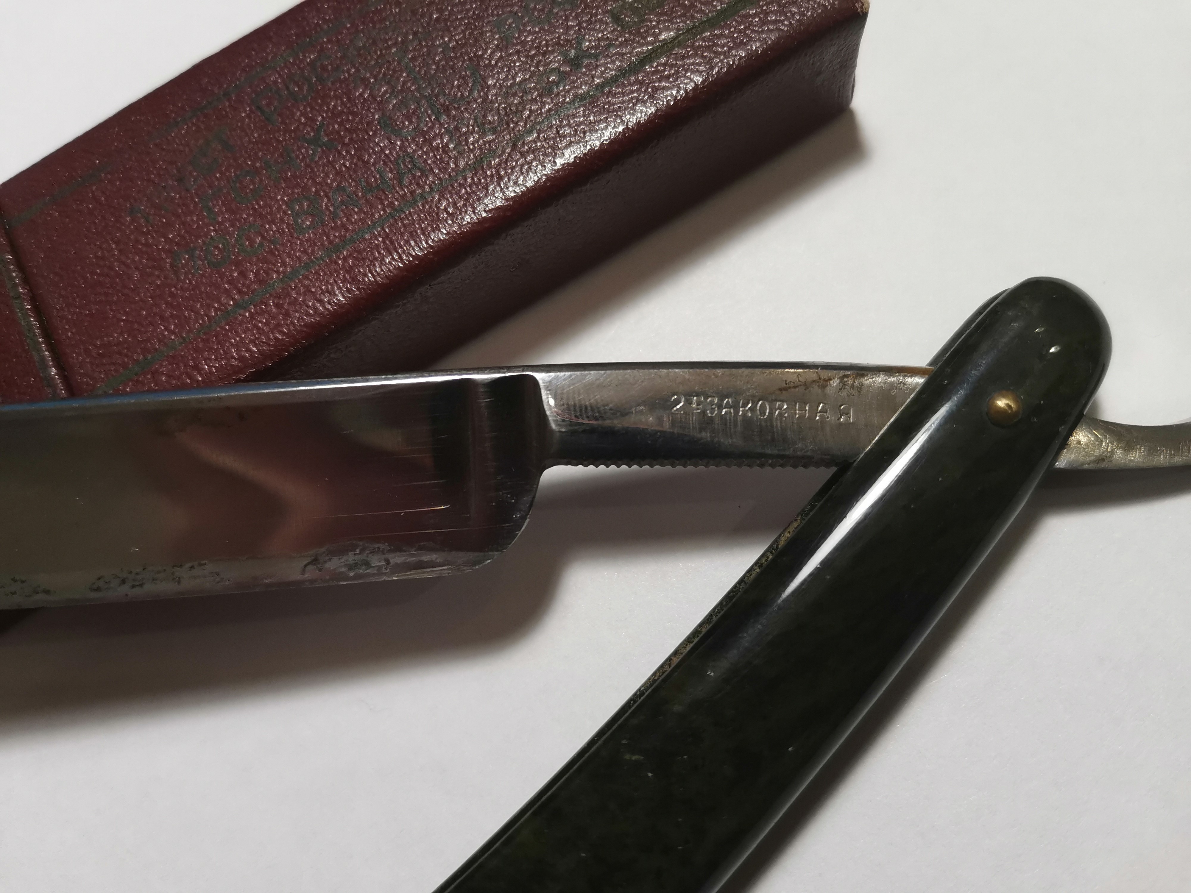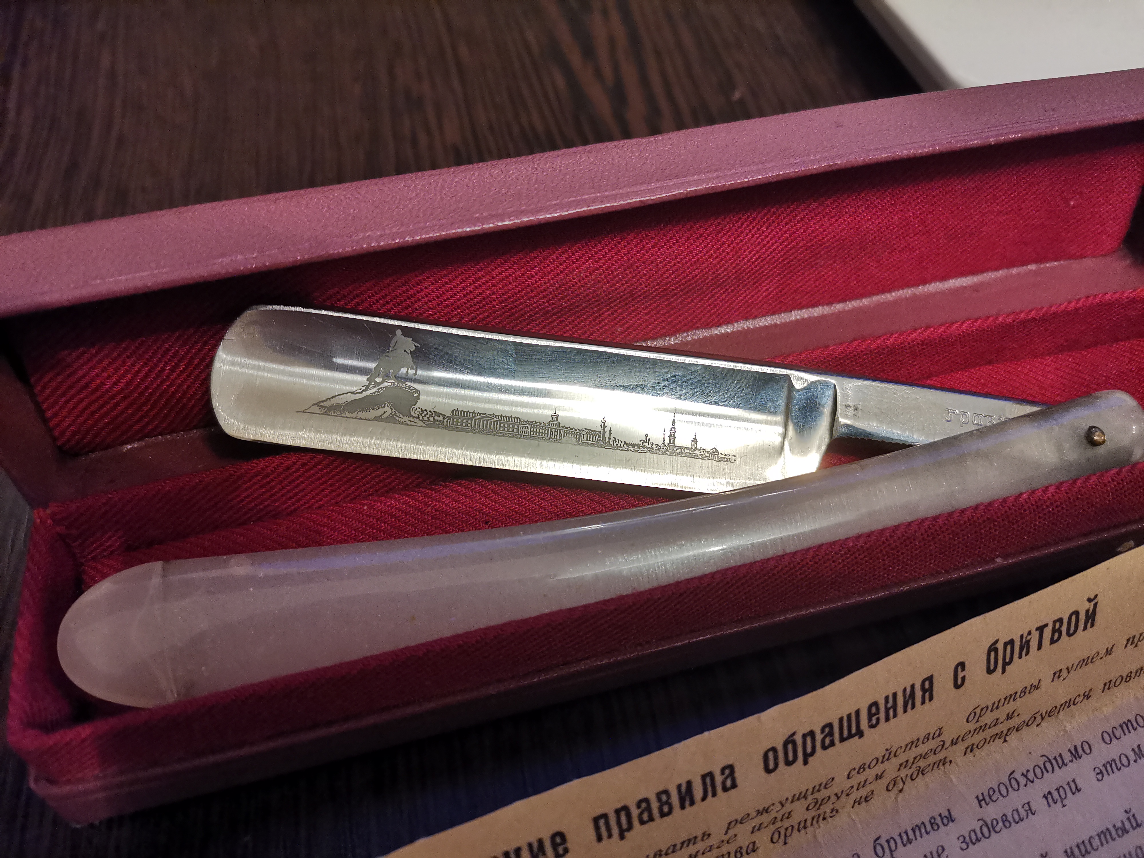 ЗТВ Подарок 56 г. Сюжет "Миру мир!", не частая бритва, барберский нос. Пришла в равномерной черной патине на всем полотне, и местами более серьезной коррозией, при таком раскладе всегда дилемма - почистить полностью и счистить гравюру или сохранить, при этом оставив где то следы или остатки. Считаю, что если гравюра повреждена безвозвратно, то счистить. Если можно как то сохранить, то это нужно сделать, без гравюры бритва теряет свою фишку. Чистил вручную, аккуратно, что то осталось по мелочи, но на мой вкус - не критично. Так же сохранил позолоту на обушке и носе