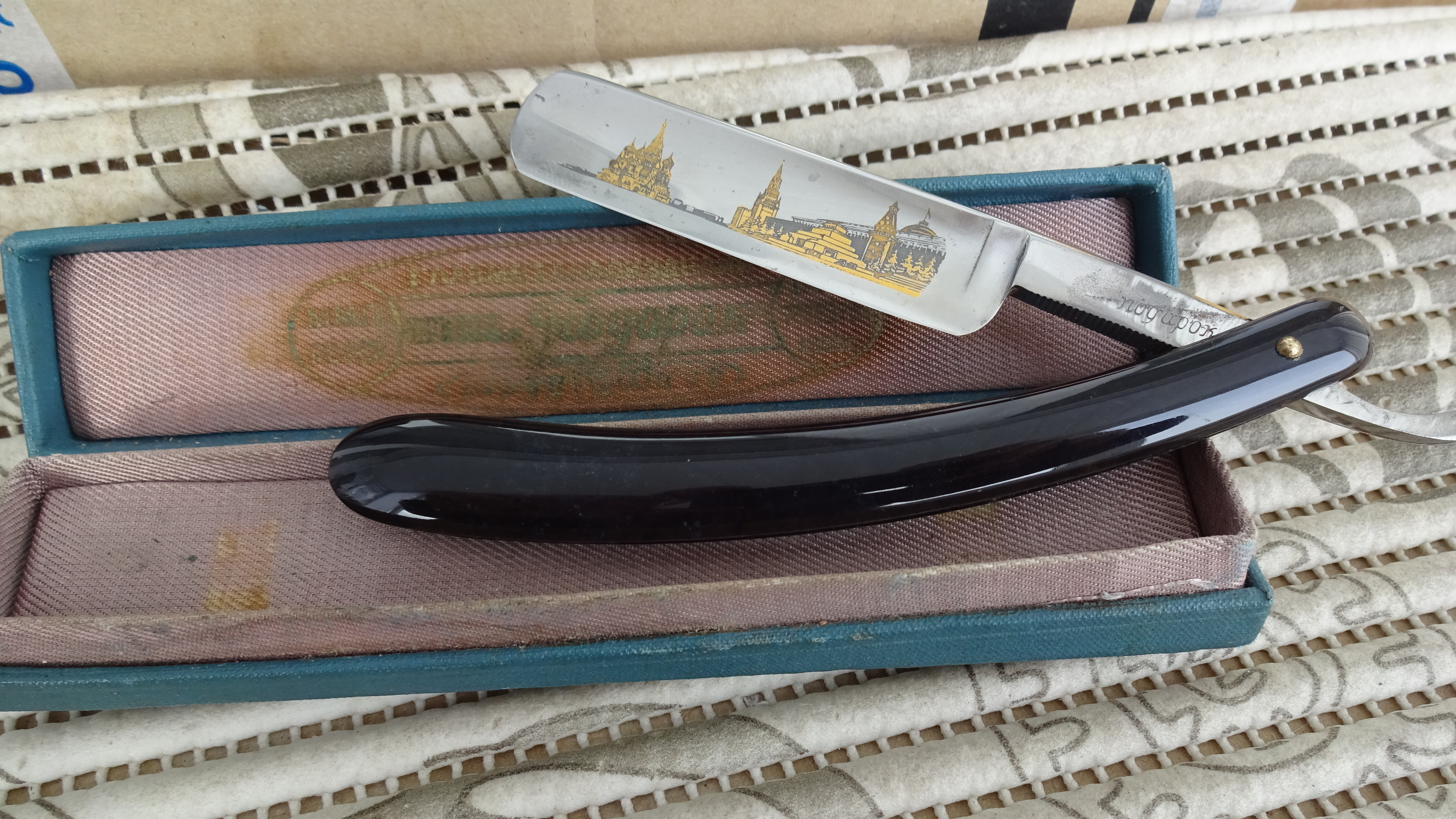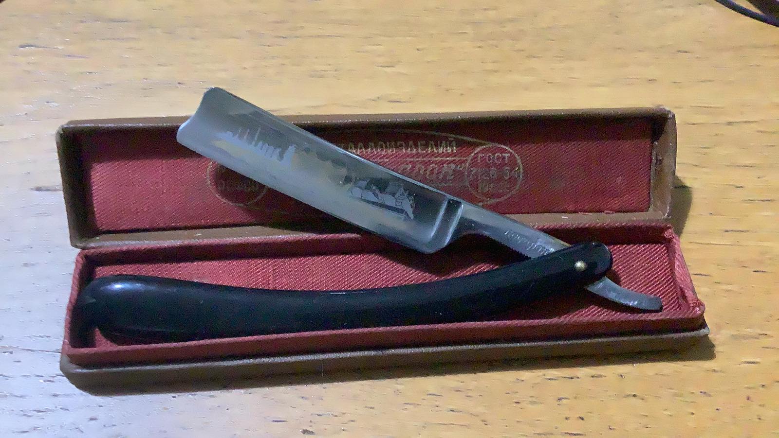 «Яхта» от завода Труд Вача, 1955 год. Непользованная, с родной коробочкой. По сравнению с «Яхтами» 1960-ых, эта более массивная. Сталь великолепная, затачивать одно удовольствие.