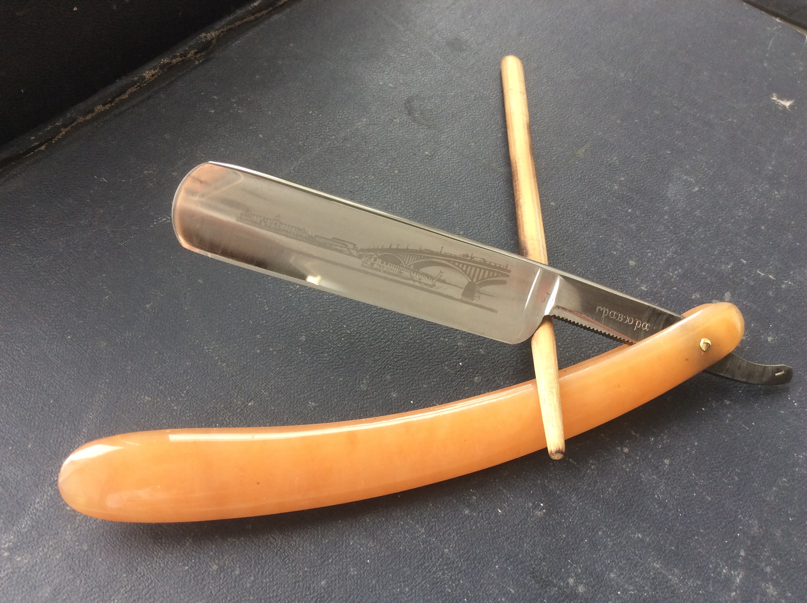 Самая "взрослая" бритва ориентировочно 1932-1934 года производства, с футляром, но без крышечки. С заводской заточкой, но со следами неправильного хранения.