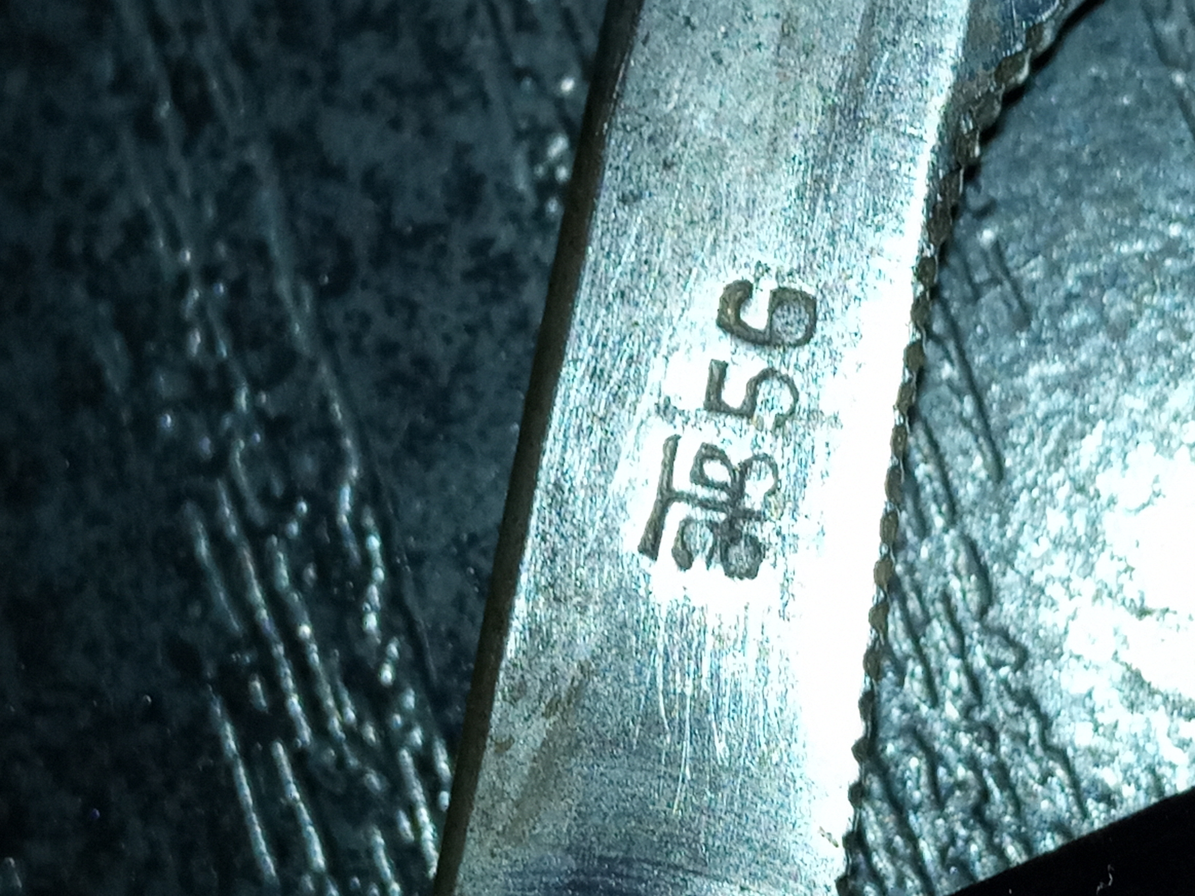Ручка,пины,форма лезвия.Напоминает какую нибудь Яхту.Но никаких надписей нет.Ничего такого гареме не встречал.