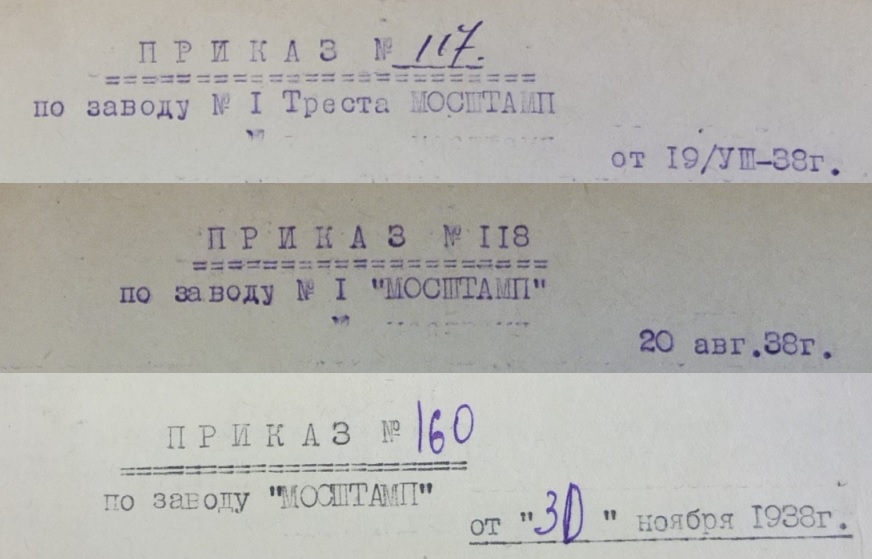 вот, что нашлось: Это шапки внутренних приказов по заводу №1. Содержание приказов не интересно, рабочие моменты. А вот изменения названия и даты очень даже. 19 августа 1938 года - завод №1 Треста "МОСШТАМП" 20 августа 1938 года - завод №1 "МОСШТАМП" 30 ноября 1938 года - завод "МОСШТАМП" Видно, что трест "Мосштамп" или ликвидировали 20 августа 1938 года или завод №1 вывели из этого треста. А вот приказ вышестоящей организации МГУМП (московское городское управление местной промышленностью):
