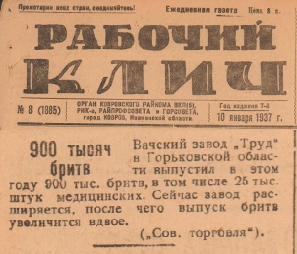 Газета Рабочий Клич, город Ковров, 10 января 1937 года.