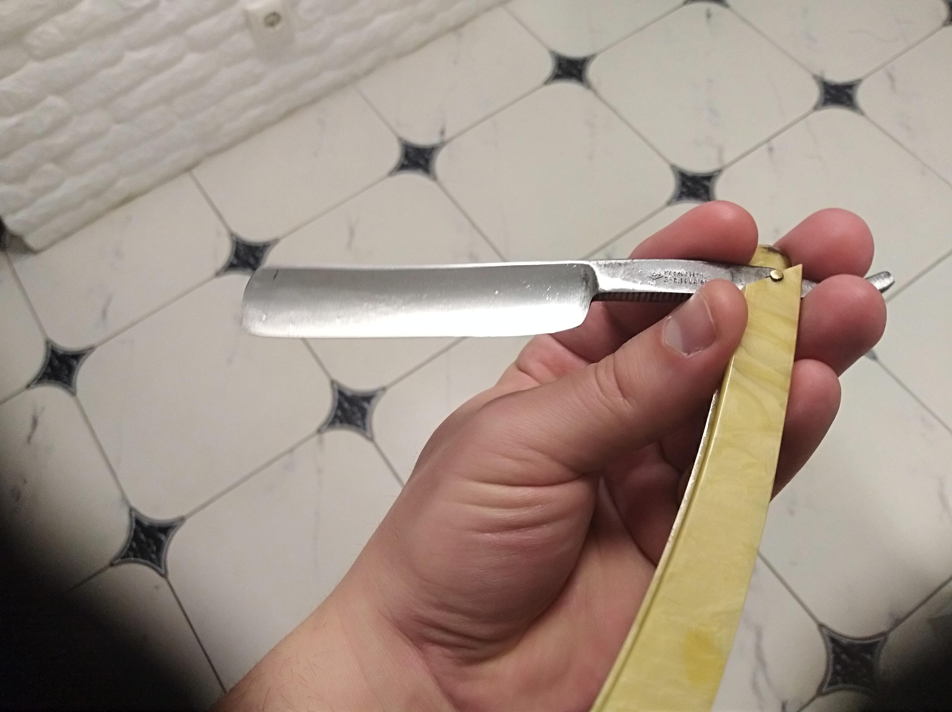 Здравствуйте. Прикупил вот такую бритву завода Труд. Судя по клейму 30-40-вые. Интересует ручка. Материал кость или рог, немного погрызана мышами.