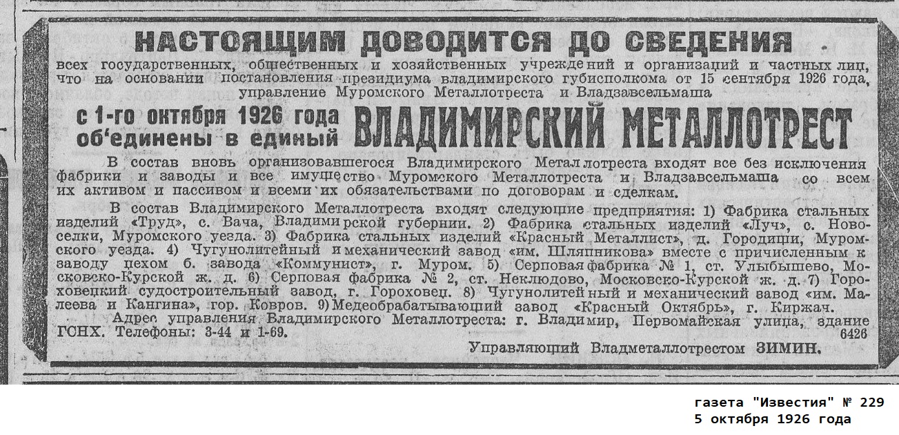 ПавмурметПеред созданием ПАВМУРМЕТа произошла еще одна реорганизация, точнее укрупнение. Во вновь!!! созданный 1 октября 1926 года Владимирский Металлотрест вошли все без исключения фабрики и заводы Муромского металлотреста.