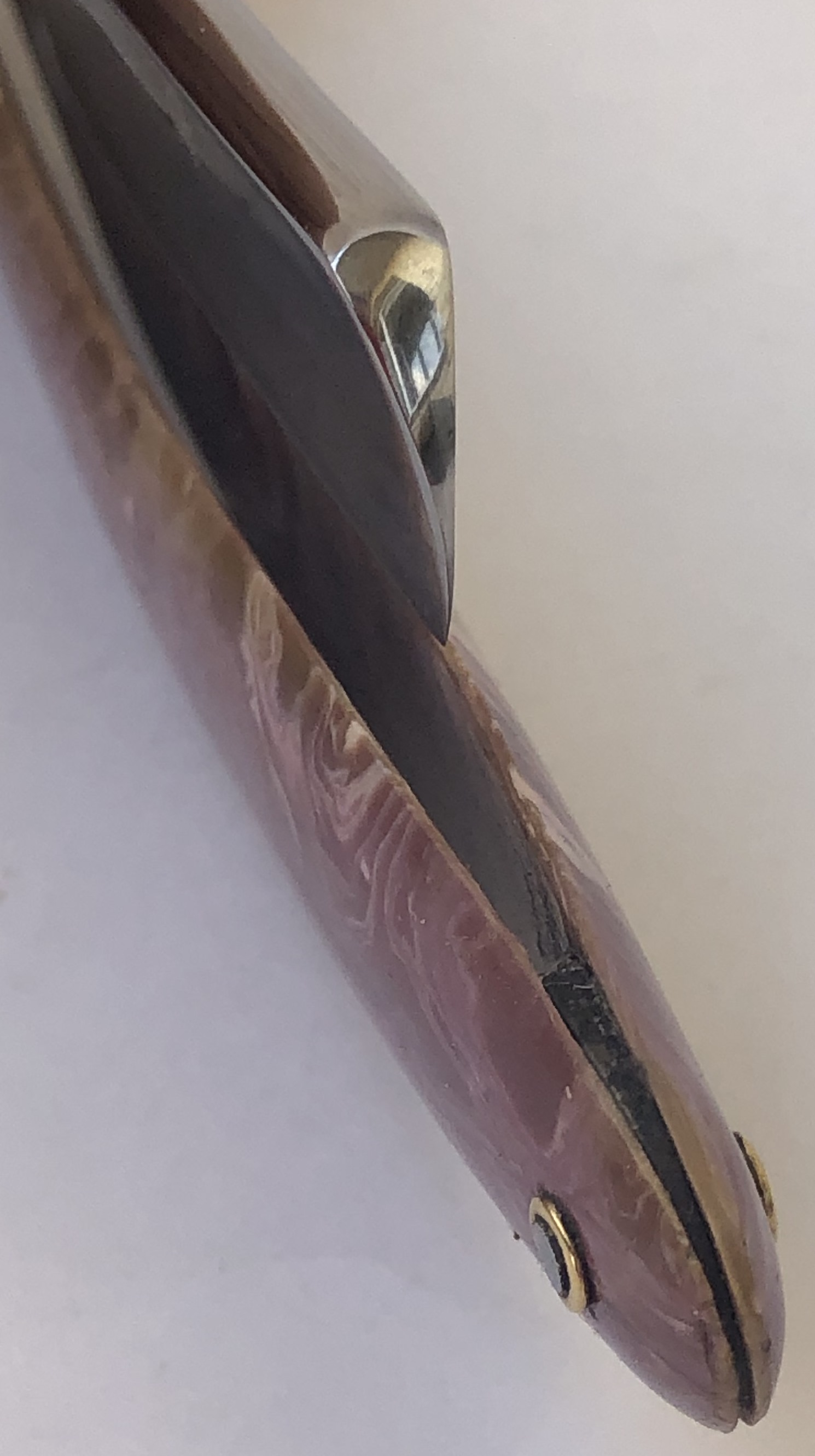 Получил вчера бритвочку *Арт.Бритва*.Убитая немного,но интересная.Клеймо такое еще не встречалось-модель 75.Год выпуска не указан,пластик на рукоятке светлый очень,даже какой-то розоватый.Стоит клеймо 2с.Предполагаю,второй сорт из-за замина на обушке сверху(как бы приплюснут)и эрль немного отклонен от лезвия с сторону,хотя само лезвие ровненькое,т.е.геометрия его вполне нормальная.Видно,что от пасты лезвие поуточилось местами,да и следы наждака обнаружил.Обух-4.1мм,длина клинка-7,3мм.Ширина:пятка-15,2мм,самое уточеное место-14.3мм,носик-14,7мм.Интересен еще и клинышек.он абсолютно прямой.бритва,по моему мнению,не разбиралась,пины родные,медь.Я сначала разобрал,не подумал сфотографировать в неразобраном виде.Потом дошло только.