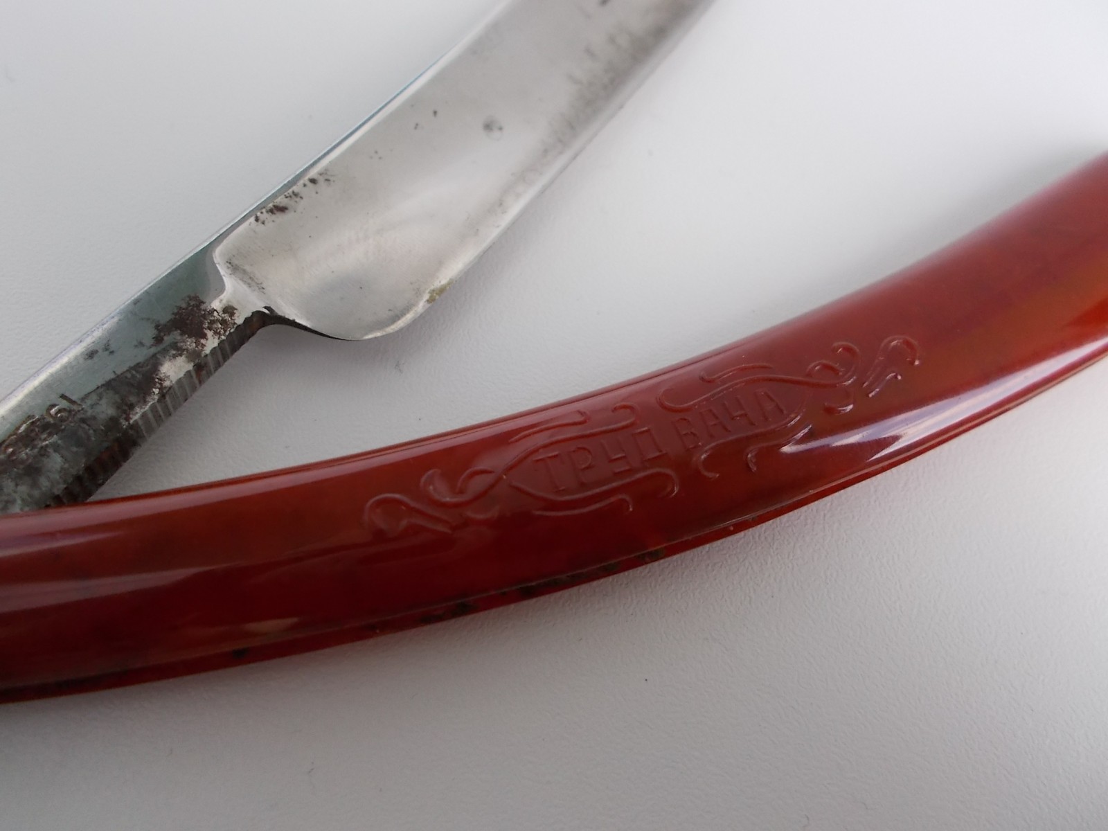 Вторая бритва в знакомой коробке г.Павлов на Оке, Горьковского края. Бритва вероятно номер 1102 из того же альбома. Незнаком для меня материал ручки. Чёрный, достаточно твёрдый материал, не уверен, что карболит.
