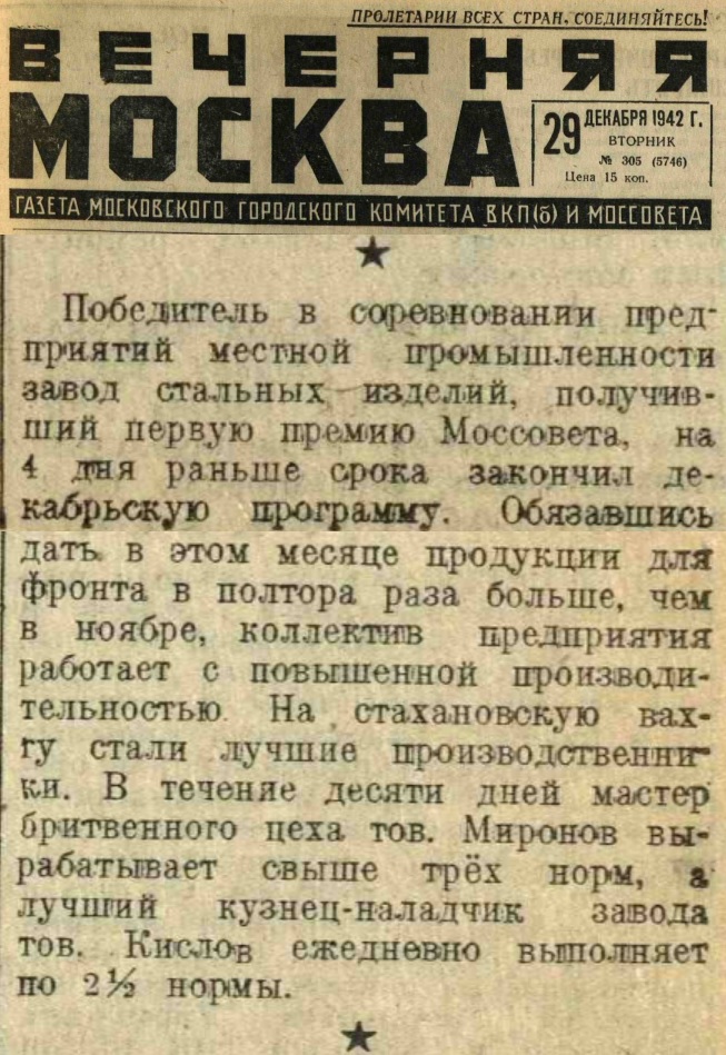 15 января 1952 года в газете "Вечеряя Москва" вышла большая статья о заводе Стальных Изделий.