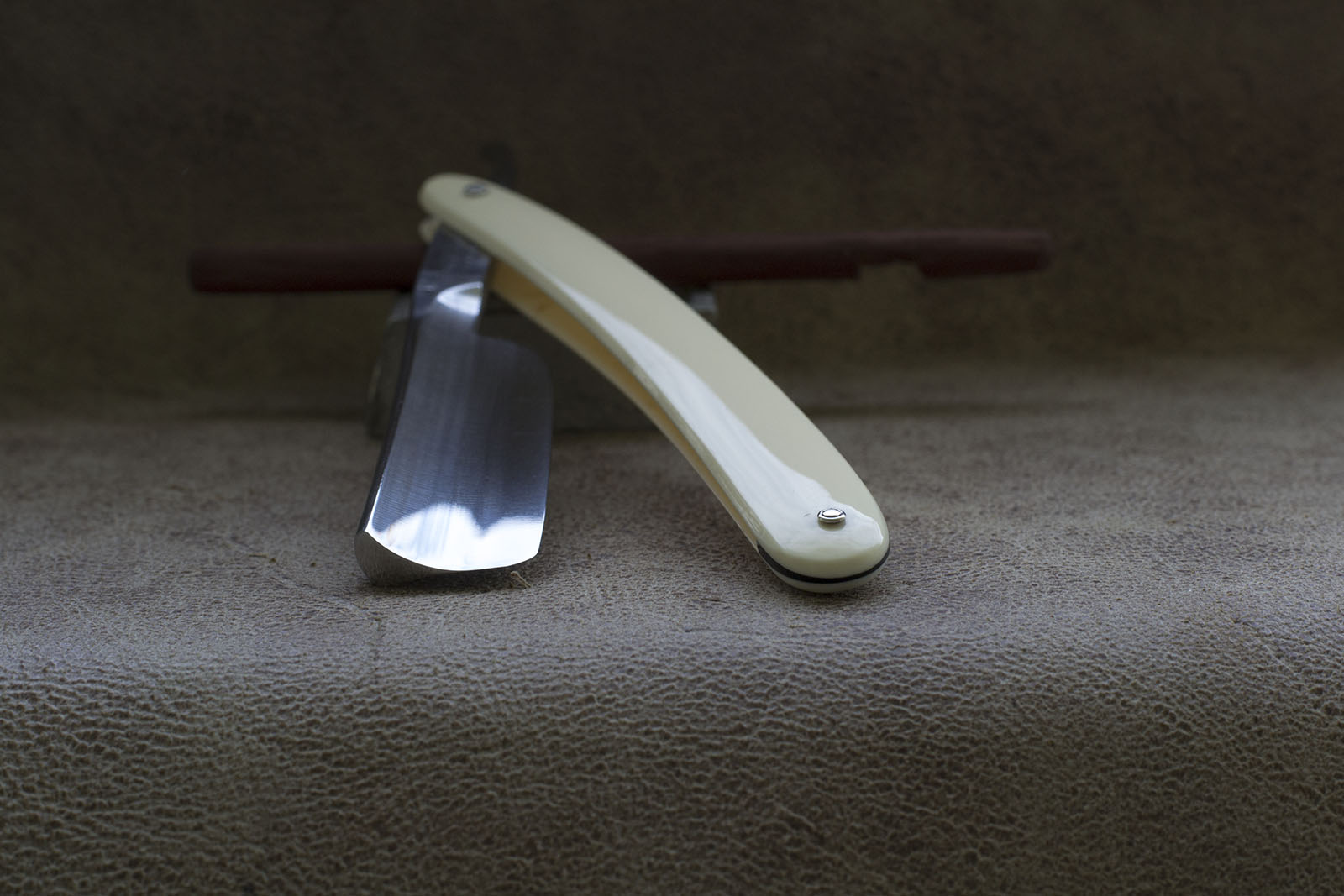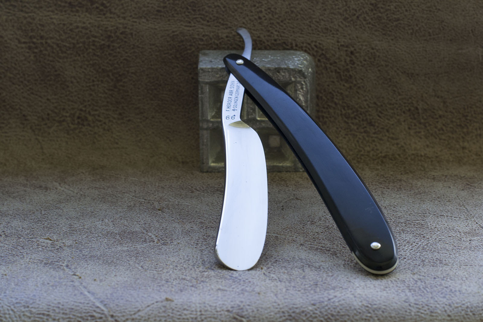 Немецкая опасная бритва из города Золинген, одной из самых знаменитых марок и известнейших фабрик. История ее создания восходит к первой половине 17 века. Данная модель Friedr Herder 112 изготовлена в первой половине 20 века, скорее всего до второй мировой войны. Находится в отличном состоянии и никогда не использовалась, несколько мелких пятен находятся минимум в 0.7 мм от режущей кромки и не несут какой либо угрозы. Удобная форма полотна. ширина 6/8, эбонитовая рукоять. Бритва заточена и подготовлена к бритью, идеальная геометрия, тонкая и равномерная фаска. Отличный выбор как для новичка, так и для искушенного пользователя. Продано Herder Show