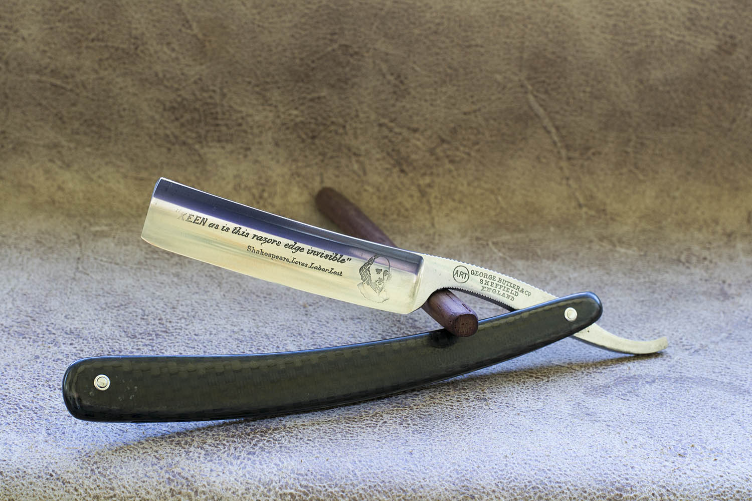 Старая английская бритва, конца 19 - начала 20 века. Ширина 5/8, полная вогнутость, новая рукоять из карбона. На полотне есть небольшие следы времени. Так же есть пара небольших пятнышек на рисунке Карбон в районе нижнего пина (видно на фото) Клинышек из олова. Бритва от достаточно известного производителя из Шеффилда, с самобытным травлением в виде бюстика Шекспира на полотне и двумя надписями "Keen on this razors edge are invisible" что в вольном переводе означает "Острие этих бритв невидимо или Бритвы с невидимым острием.." И действительно фаска от заточки очень тонкая и равномерная, что говорит о хорошей геометрии. Вторая надпись дает отсылку к одному из произведений Шекспира "Shakespeare. Loves Labor Lost" - Бесплодные усилия любви. Бритва заточена и готова к бритью, закрывется идеально по центру рукояти. Годится как для новичка, так и в коллекцию, носик слегка скруглен во избежание порезов. Продано. Spoiler Show