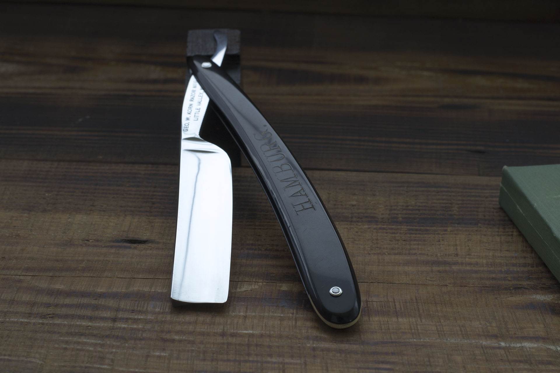 Опасная бритва начала 20 века, произведенная на предприятии Джорджа Уильяма Корна в Литл Вэлли, штат Нью-Йорк. Корн является довольно интересным и неординарным производителем, которому принадлежит ряд патентов в ножевом деле, а так же пара патентов на некоторые конструктивные особенности бритв. В частности на данном полотне применена технология American Double Hollow. По сути это хорошо известные бритвы с вогнутостью типа Bellied Hollow или "вогнутость с пупком" при которой на вогнутой части полотна бритвы отчетливо ощущается утолщение, полученное вследствие использования кругов двух разных диаметров при формировании вогнутости. Вещь действительно раннее известная и применяемая многими производителями, однако запатентовал ее именно Geo W. Corn. Так же к особенности полотна можно отнести его невероятную легкость и гибкость, бритва имеет очень тонкое и эластичное лезвие, которое может немного деформироваться при бритье, повторяя конутры лица. Об этом так же свидетельствует этикетка на коробке бритвы. Так же стоит упомянуть очень удобный эрль, отлично сидит в руке. Трудно сказать была ли бритва в использовании, я удалил коррозию с эрля, возможно туда просто попала влага, а вот кромка бритвы не была сведена окончательно, вероятно это заводская заточка, при которой лишь намечают режущую кромку не затачивая бритву до готовности. В комплекте так же родной футляр в состоянии нового. Ширина полотна 18 мм, родная рукоять из эбонита. Отлично подойдет для новичка. Заточена и готова к бритью. Продано Spoiler Show