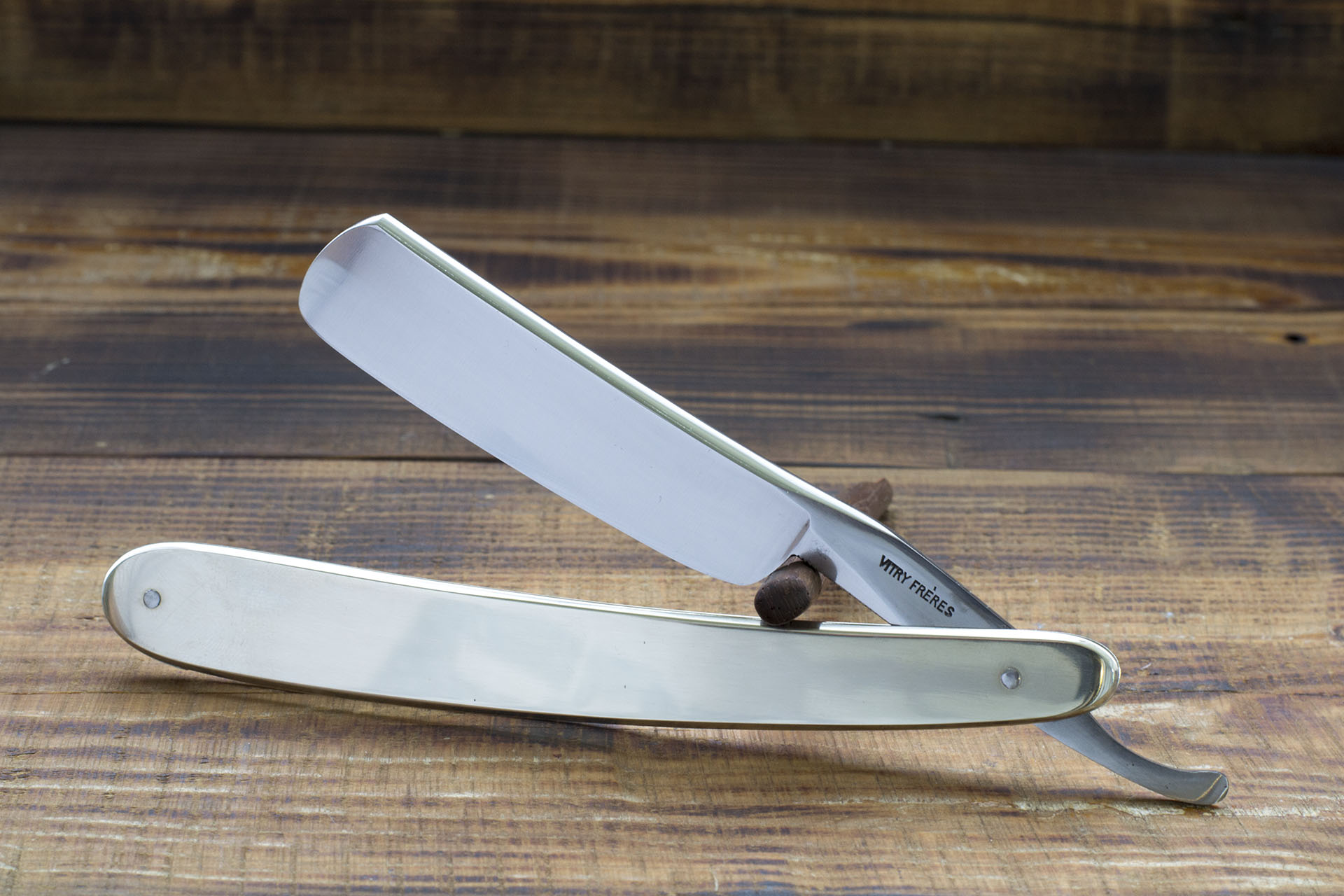 Французская опасная бритва от старого производителя, с более чем двухсотлетней историей. Интересен тот факт, что предприятие существует по сей день, продолжая торговлю различными инструментами для индустрии красоты. Но первоначально это было небольше предприятие, расположенное в одном из кузнечных центров Франции - городе Ножан, где в 1795 году, Братья Витри купили одно из разоренных революцией аббатств. К сожалению не особенно ясно чем занимались братья на ранних этапах своей деятельности, но я встречал их бритвы, которые можно датировать примерно 70- ми годами 19 века. Данный экземпляр, по заявлениям предыдущего владельца был частью укладки врачей Красного Креста во времена Второй Мировой Войны, что в общем очень похоже на правду. Рукоять бритвы изготовлена из нержавеющей стали, она довольно массивна, но все же намного более легкая чем всем известная рукоять медицинской Вачи, что оставляет возможность вполне удобно пользоваться данной бритвой по прямому назначению. Оправа при желании может быть заменена на классическую роговую. Сам клинок имеет все черты классической французской бритвы, отличная геометрия полотна, сталь несколько более твердая чем на клинах 70-80 гг 19 века, но это должно дать существенный прирост устойчивости для режущей кромки. Ширина полотна 20 мм. Бритва заточена и готова к бритью. Продано Vitry Freres Show