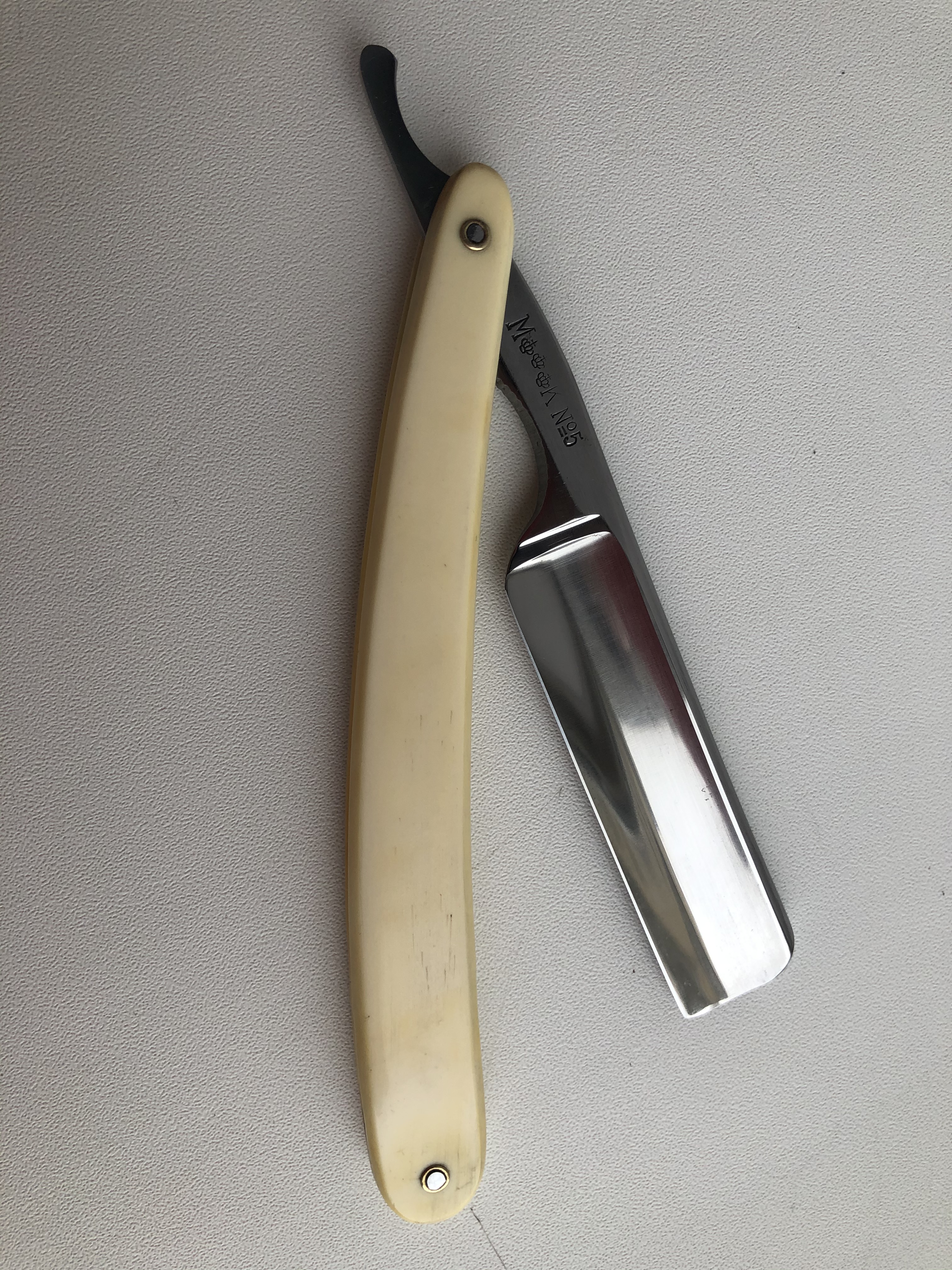 Как по мне, так очень красивая и практичная бритва. Тяжёлая,и удобная для пользования. Разобрал, немного освежил металл и снова собрал, поставив родные пины.Немного патины оставил на лицевой стороне клинка, чтобы не только оставить гравировку, но и сохранить оригинальный "налет старины"Идеальная геометрия полотна, сталь чистая, без дефектов.Бритва заточена и готова к бритью.Подойдет любому товарищу, интересующемуся бритьё клинковой бритвы:как новичку, так и опытному пользователю.