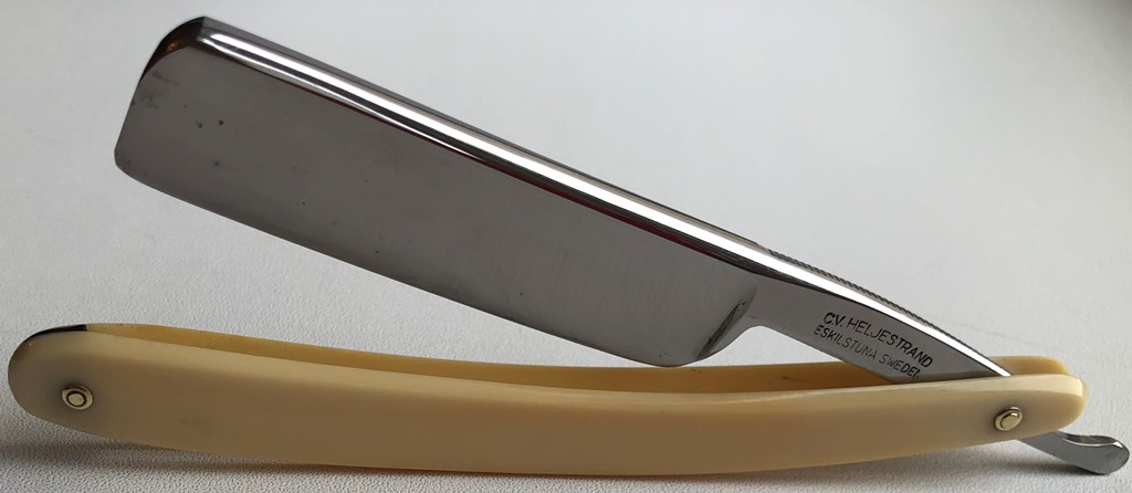 C.V.HELJESTRAND-ESKILSTUNA-SWEDEN модель 42 "три короны". Ширина полотна-20 мм Толщина обушка-6 мм Форма лезвия-1/2 клина Углеродистая сталь. Бритва периода 50-60-х годов 20-го столетия. Совершенно непользованный клинок, в прекрасном , оригинальном состоянии:шлифовка, полировка и ширина полотна-всё заводское. Бритва не точилась до меня . Заточена , с использованием одного слоя изоленты, дабы сохранить родной сохран.Поменял пины на более надёжные, немецкие втулки, с добавлением внутренних шайб.Тяжёлая и красивая бритва.Идеальная геометрия клинка:кромочка практически незаметна.Заточена и готова к бритью. Не пропустите ! Цена-10500 р с доставкой. ПРОДАН Внимание! Важная информация! Spoiler Show
