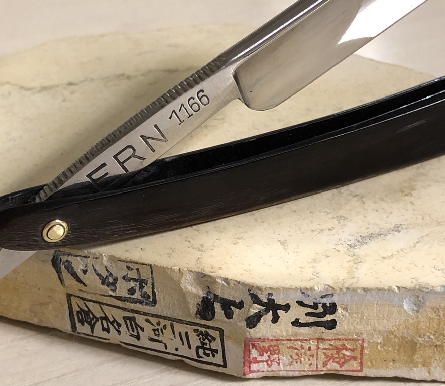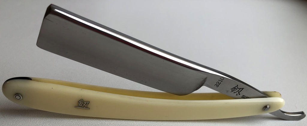 (Один из трех вариантов написания иероглифа 剣/劒/剱, Кэн( Цуруги), "меч". Спасибо уважаемому Игорю Ашмарину, ака INSUI , за перевод,) Ширина полотна-21.5 мм Толщина обушка-6.5 мм Углеродистая высококачественная сталь. Полная вогнутость. Бритва в прекрасном состоянии, без следов пользования. Пришлось разобрать бритву и перебрать осевой пин, с сохранением оригинальных частей.Красивая бритва, по японски аскетичная, но с отличной,"звенящей" сталью. Идеальная геометрия полотна:кромочка равномерна по всей длине и еле заметна. Сталь и кромка чистые, без видимых дефектов.За счет толстого обушка,бритва достаточно тяжёлая.Сталь средней твердости.После заточки бритва лично была протестирована. Бритьё мягкое и чистое, без нареканий.После бритья недельной щетины кромка легко проходила тест на рез волоса, без правки на ремне. Пластиковая коробочка в цвет оправы бритвы. Цена 10500 р с доставкой. ПРОДАН Spoiler Show