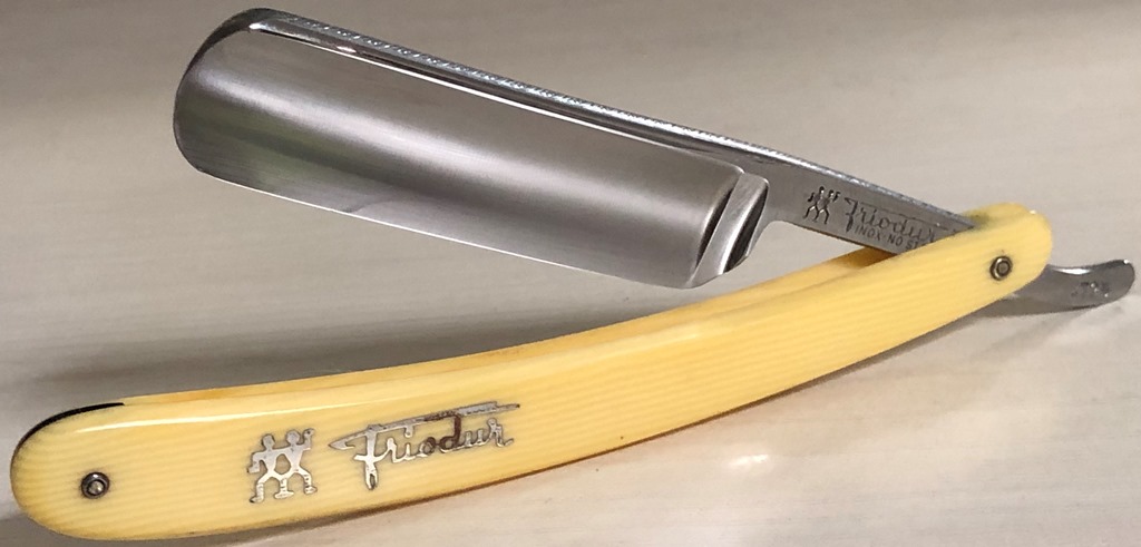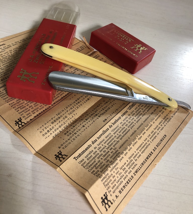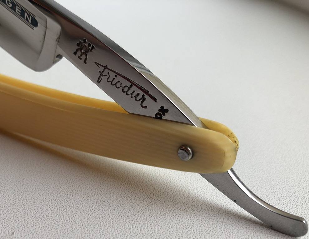 Все 4 бритвы разных моделей, в состоянии идеальное или близкое к идеальному... Непользованный J.A.HENCKELS.SOLINGEN ZWILLINGSWERK модель 72 Ширина полотна-20 мм Толщина обушка-5.8 мм Полная вогнутость. Сталь условно нержавеющая-FRIODUR INOX Бритва не разбиралась и не ремонтировалась, не имеет следов пользования.Заводская шлифовка и полировка. Полотно без царапин, следов окисления и других дефектов.(немного сошла синяя краска с букв на полотне, но это не принципиально).Идеальная геометрия клинка:кромочка равномерна по всей длине и еле заметна.Заточена и готова к бритью. Цена-9500 р с доставкой. ПРОДАН Spoiler Show