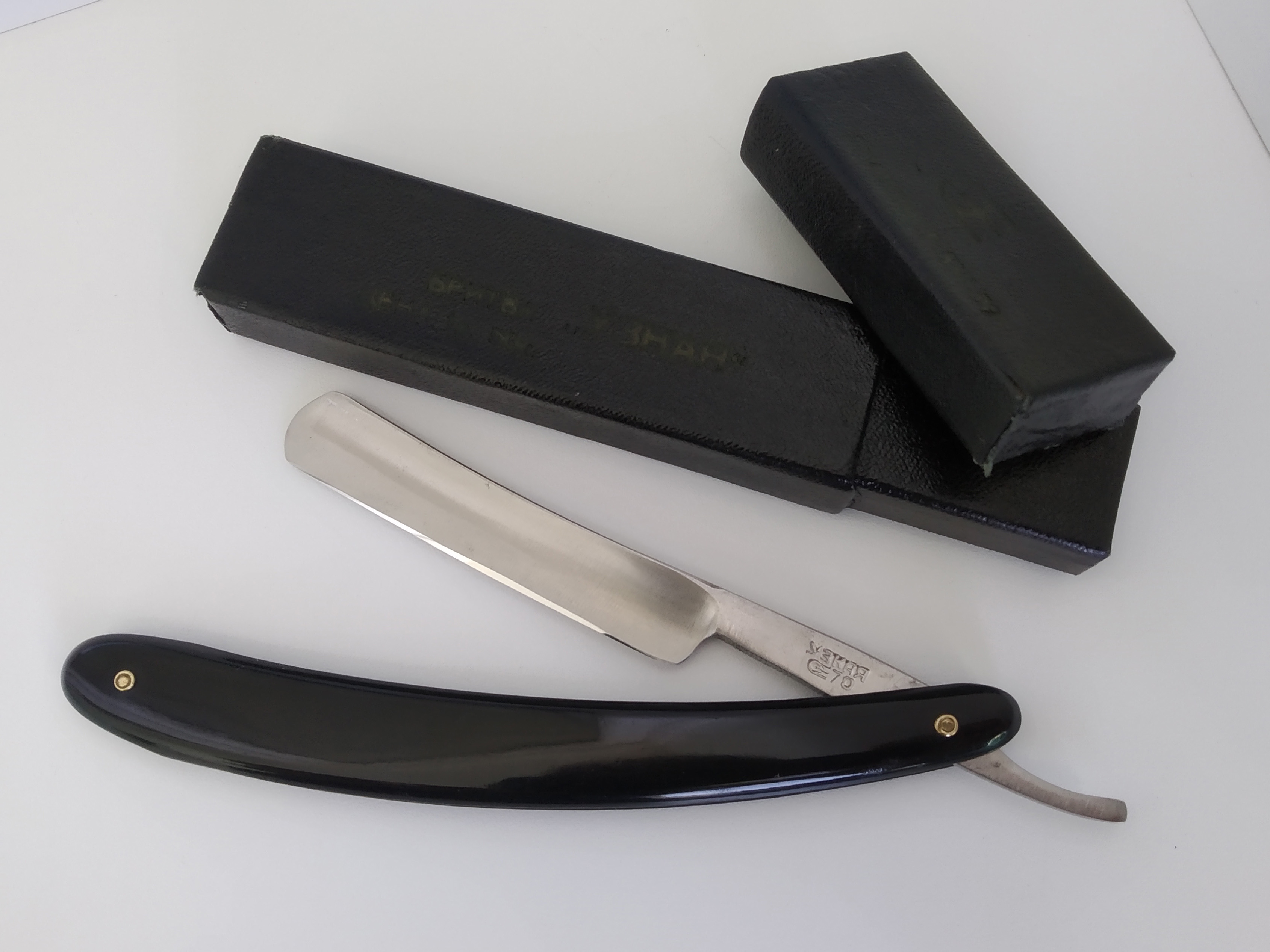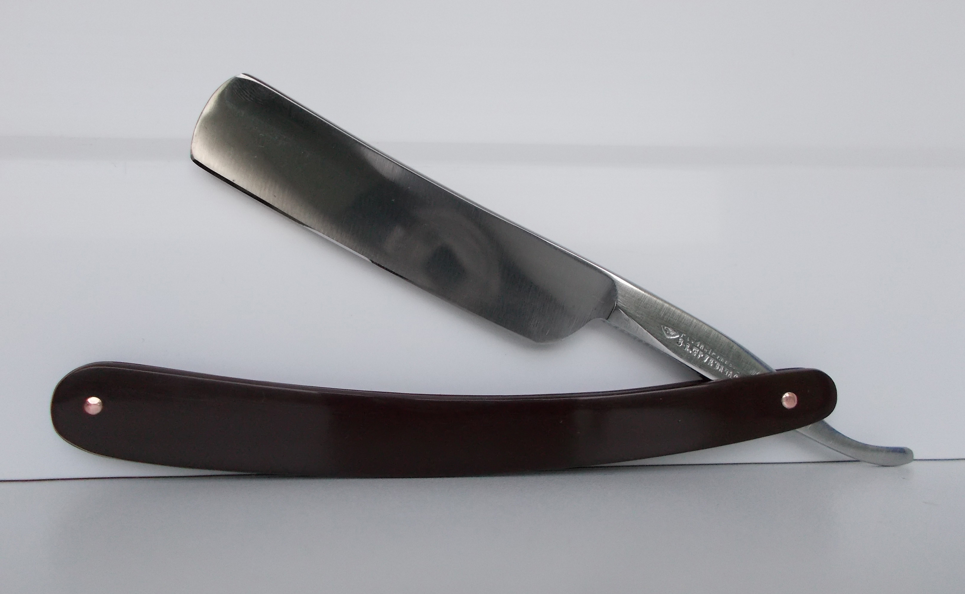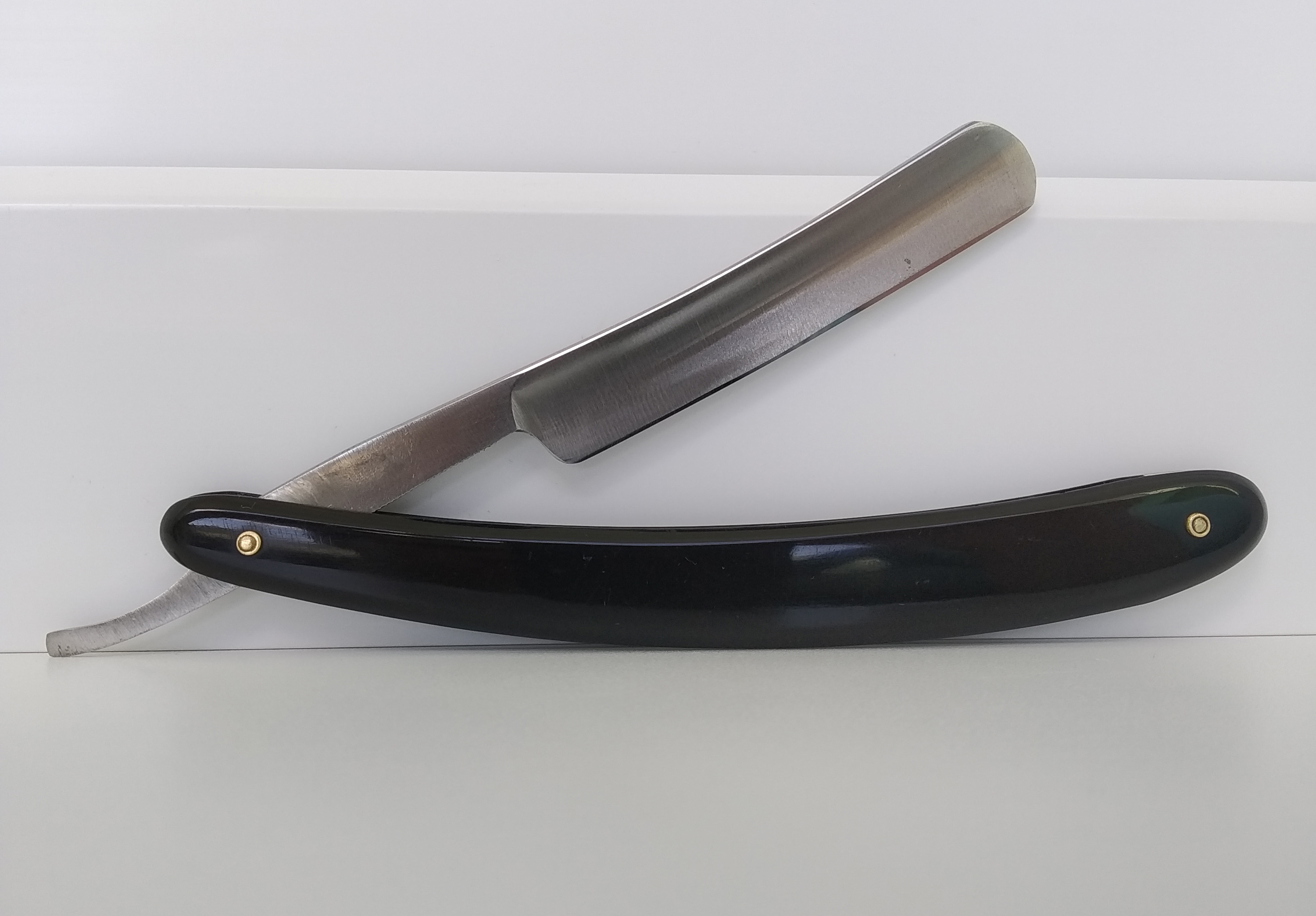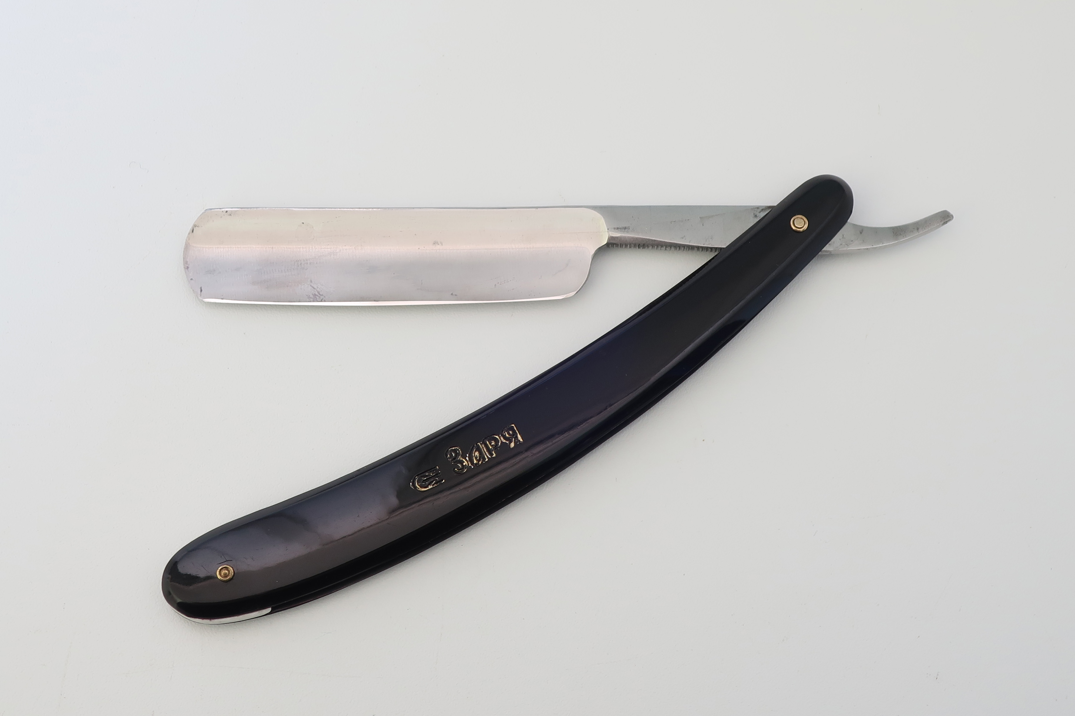 Продам опасную бритву Erik Anton Berg, город Eskilstuna, Sweden. Бритва после ремонта и реставрации, в очень хорошем сохране. Бритва разбиралась, прошла очистку, полировку, собрана с оригинальными заклепками. После сборки клинок в оправе сидит плотно, по-центру, не болтается. Лезвие без дефектов и ржавчины. Ширина полотна - заводские 9/16 (14,3 мм). Полная вогнутость, тончайшее сведение, кромка узкая и равномерная по всей длине. Бритва заточена и готова к использованию. Отправляю почтой, пересыл оплачивается отдельно, по России от 100 до 200 руб. Цена - ПРОДАНО Еще фото Spoiler Show