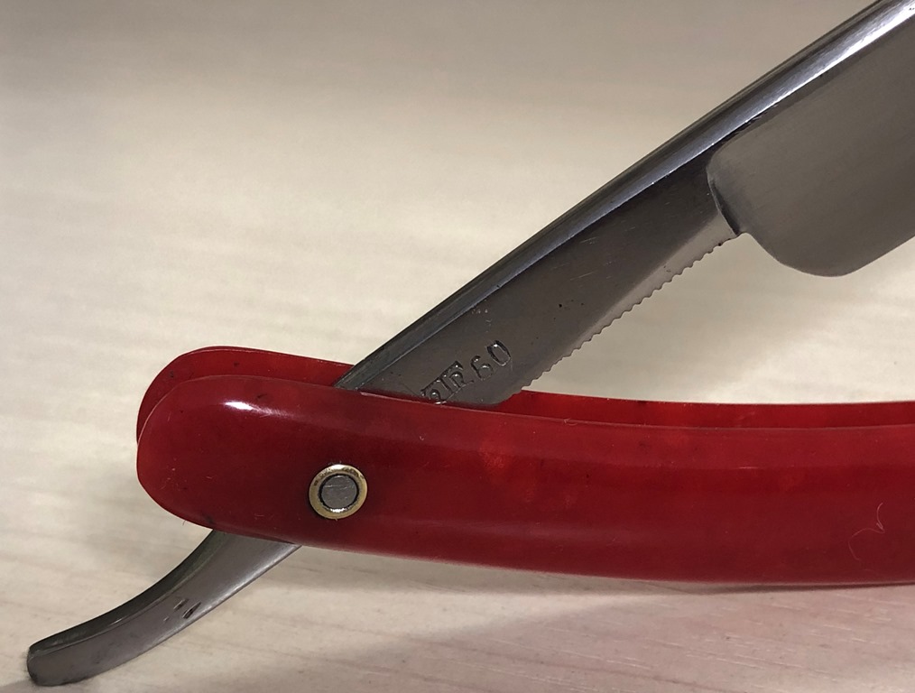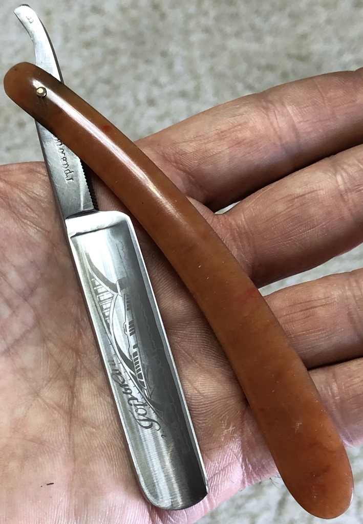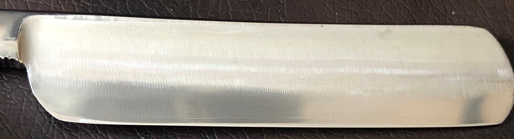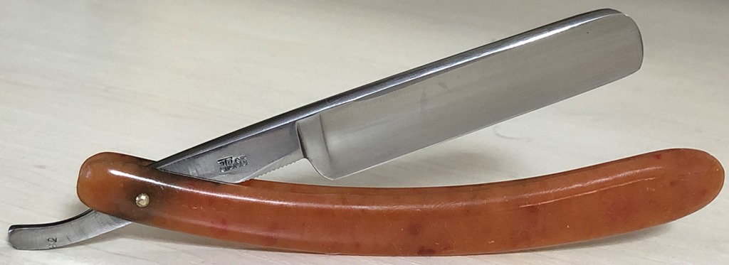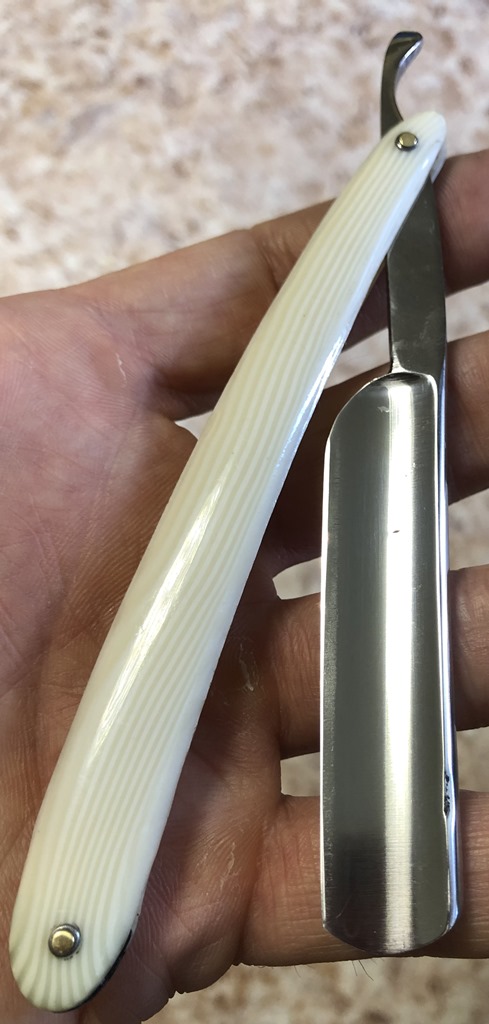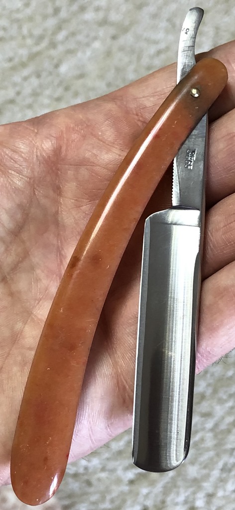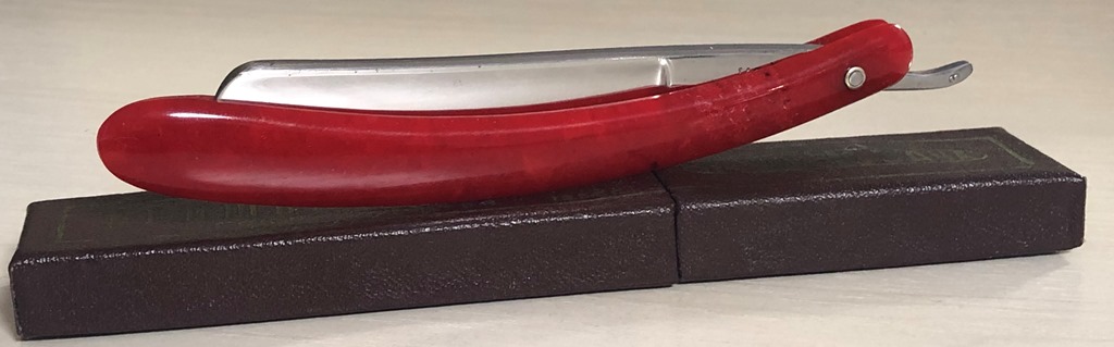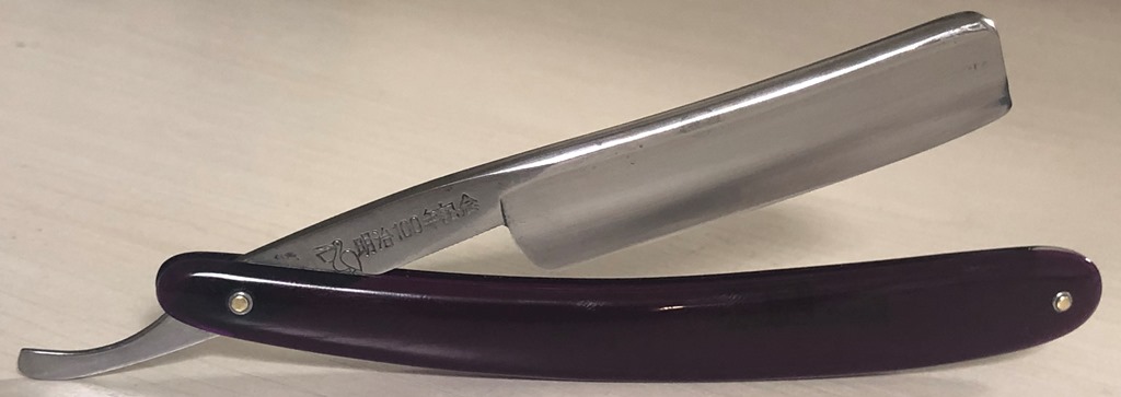 Очень долго лежали у меня две бритвы,на которые я совершенно не обращал внимания, по причине того, что чисто интуитивно они мне не понравились, а визуально сталь клинков показалась мне какой то странной. Но, недавно решил ими заняться и, честно скажу, в этот раз опыт и интуиция меня подвели. Помимо того, что обе бритвы были совершенно непользованными,но со "следами времени", то и сталь прекрасно точилась, доводилась на тонких натуральных абразивах, естественно с прохождением всевозможных тестов. Но, самое главное, первое бритье превзошло все мои ожидания. (обычно, когда у меня есть вопросы и сомнения по поводу той или иной бритвы, то после заточки, на момент бритья, беру с собой ещё одну проверенную бритву,чтобы нормально завершить процесс и не мучить себя некачественным бритьём).Бритье показалось близкое к эталонному, без каких либо неудобств, раздражений и прочих неприятных ощущений. К тому же, сама бритва имеет средний размер и по многим показателям идеально подойдет для новичка,ну а для опытного товарища вообще говорить не приходится. Так как первая бритва так и не дошла до моей темы продаж и была сразу продана, то представлю второй экземпляр.