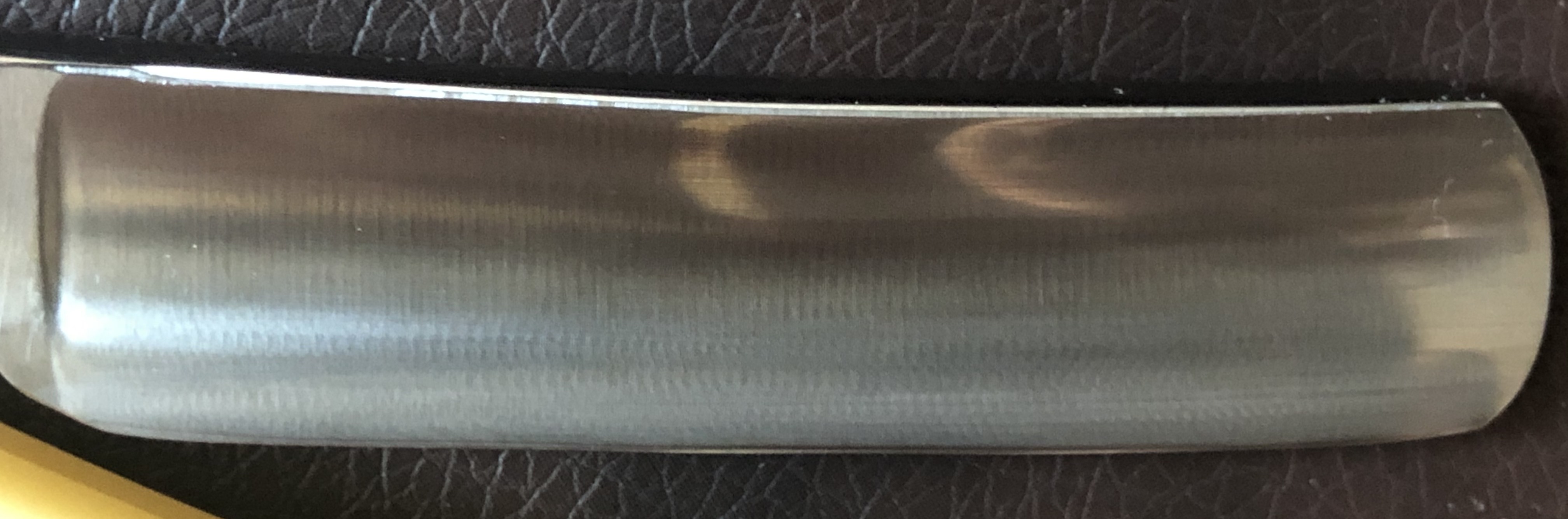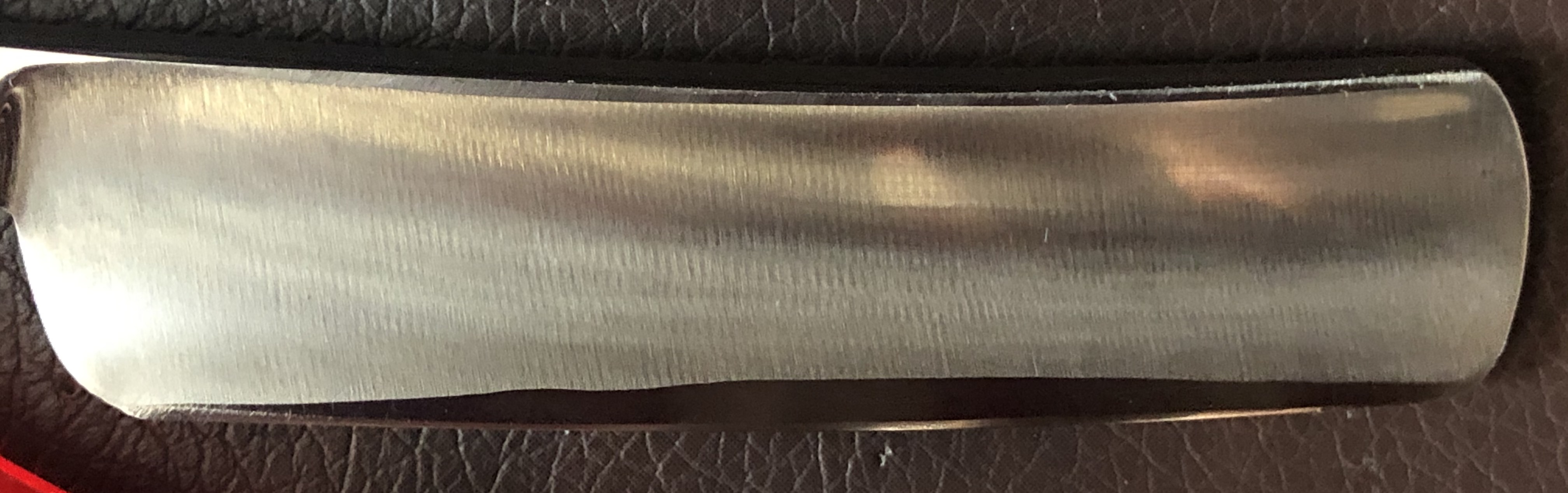 Бритва находится в состоянии близком к идеальному. Была перебрана, с освежением клинка от патины и других дефектов,но с максимальным сохранением оригинального "заводского" состояния бритвы. Имеется ввиду,что лицевая сторона URA имеет оригинальную поперечную шлифовку. Тут я ничего не делал. Все осталось так, как вышло с завода. Обратная сторона-OMOTE изначально имела продольный гринд, но не от шабера, а от ручной (достаточно грубой)шлифовки и полировки. Поэтому я также эту сторону попытался отшлифовать вручную ,на камнях, и далее немного отполировать.(Шлифовку закончил на камне 3000, не стал делать "зеркало", так как это было бы неправильно). Район эрля имел также достаточно грубый гринд, что я тоже сохранил.Сталь чистая, без видимых дефектов. Кромочка равномерна по всей длине. Тяжёлая. Хоть бритва и была ранее в пользовании, но состояние очень хорошее, без каких либо замечаний. Укороченный клинок также способен добиваться более чистого бритья в труднодоступных местах лица. Будет отличным и достаточно недорогим вариантом для тех, кто желает попробовать альтернативную форму клинка в деле.Заточена и готова к бритью.