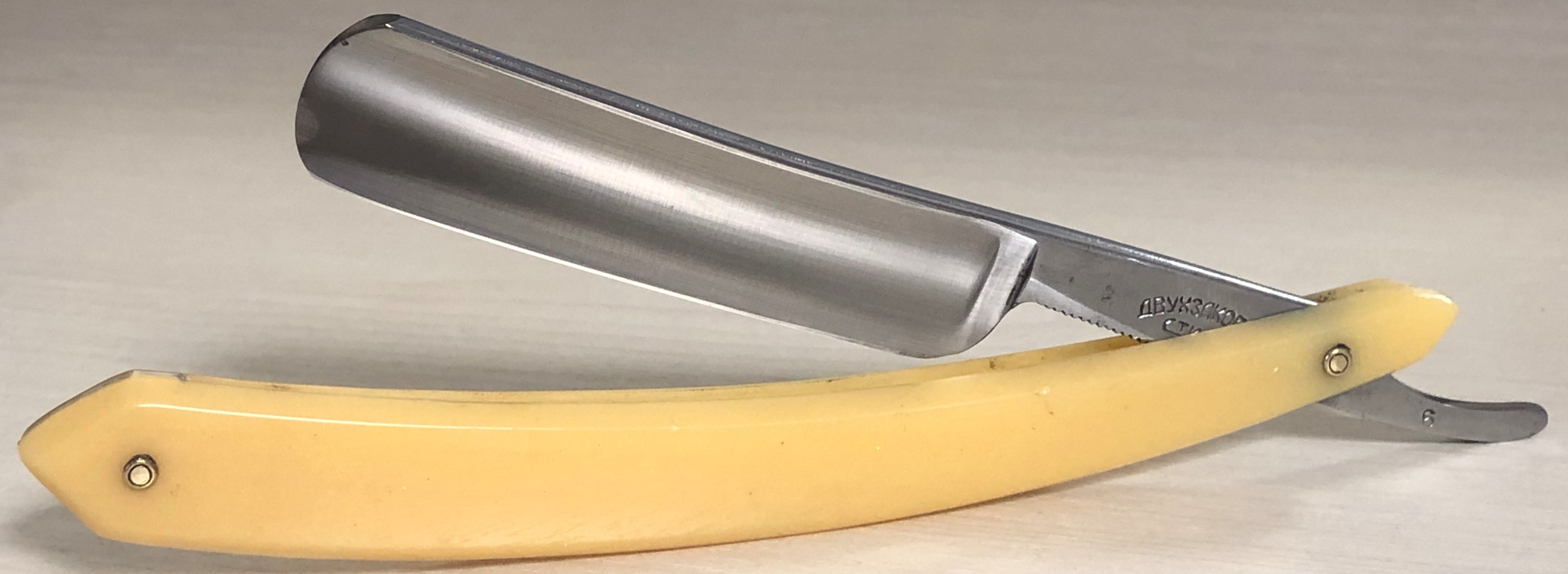 Бритва сталинских лет, в очень хорошем состоянии.Практически непользованная, возможно и вовсе не была в деле.(по крайней мере обушок не имел следов износа).Разобрал, почистил клинок, убрал небольшой скольчик с полотна и снова собрал, добавив внутренние шайбы и заменив пины.Оригинальный гринд полотна также попробовал повторить.Сталь чистая, без видимых и критичных дефектов. Идеальная геометрия:кромочка равномерна по всей длине.Коробочка стизовская тоже, но только от "особой".Заточена и готова к бритью.Относительно недорогой, но очень приятный экземпляр не только для новичка, но и для любого бритвомана.