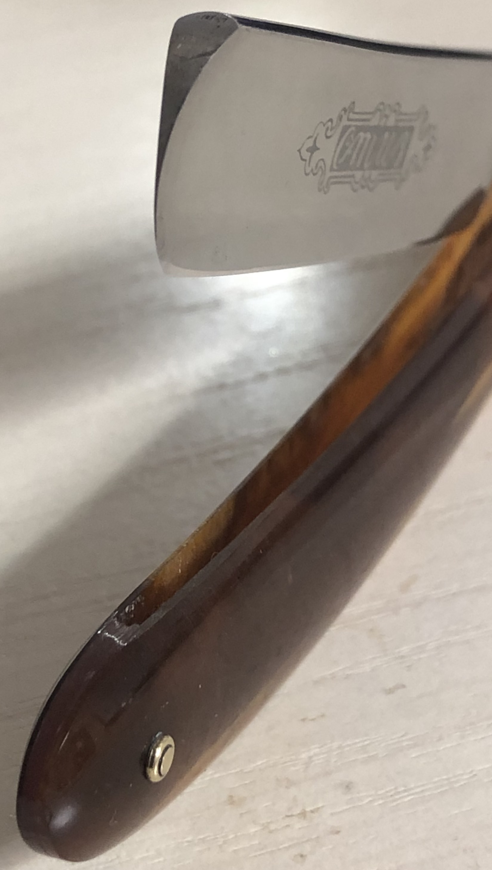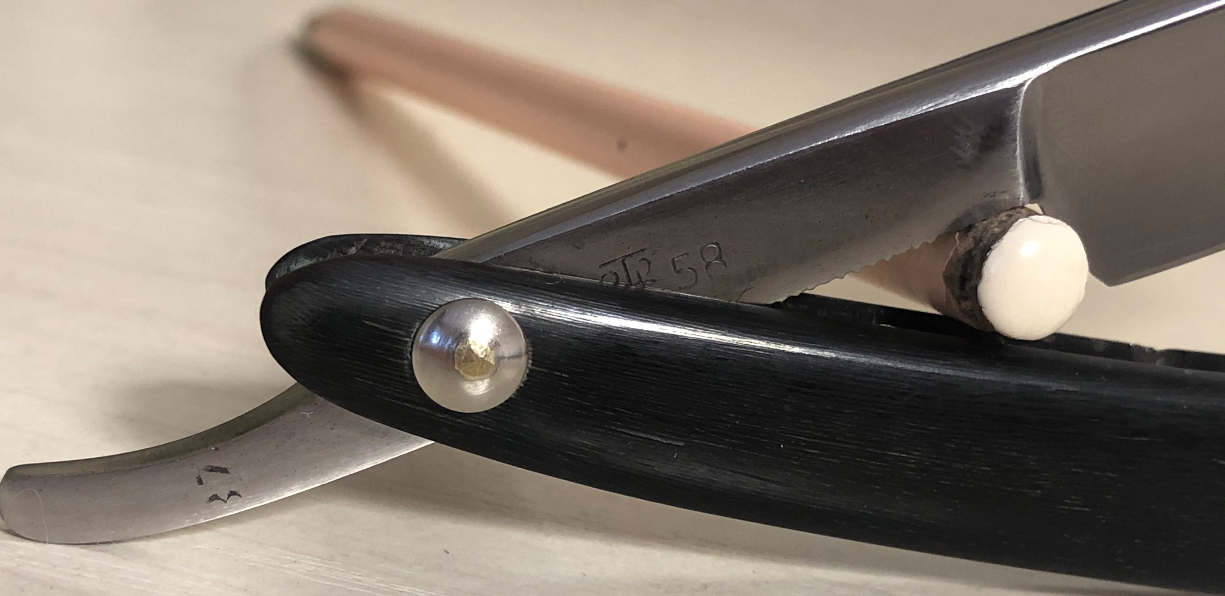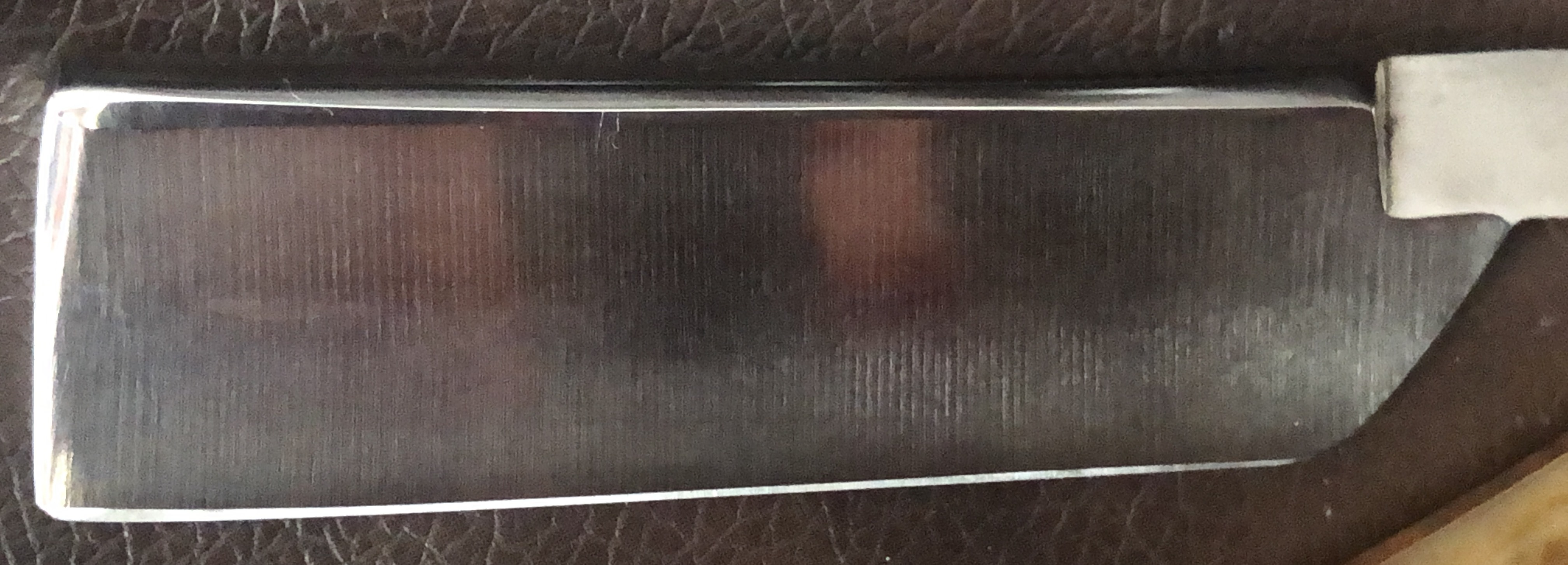 Клинок в очень хорошем состоянии.Немного исправил "обратную улыбку", почистил ,восстановил оригинальный гринд,в меру своих возможностей и отполировал.Касаемо оправы...Роговая, натуральная ручка ,древняя,от французского донора 19-го века.(Немного длинновата, конечно, но в любом случае лучше, чем какой то заводской пластик. ) Так как на оправе имелись довольно большие отверстия под пины, то мною было принято решение поставить именно такие шайбы, возможно крупные,зато надёжные.Сталь чистая, без видимых дефектов. Идеальная геометрия клинка:кромочка равномерна по всей длине.Бритва получилась немного тяжелее, по сравнению с бритвой в оригинальном исполнении.В любом случае,бритва приятна во всех отношениях. Брить должна неплохо. Заточена и готова к бритью.