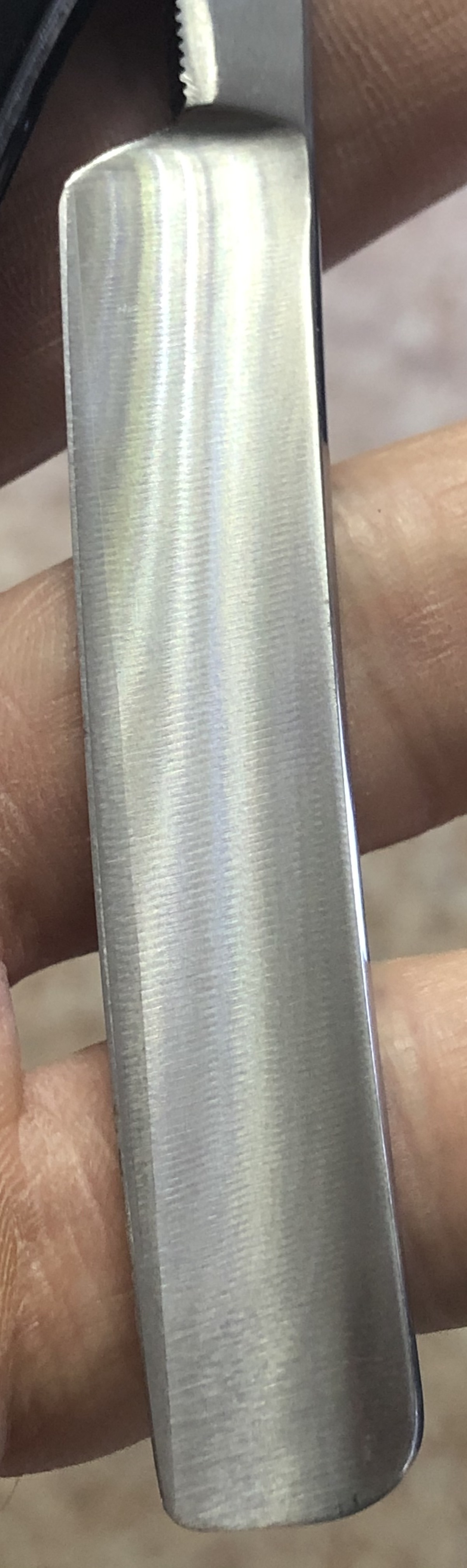Идеальная геометрия клинка:кромочка равномерна по всей длине и еле заметна. Отличная "звонкая" сталь способна выдавать мягкое и чистое бритьё.Заточена и готова к бритью.