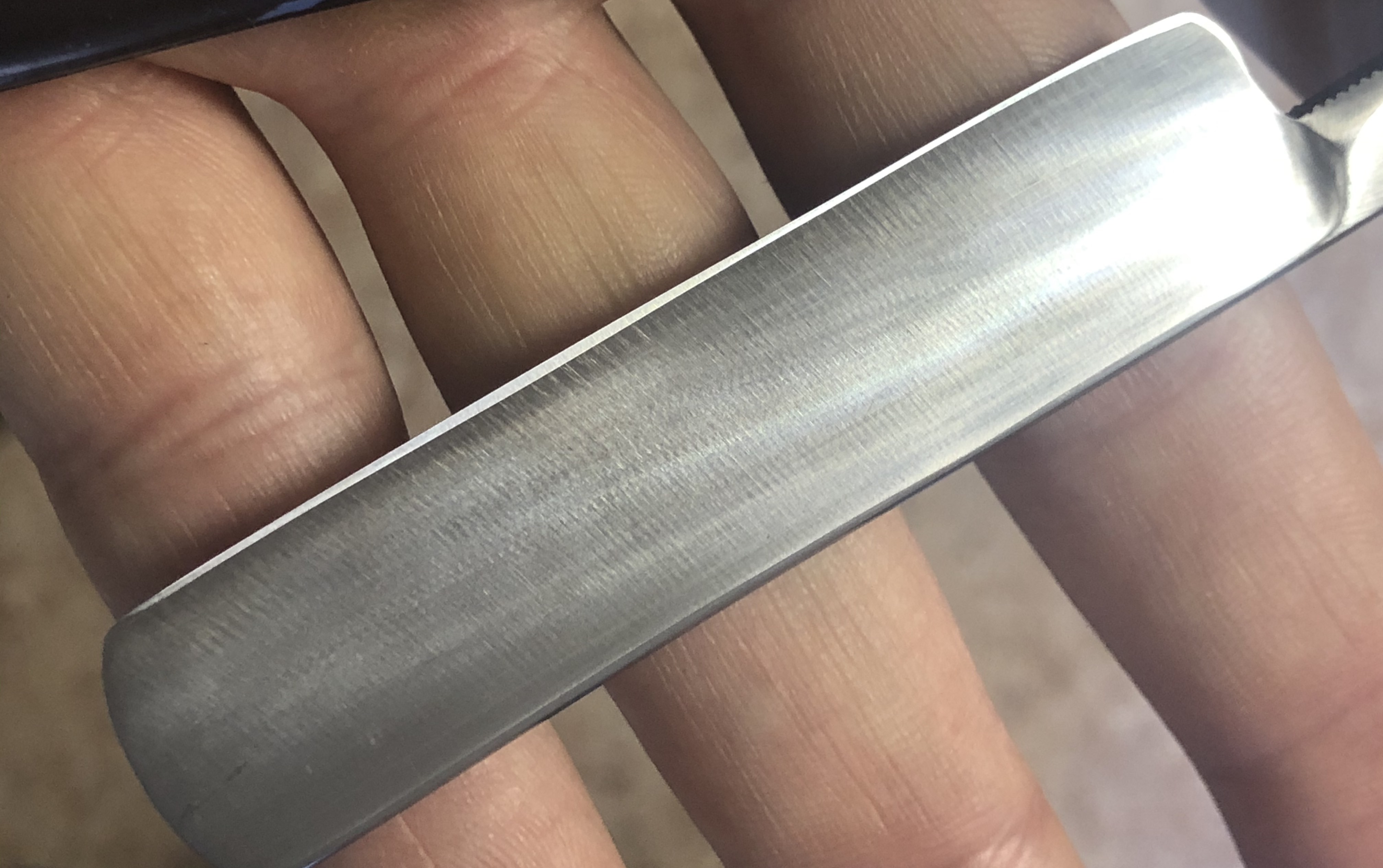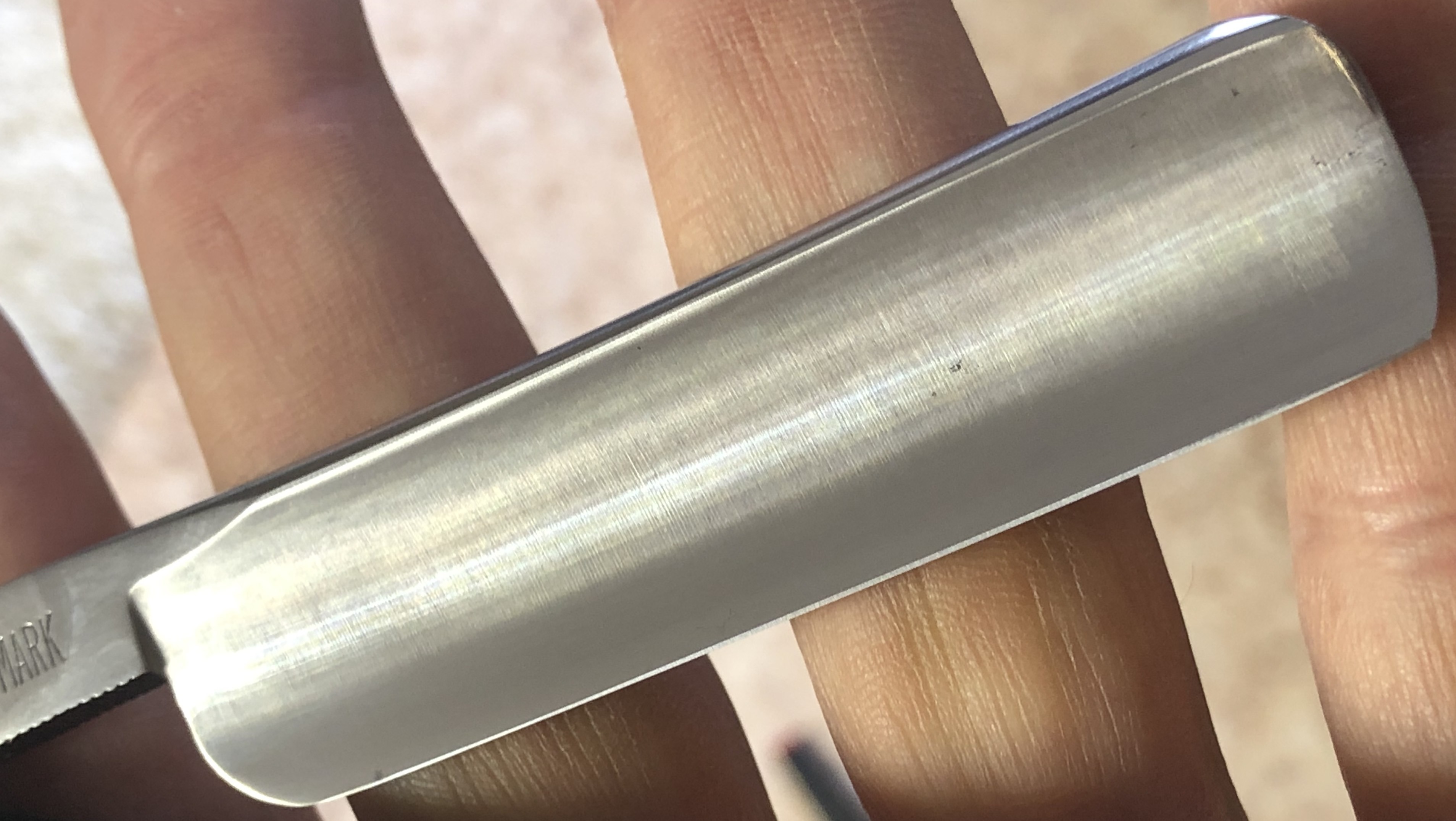 Ширина полотна-20 мм Толщина обушка-6.5 мм Углеродистая сталь. Форма лезвия-1/2 клин Примерно 50-60-е годы . Весьма приятная бритва во всех отношениях. Разобрал,почистил, отполировал и снова собрал, заменив пины на немецкие втулки.Снова не стал идти легким путем и шлифовал клинок на камнях, вручную.Долго, муторно, но получаешь удовольствие от процесса, заодно всегда можно проконтролировать то, что делаешь , чтобы не убрать лишнего и не перегреть с дуру металл..Ясное дело, что задачи не стояло получить идеальное зеркало, как это можно увидеть на множестве новодельных бритв:заплывшее от полироли зеркало. Тут скорее умеренный, легкий продольный сатин, хотя под другим углом ,если смотреть, то отражение очень хорошее.Приятный голубоватый оттенок от ручной шлифовки и полировки. Короче, достаточно красивая, практичная, удобная и недорогая бритва. Сталь не имеет визуальных дефектов, геометрия на уровне.Не пропустите рабочий инструмент за вменяемые деньги. Заточена и готова к бритью. Цена-6500 р с доставкой.ПРОДАН Внимание! Важная информация! Spoiler Show