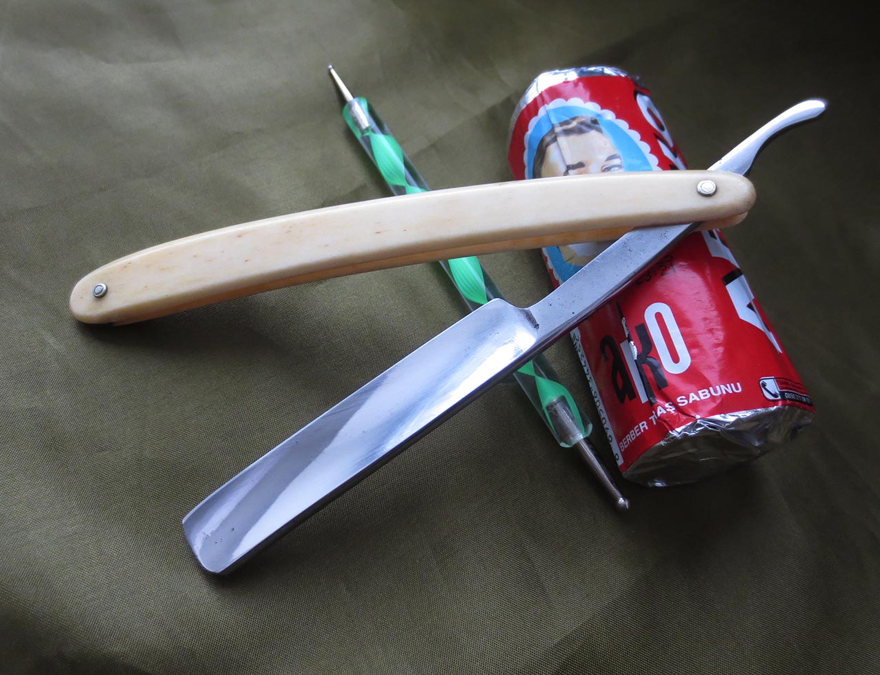 Ориентировочно - 50-60 годы, углеродистая сталь, ширина клинка - 6/8 дюйма, заклёпки - латунь. Вместо старой, хотя и годной оправы, была изготовлена новая, из американского киринита цвета "Desert Camo" от чего внешний вид бритвы только выиграл. Инструмент заточен на японских водных камнях, направлен, продезинфицирован и полностью готов к работе сразу после покупки, купил и брейся. Очень достойный вариант не только для новичка, но и для бывалого пользователя. Также всегда в продаже ремни для правки из натуральной полированной кожи растительного дубления и при покупке бритвы и ремня почтовые расходы по России за мой счёт. Начинающим подскажу и покажу, как пользоваться и ухаживать за инструментом. Цена - 8250 рублей.
