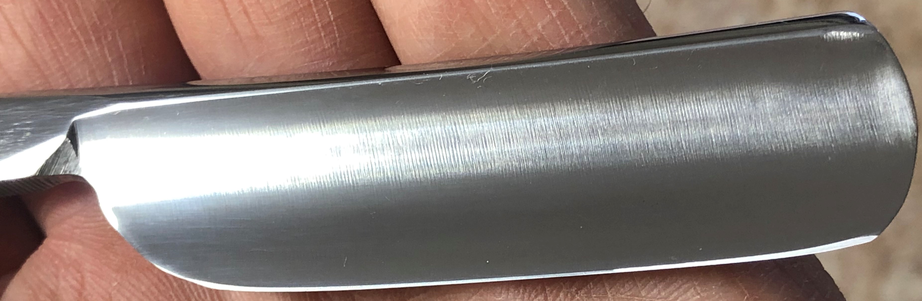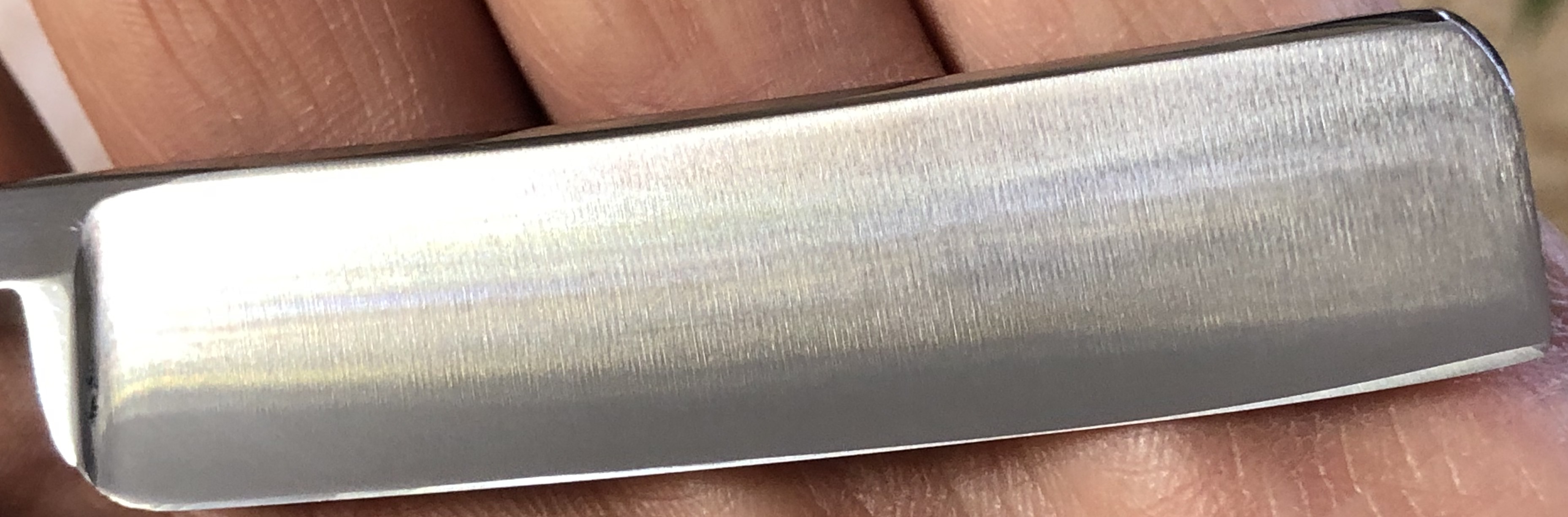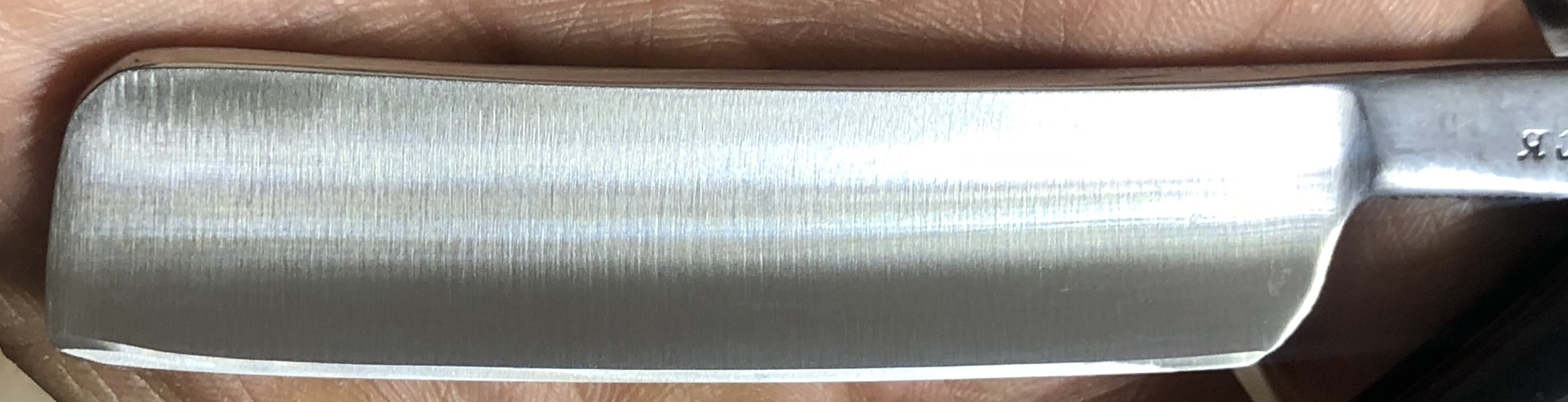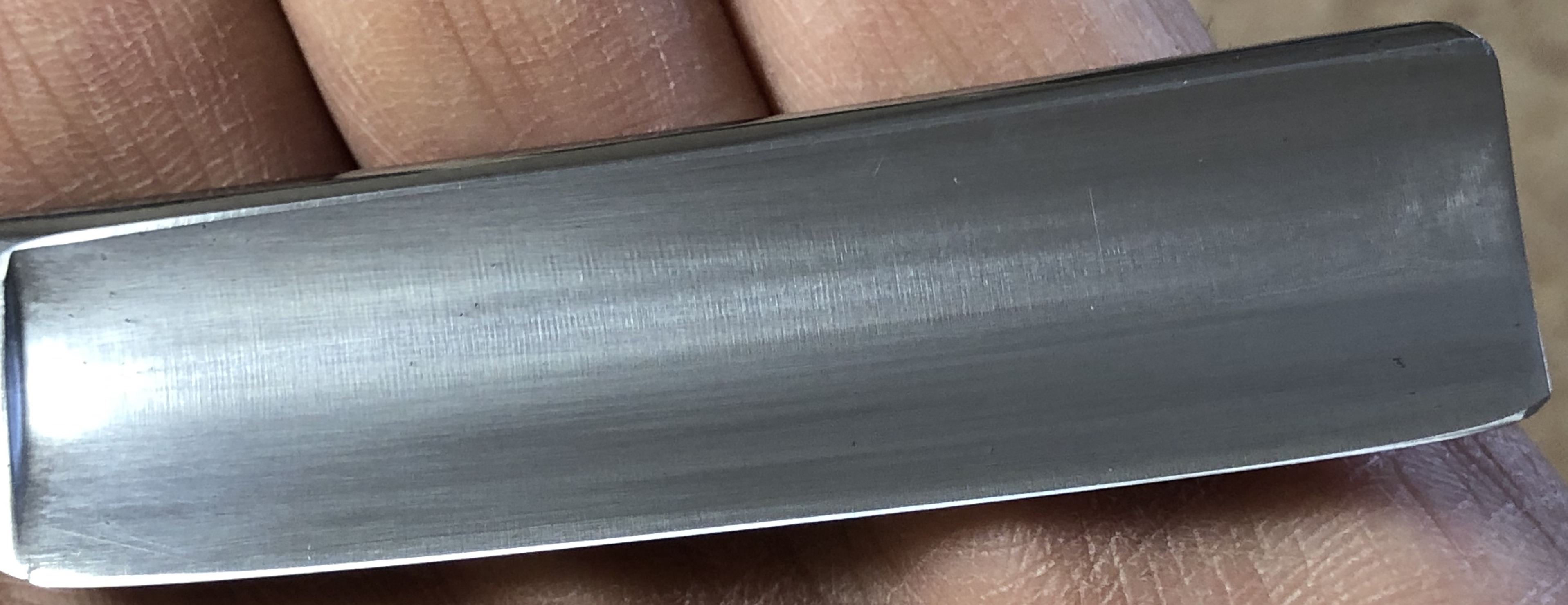 Никаких видимых дефектов не заметил. Все ,как вчера с производства.Элегантная форма клинка, в массе своей несвойственная японским бритвам, в виде тонкого эрля, широкого полотна, с глубокой выработкой .За счет толстого обушка бритва достаточно тяжёлая, что даёт возможность чувствовать ее в руках, при бритье и не резаться часто.Идеальная форма клинка:кромочка равномерна по всей длине и практически незаметна.Отличная "звонкая" сталь способна выдавать качественное и мягкое бритьё. Заточена и готова к бритью.