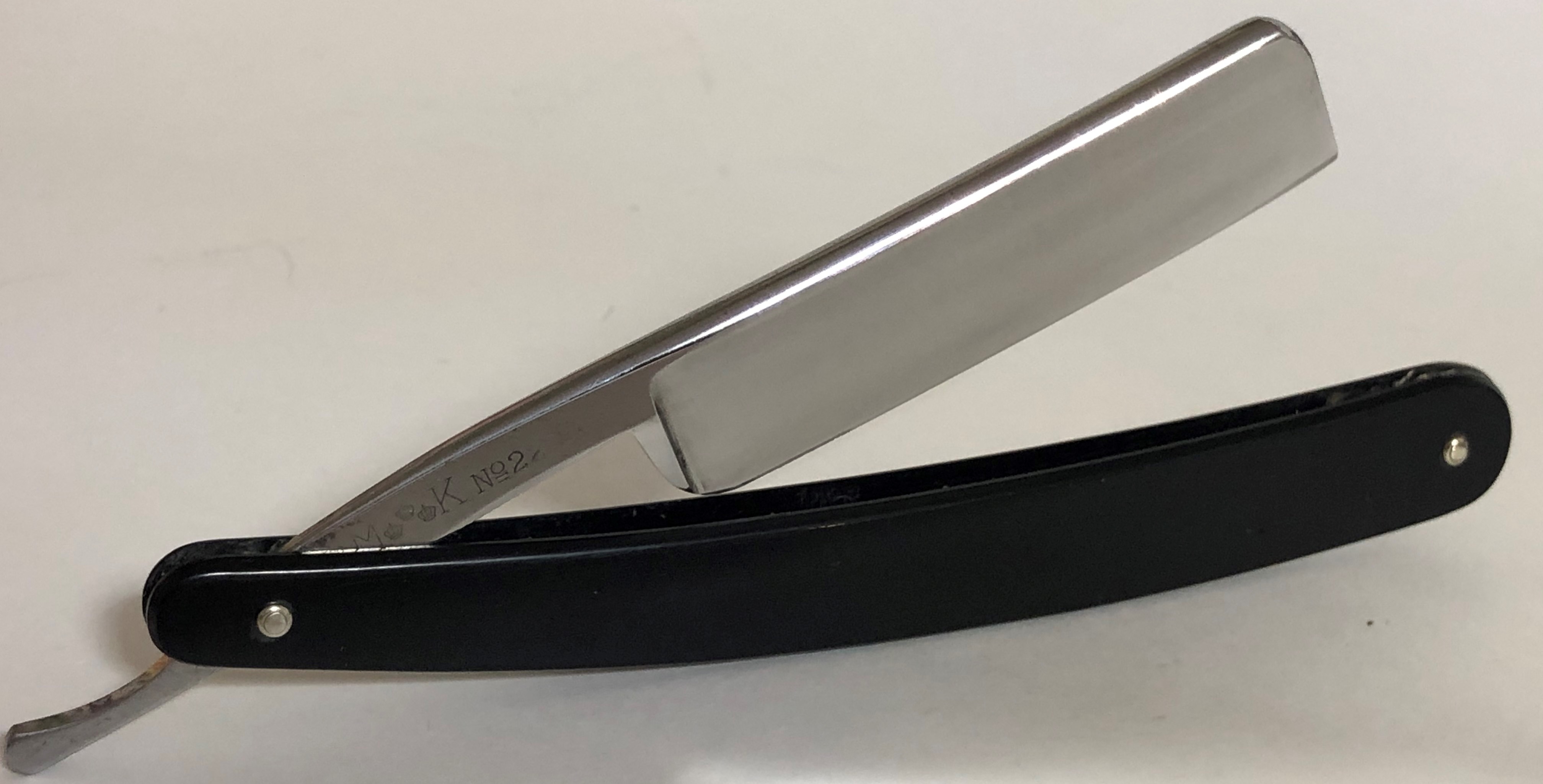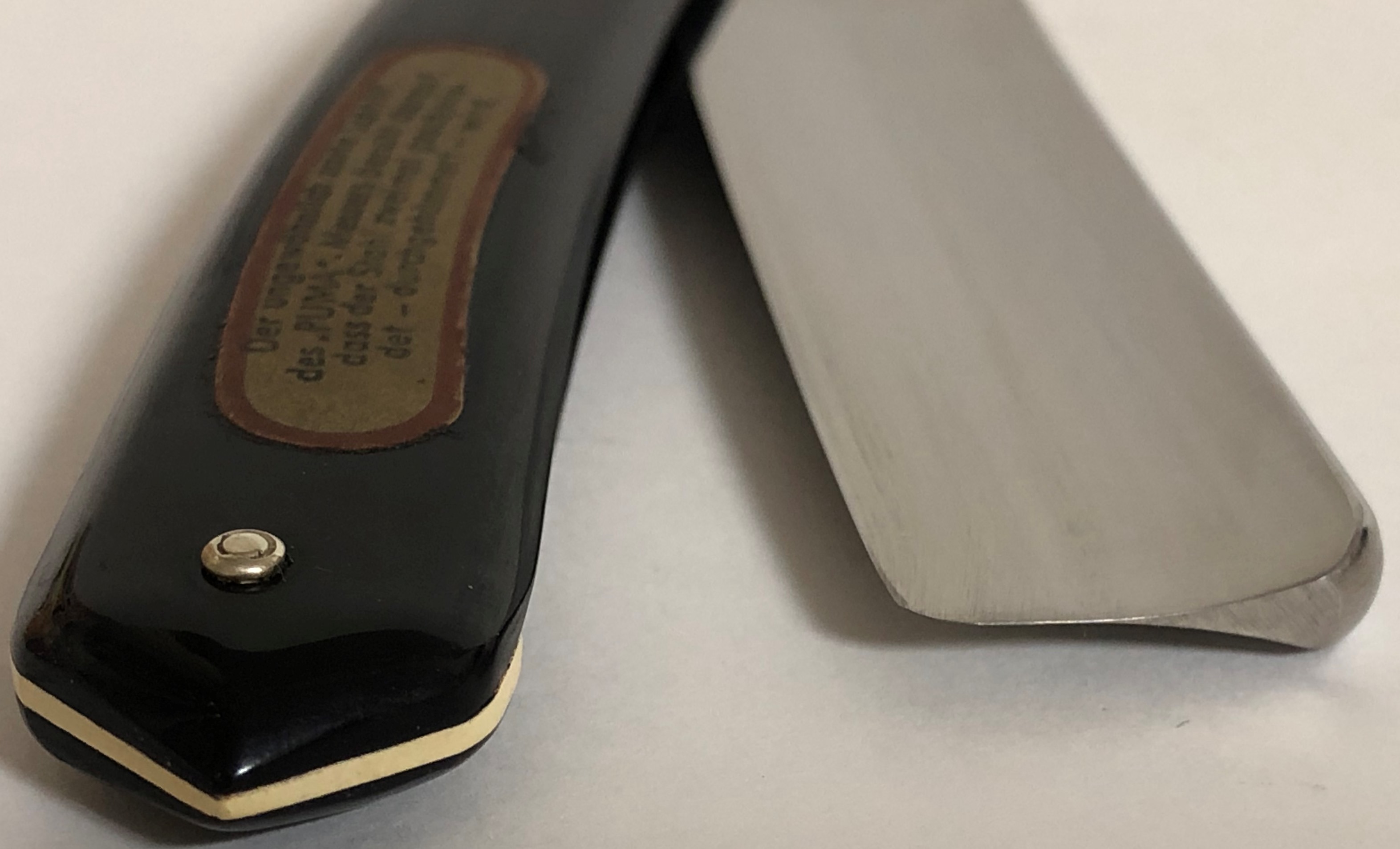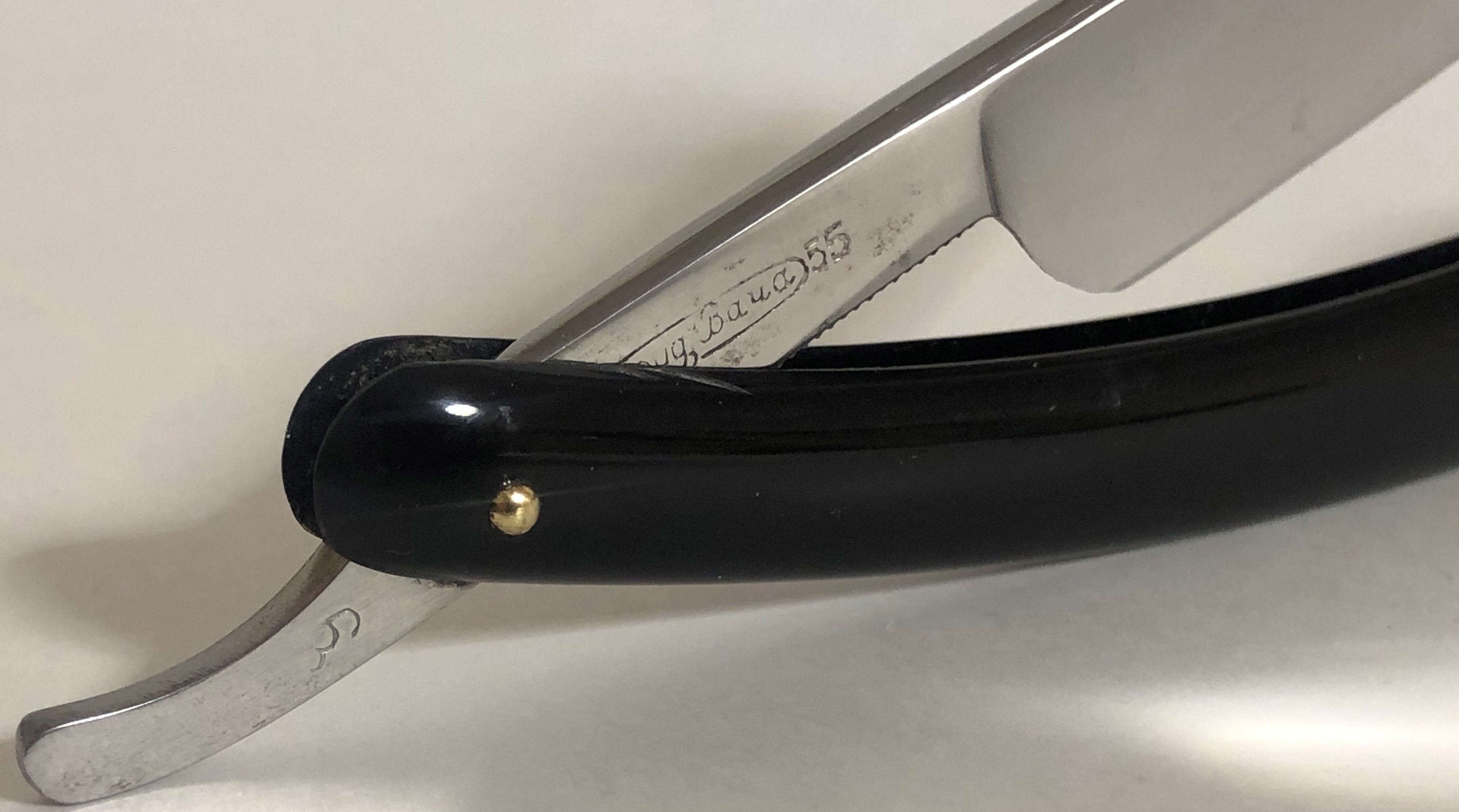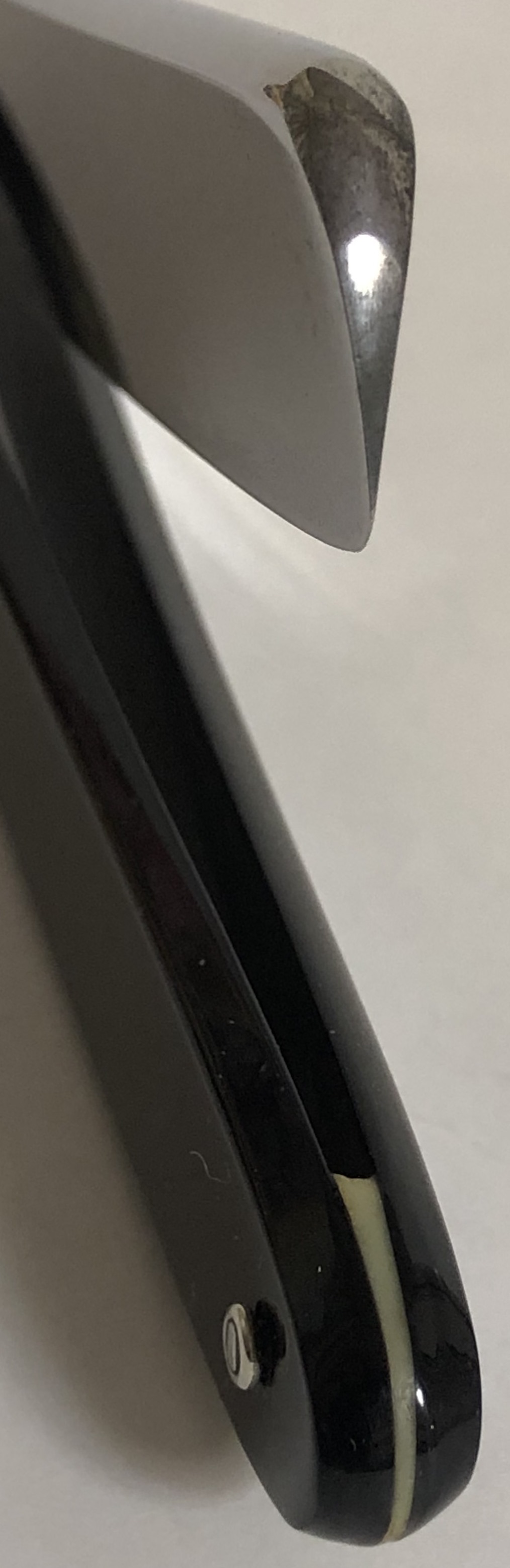 Следов пользования не заметил. Обушок находился в первозданном виде, без следов абразива.Но, пришлось разобрать, немного почистить металл от остатков патины и других дефектов и заново собрать, поставив нормальные втулки, с добавлением внутренних шайб.При шлифовке грани и переходы на "ступеньку" были соблюдены и не зализаны.Если несколько "точек времени" и осталось,но практически незаметны , если смотреть в натуре и не представляют никакого вреда в будущем.Идеальная геометрия клинка:кромочка равномерна по всей длине и еле заметна.Коробочка неоригинальная.Бритва заточена и готова к бритью.