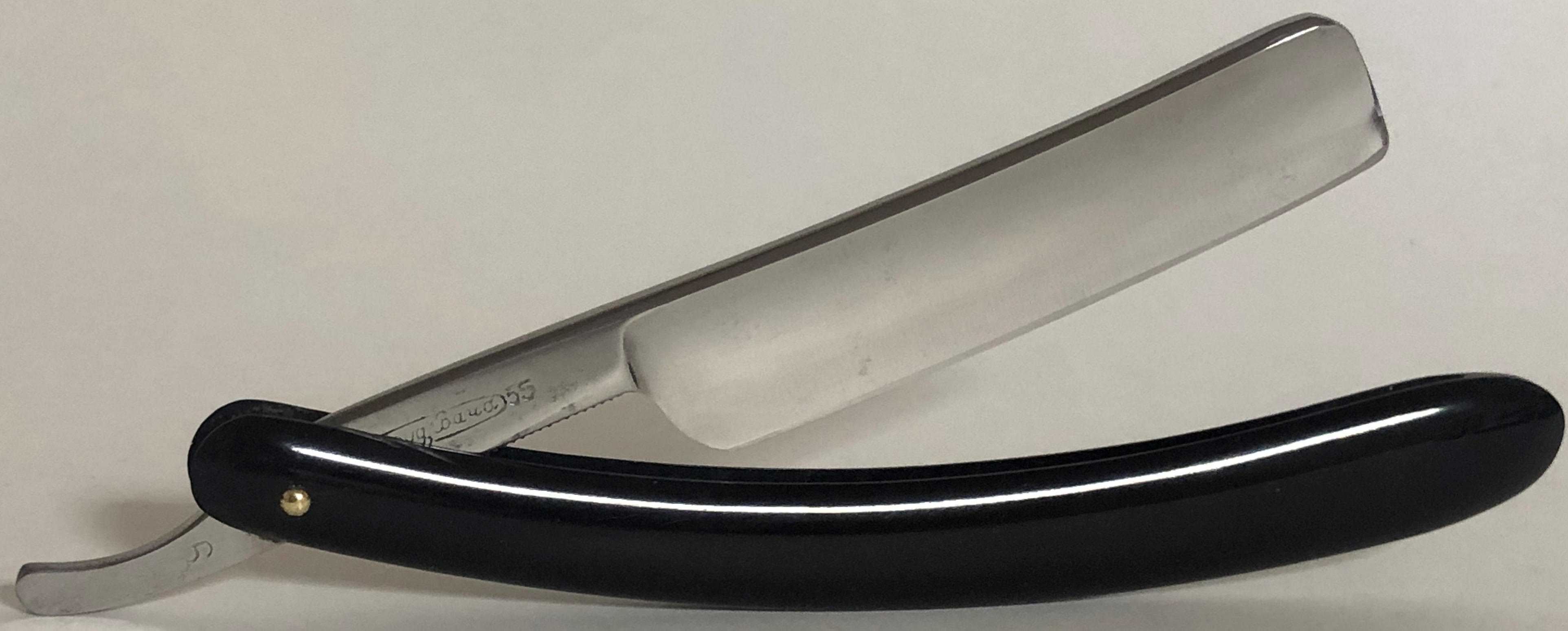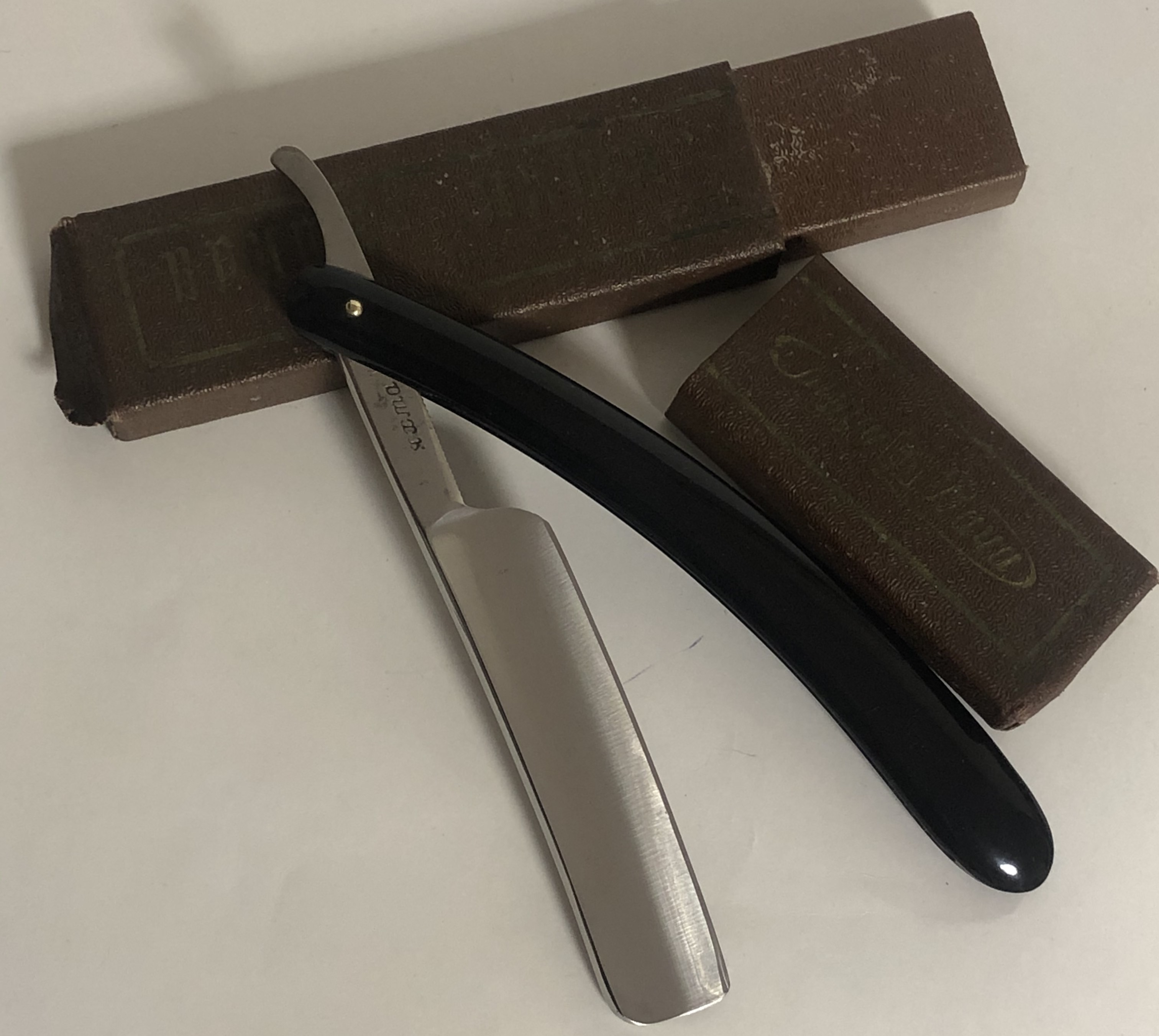 Прекрасно сохранившейся экземпляр.По всей видимости в пользовании не был, по крайней мере следов от камней и разного роды уточек металла не заметил. Бритву разобрал для порядка, почистил обушок, а само полотно шлифовал вручную , на камнях разной зернистости, по принципу шлифовки катан.После полировки полотно получило голубоватый , чуть заметный продольной сатин, приближенный к зеркальному состоянию.Но не зализанный до фанатизма. Все в рамках разумного.  Сталь чистая, без видимых критичных дефектов. Идеальная геометрия клинка:кромочка равномерна по всей длине и почти незаметна.Эффектно смотрящийся эрль, с элементами ковки и старинной патины.Тяжёлая, мощная и очень красивая бритва, но в тоже время практичная,с прекрасной сталью и качественным , и мягким резом.Достойный вариант в любую коллекцию.Оригинальные пины поменял на немецкие двух-цветные втулки.коробочка неродная. Бритва заточена и готова к бритью.