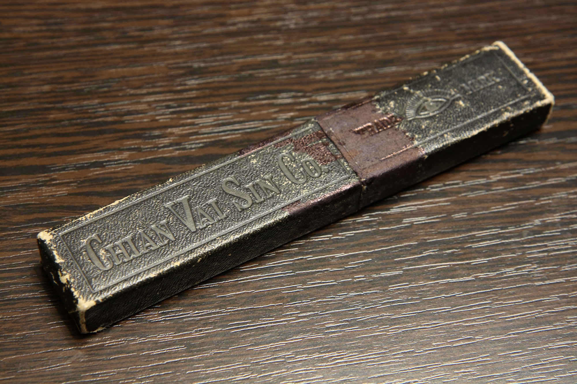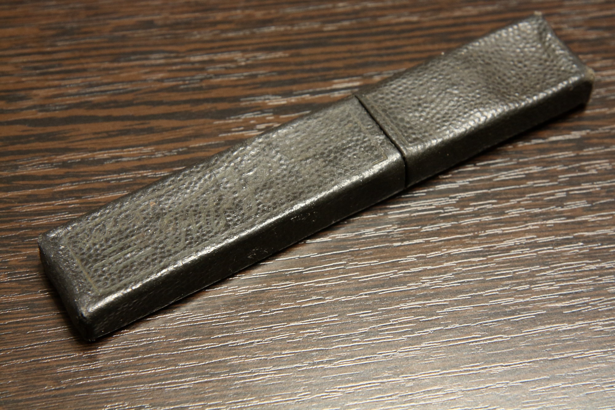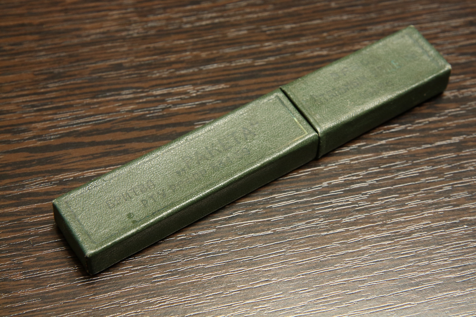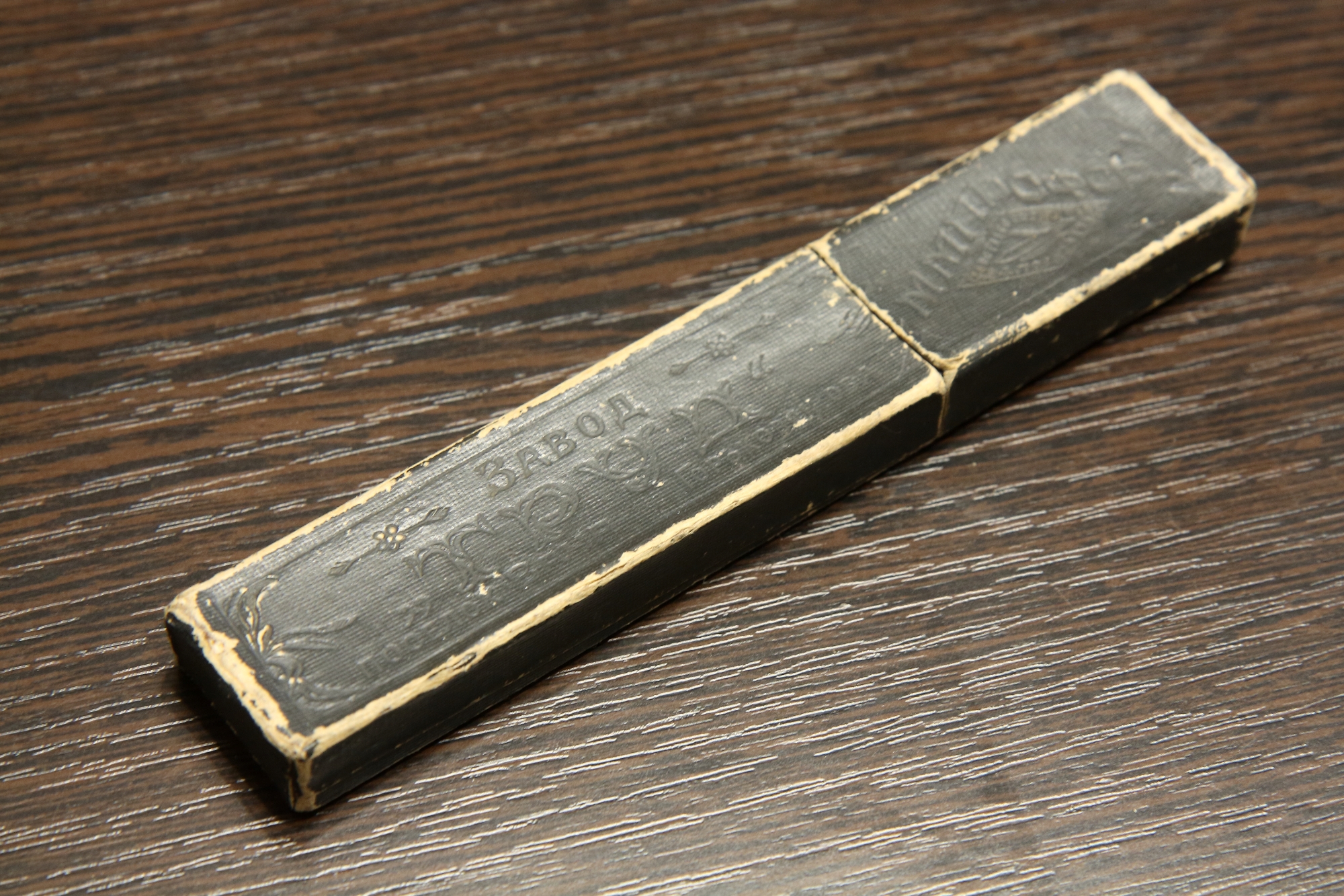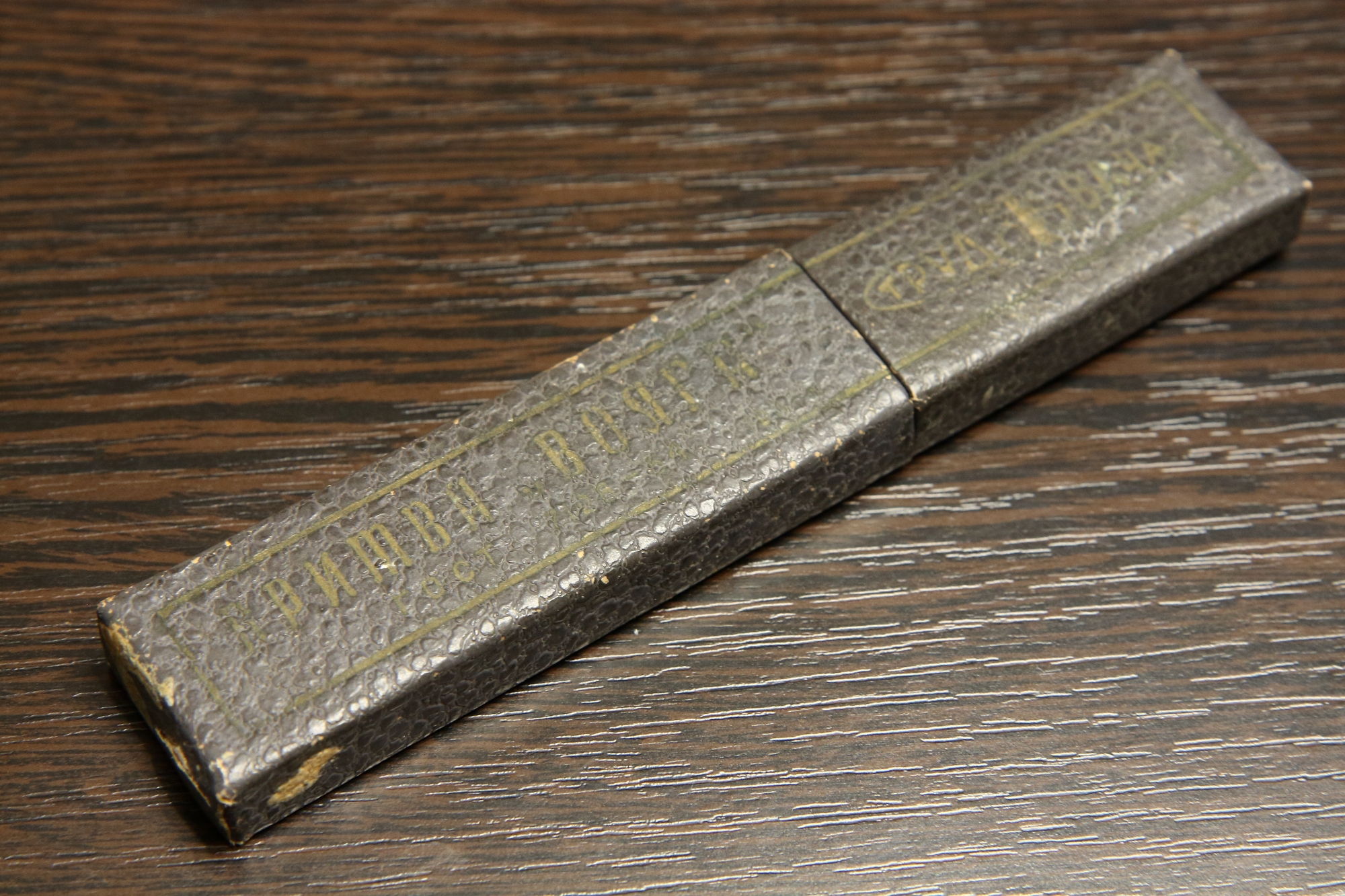 Опасная бритва завода Труд Вача Росинструмент, 1941 г. Месяц тут не выбит, просто чистое место, но я уверен, что это начало ВОВ, как и второй Росинструмент, они пришли вместе. Ширина полотна 17 мм, футляр родной (интересный, покрыт марлей, пропитанной смолой/клеем, типа как текстолит делали), ручку пришлось заменить, была треснутая, поставил от бритвы СТИЗ тех же лет (расцветка родная). Бритва пришла с заводской заточкой, чуть прошелся наждачками и заточил, остались следы в паре мест, там была местная коррозия. Подготовлена мной к бритью. Геометрия не идеал, но заточку я вывел полностью, в последующем затачиваться и правиться будет без проблем. Бритвы с клеймом "Росинструмент" очень ценятся. На мой вкус бреет достойно, без агрессии, не травматичная, но чуть потягивает щетину. Цена - руб. К бритве рекомендую приобрести ремень для правки опасных бритв моего изготовления из итальянской кожи (подробнее на странице 4, объявления 56-58 и странице 9, объявления 127). Spoiler Show