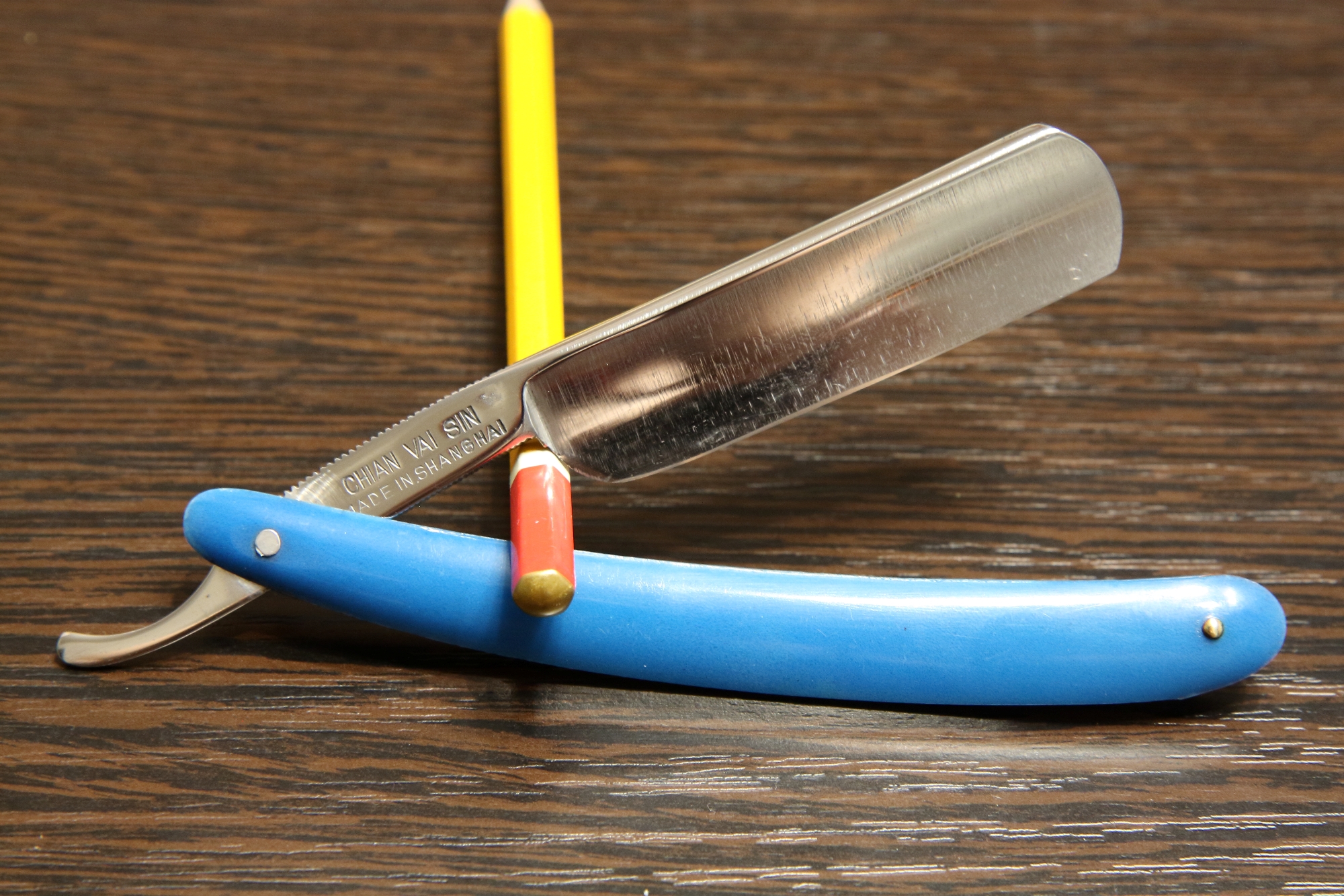 Опасная бритва Chian Vai Sin Co Best quality, сделана в Китае в г. Шанхай, ширина полотна 22 мм, все родное. Ко мне попала с заводской заточкой и довольно грубой заводской же шлифовкой полотна. Прошелся немного пастами вручную, продезинфицировал и подготовил к бритью. Это винтажный Китай, сталь по качеству сравнима с их же Double Arrow, т.е. никакого сравнения с их новоделами. Интересная ручка из синего пластика, футляр был несколько ободран - закрасил эти места. Сталь интересная, как то по особенному звучит, но требует ухода, если вовремя не протереть, довольно быстро образуются потемнения. Бреет сравнимо с хорошими немцами, но со своей изюминкой. Цена - руб. К бритве рекомендую приобрести ремень для правки опасных бритв моего изготовления из итальянской кожи (подробнее на странице 4, объявления 56-58 и странице 9, объявления 127). Spoiler Show