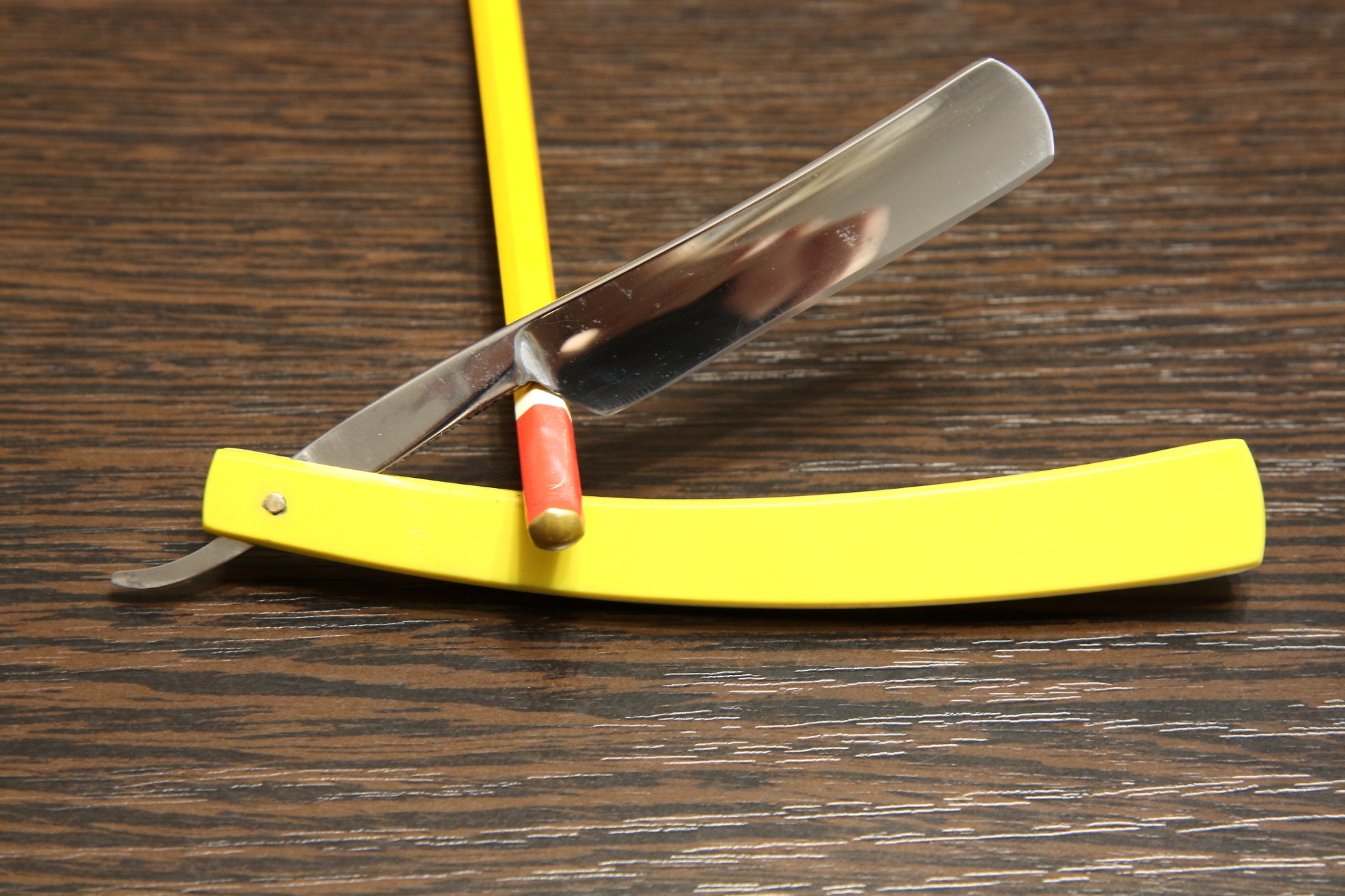Опасная бритва завода Труд Вача Росинструмент, 1941 г, 8 месяц. Оборона Заполярья, Ленинграда, Одессы, Таллина, бои под Смоленском, Киевом, контрудар под Старой Руссой. Ширина полотна 17.3 мм, все родное, футляр тоже. Ручка родная, из пластика редкой желтой расцветки. Бритва пришла с заводской заточкой и без следов коррозии, чуть прошелся пастами и заточил. Геометрия не идеал, но заточку я вывел полностью, в последующем затачиваться и правиться будет без проблем. Подготовлена мной к бритью. Бритвы с клеймом "Росинструмент" очень ценятся. Цена - руб. К бритве рекомендую приобрести ремень для правки опасных бритв моего изготовления из итальянской кожи (подробнее на странице 4, объявления 56-58 и странице 9, объявления 127). Spoiler Show