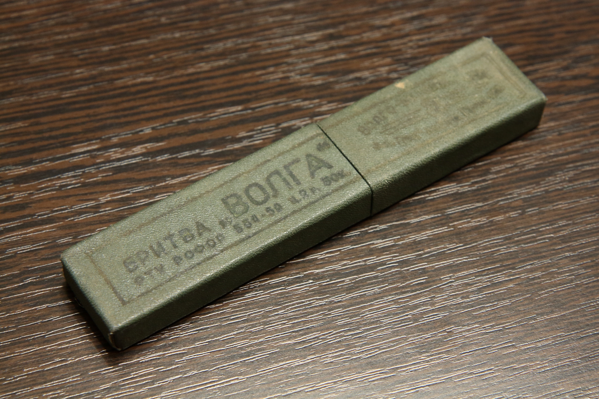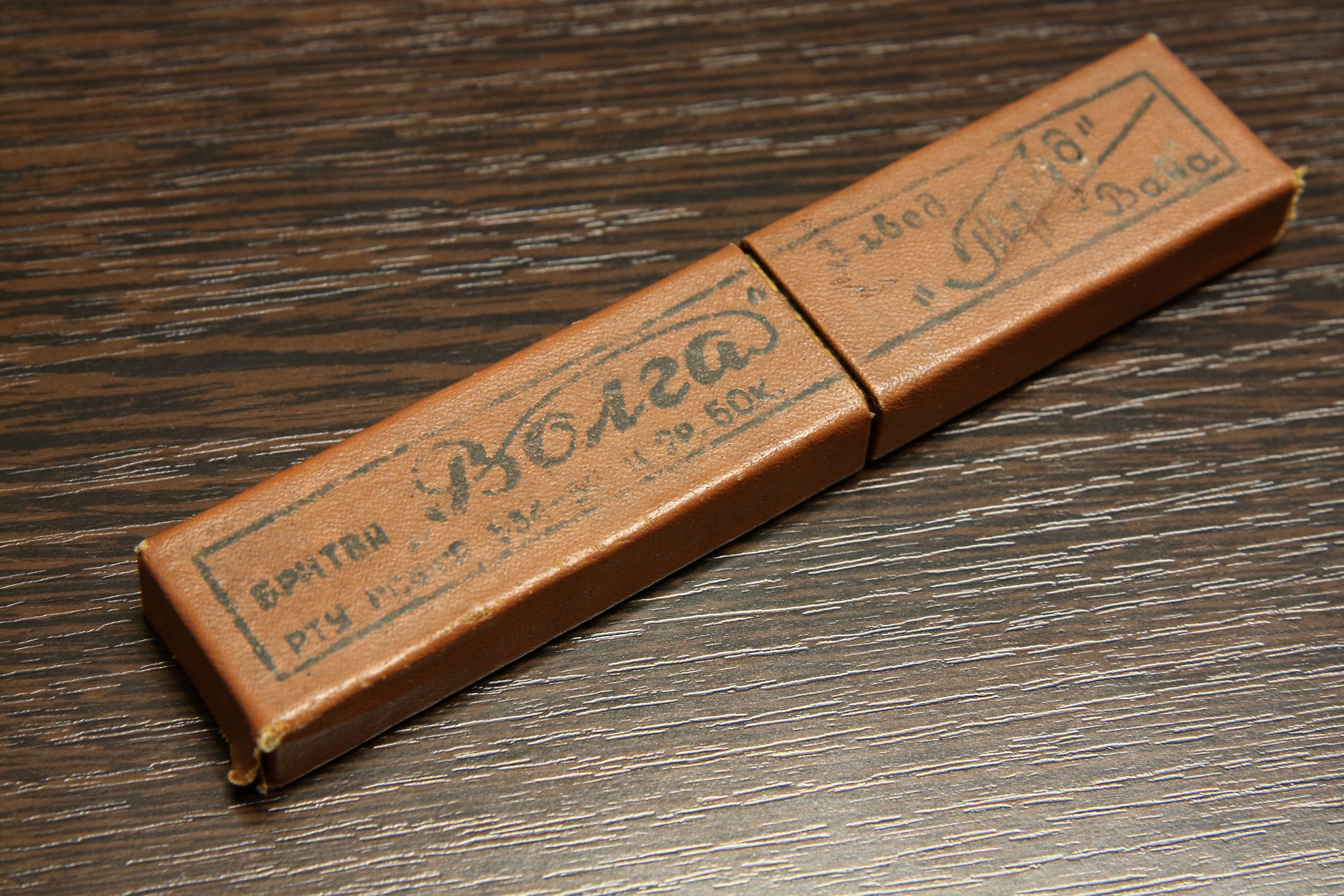 Опасная бритва Волга, завод ЗТВ (Вача), 1968 год. Ширина полотна 18 мм, двухзаковный клинок, все родное, футляр тоже. Бритва пришла с заводской заточкой, но с сильной коррозией на всем полотне и эрле. Чистил вручную, остались значительные следы, кромка чистая. Подготовлена мной к бритью. Качественный экземпляр с передового завода Труд Вача, бреет мягко и эффективно, удобный большой размер, хорошая геометрия. Относится к серии т.н. "речных" бритв, куда еще входит Кама и Ока. Цена - руб. К бритве рекомендую приобрести ремень для правки опасных бритв моего изготовления из итальянской кожи (подробнее на странице 4, объявления 56-58 и странице 9, объявления 127). Spoiler Show