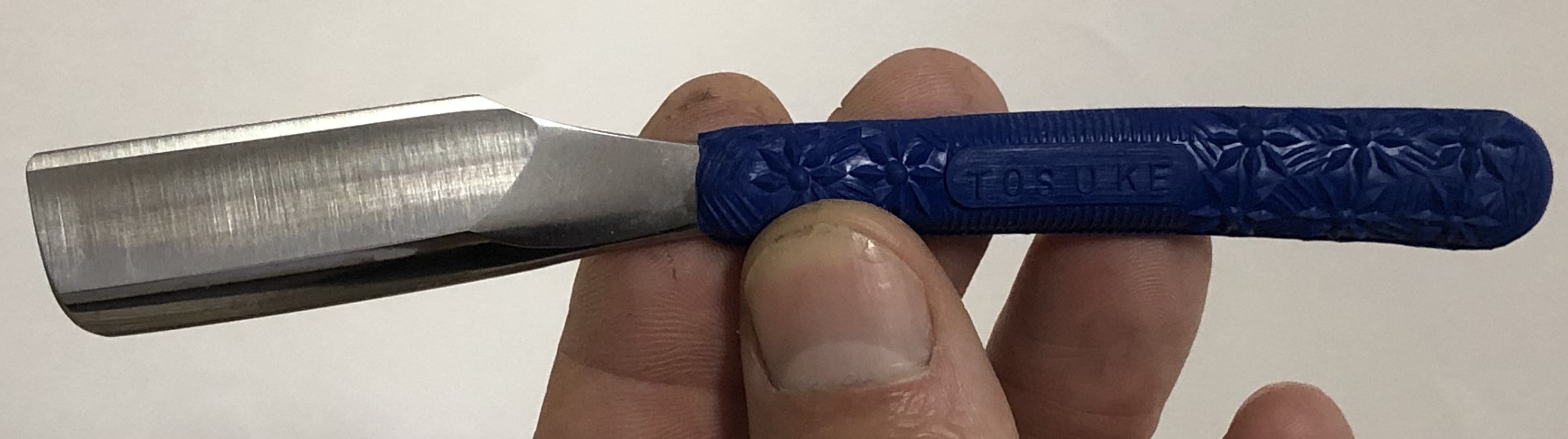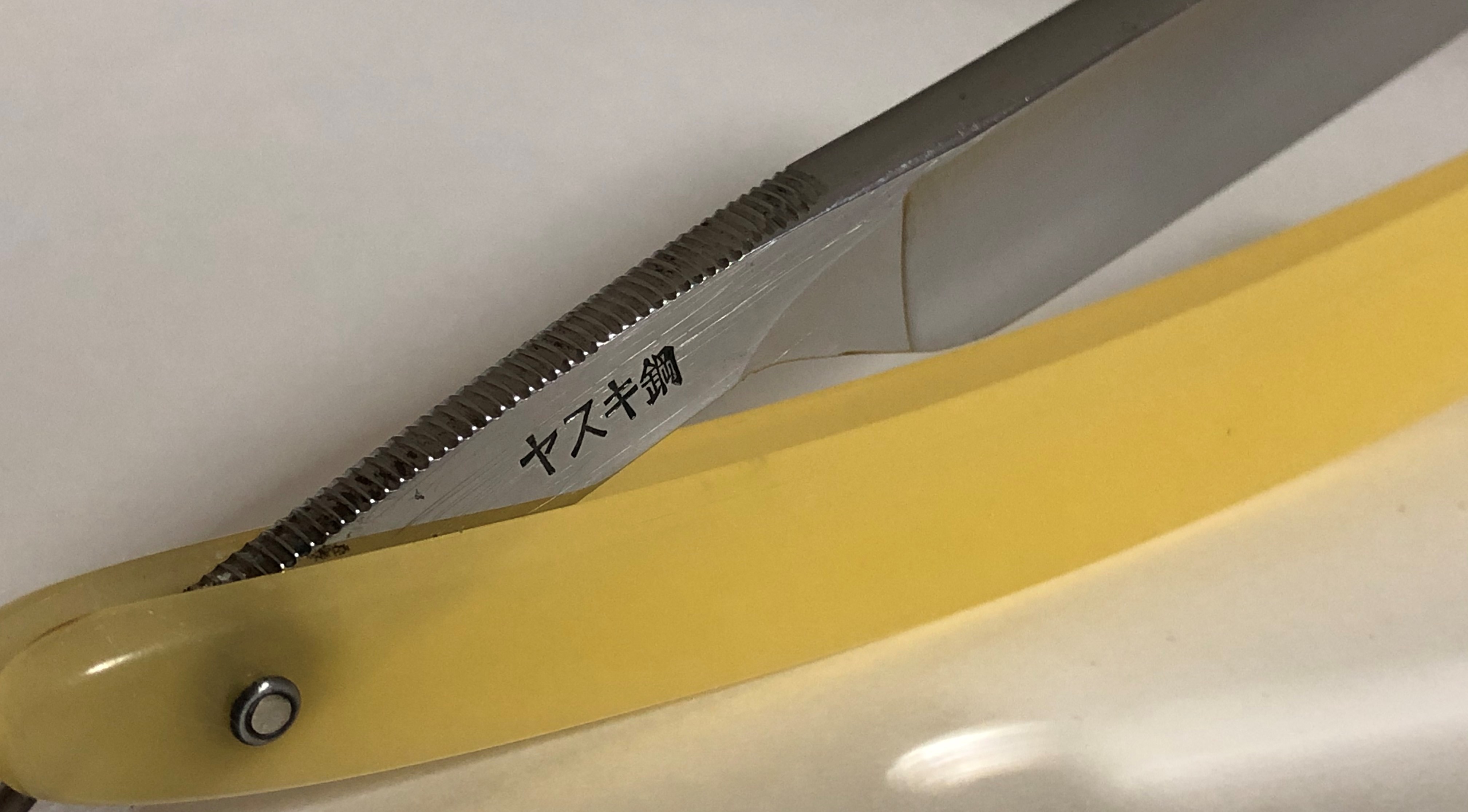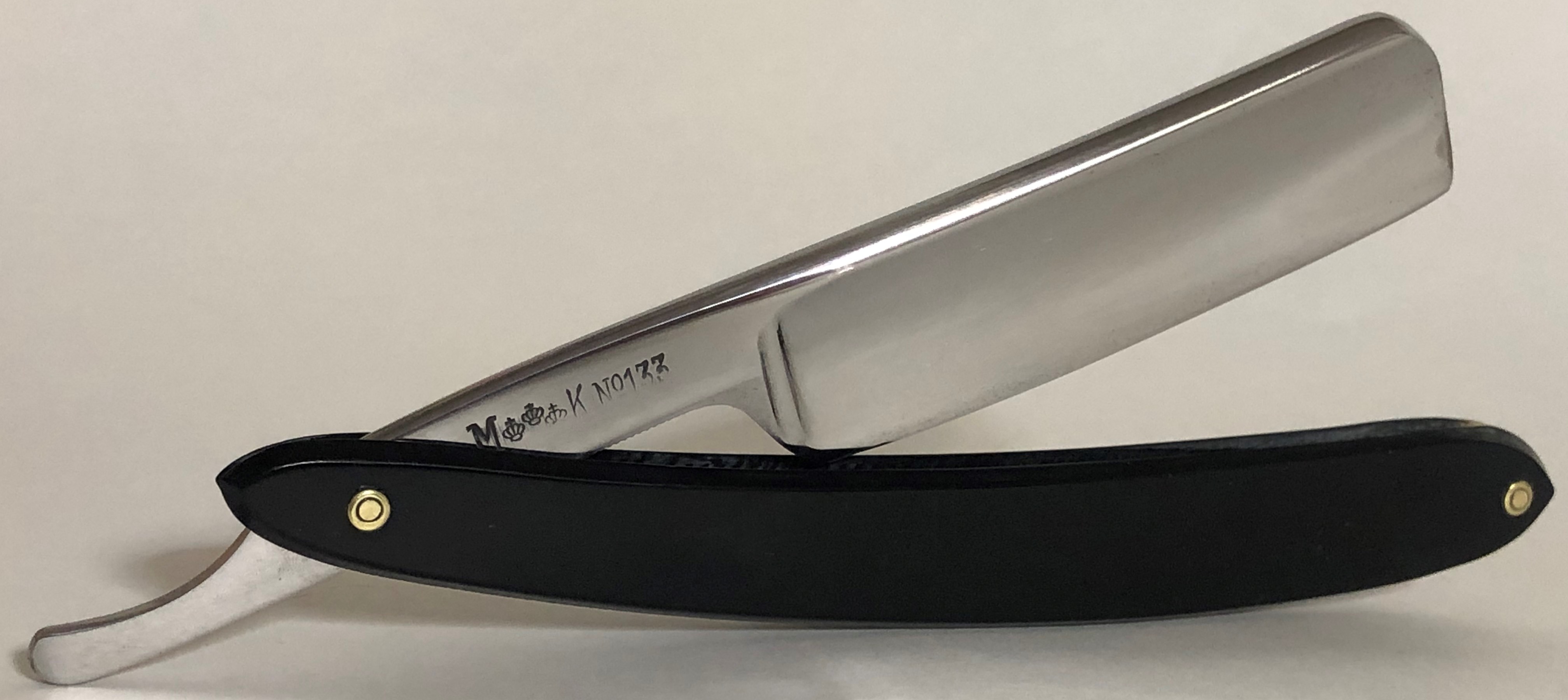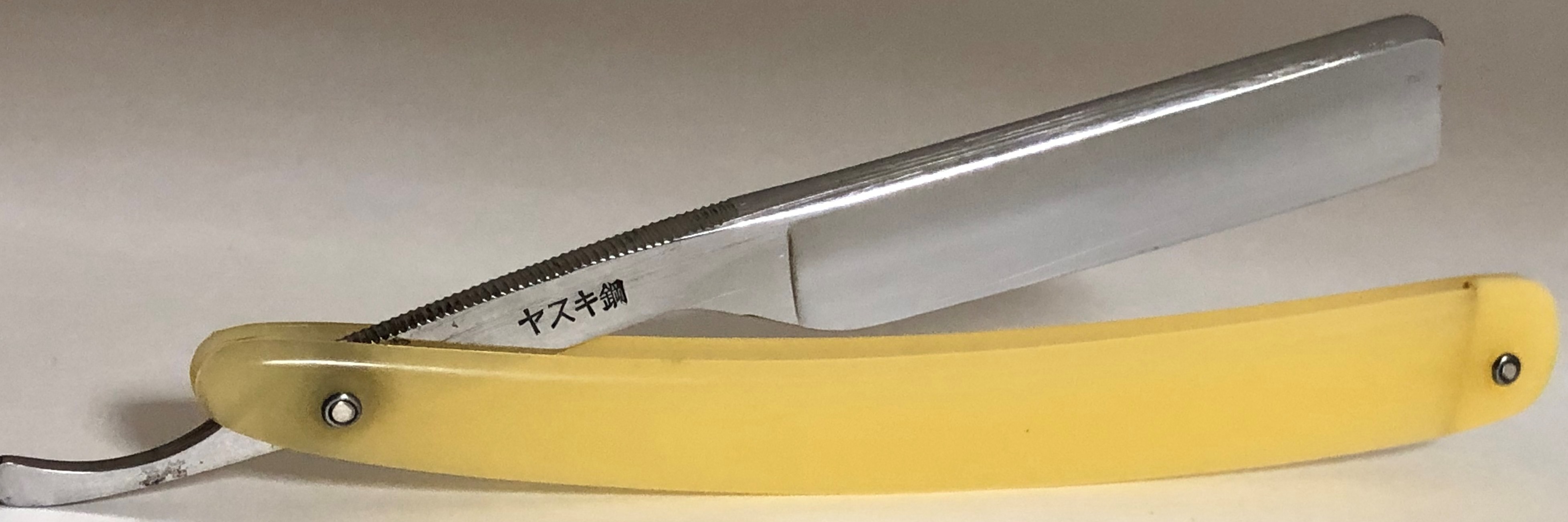 Артельная японская бритва,с очень интересной и не часто встречающейся формой клинка.Бритва не имеет следов пользования.По всей видимости совершенно непользованная, за исключением нескольких незначительных и практически невидимых царапин.Не разбиралась и не ремонтировалась. Заводская шлифовка и полировка.Очень удобный размер полотна, особенно для опытного пользователя, хотя и для новичка тоже подойдёт.Идеальная геометрия.Кромочка почти незаметна и равномерна по всей длине.Как про мне, японская сталь Ясуки является одной из самых удачных именно для бритв:хорошо точится,доводится и способна выдавать качественное бритьё.