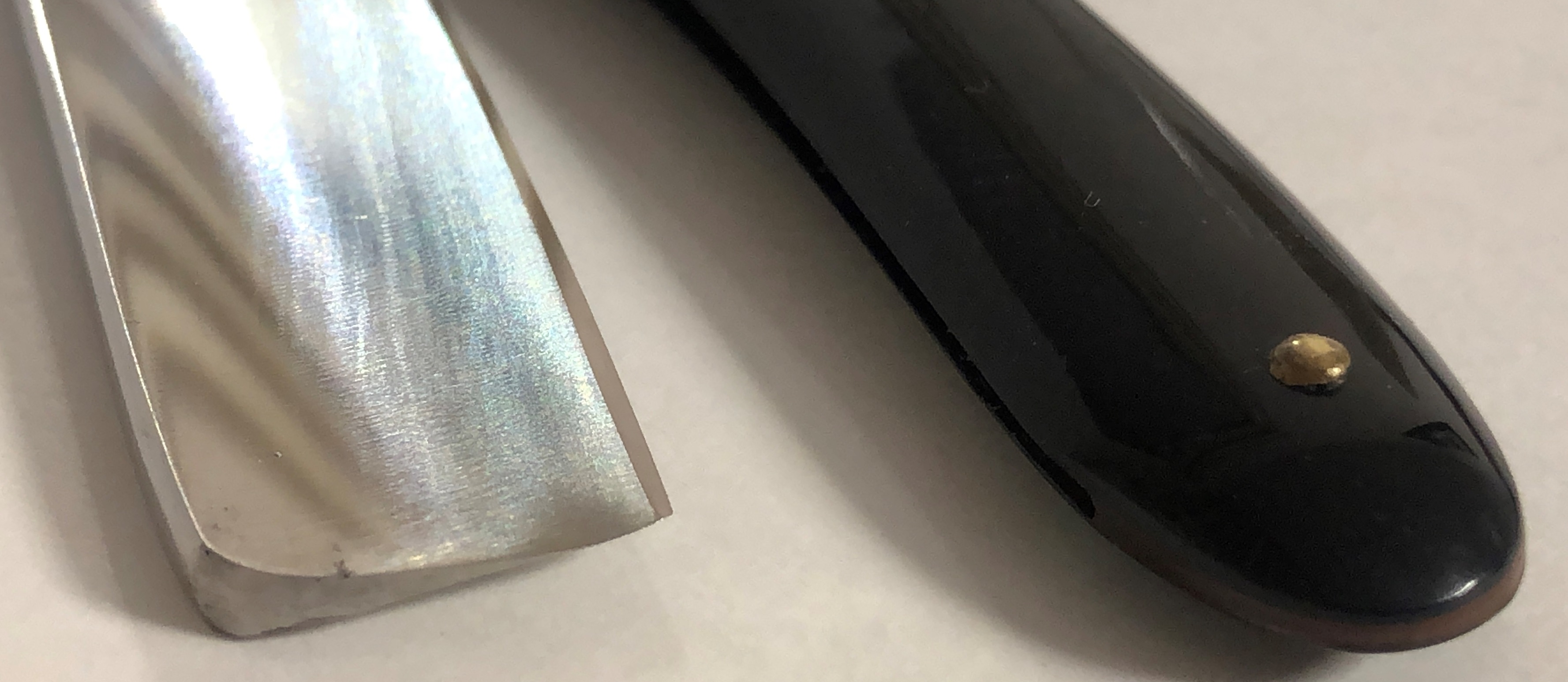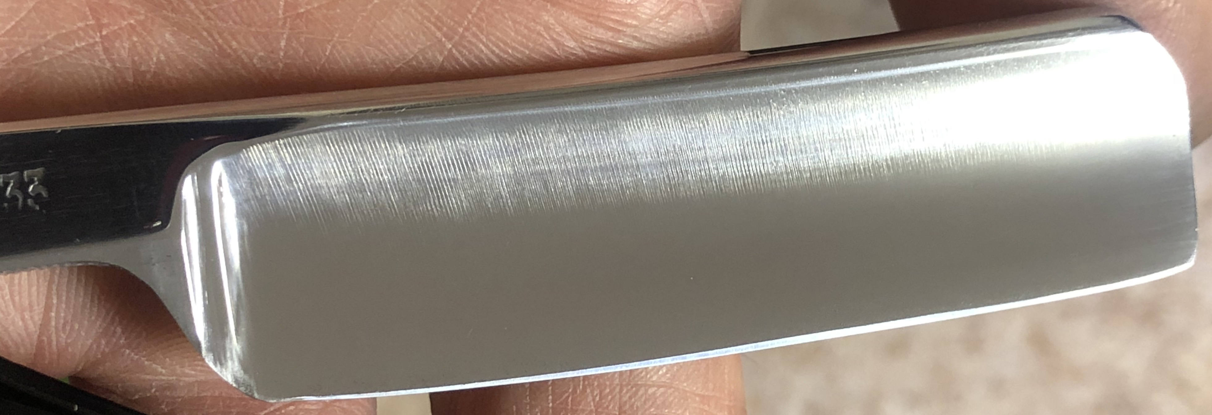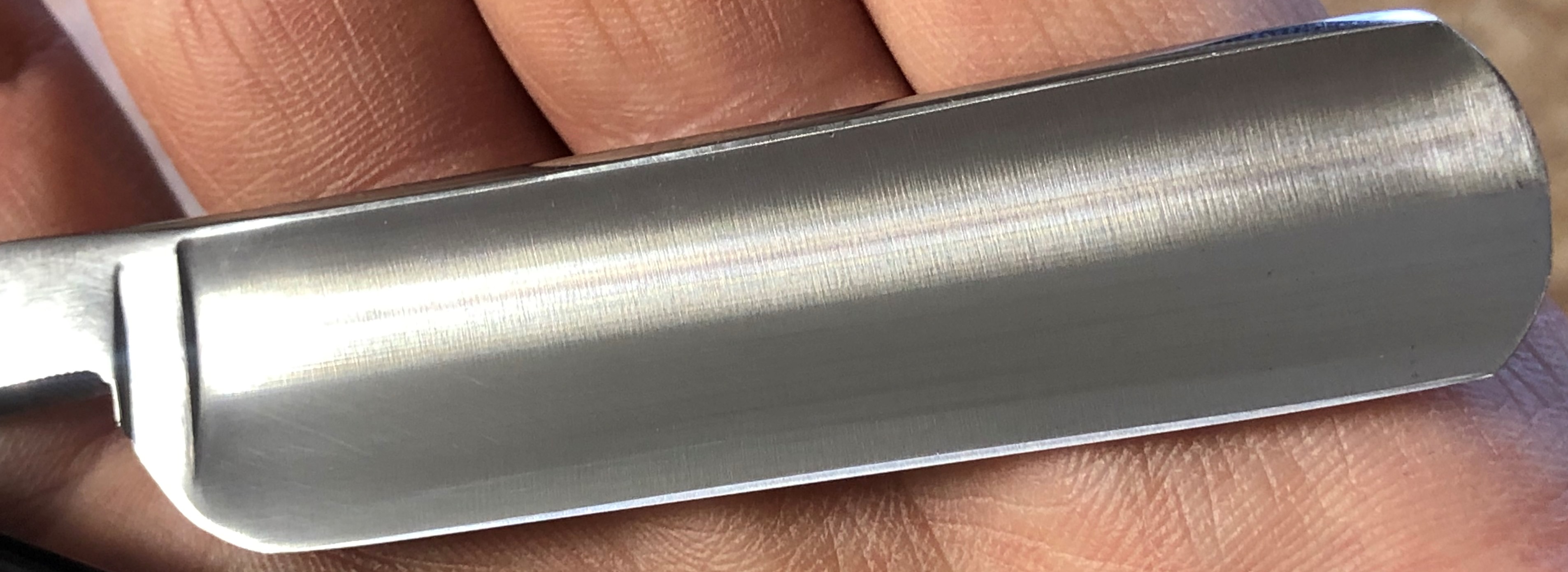 Идеальная геометрия клинка:кромочка равномерна по всей длине и практически незаметна.Редкая, породистая бритва на все времена...Заточена и готова к бритью.