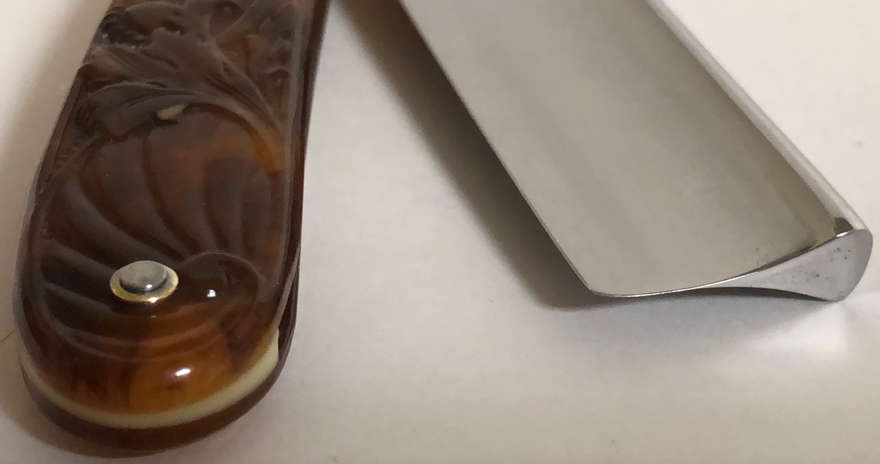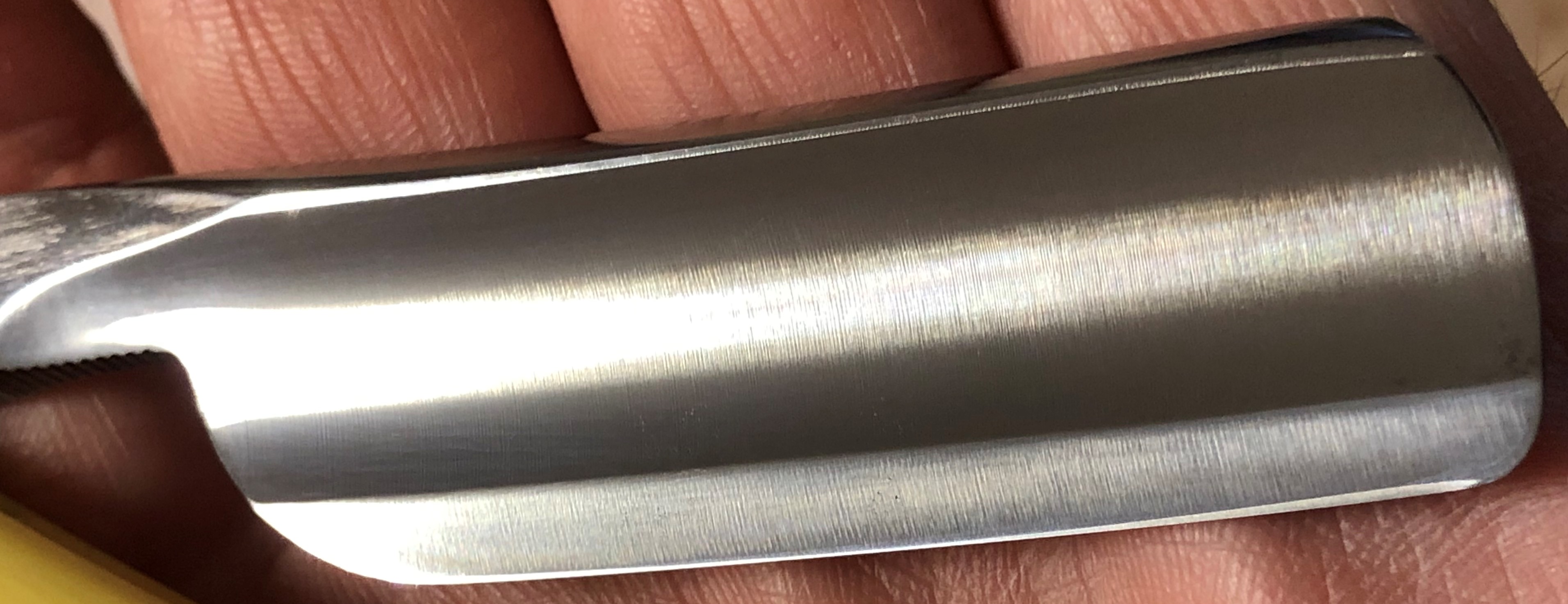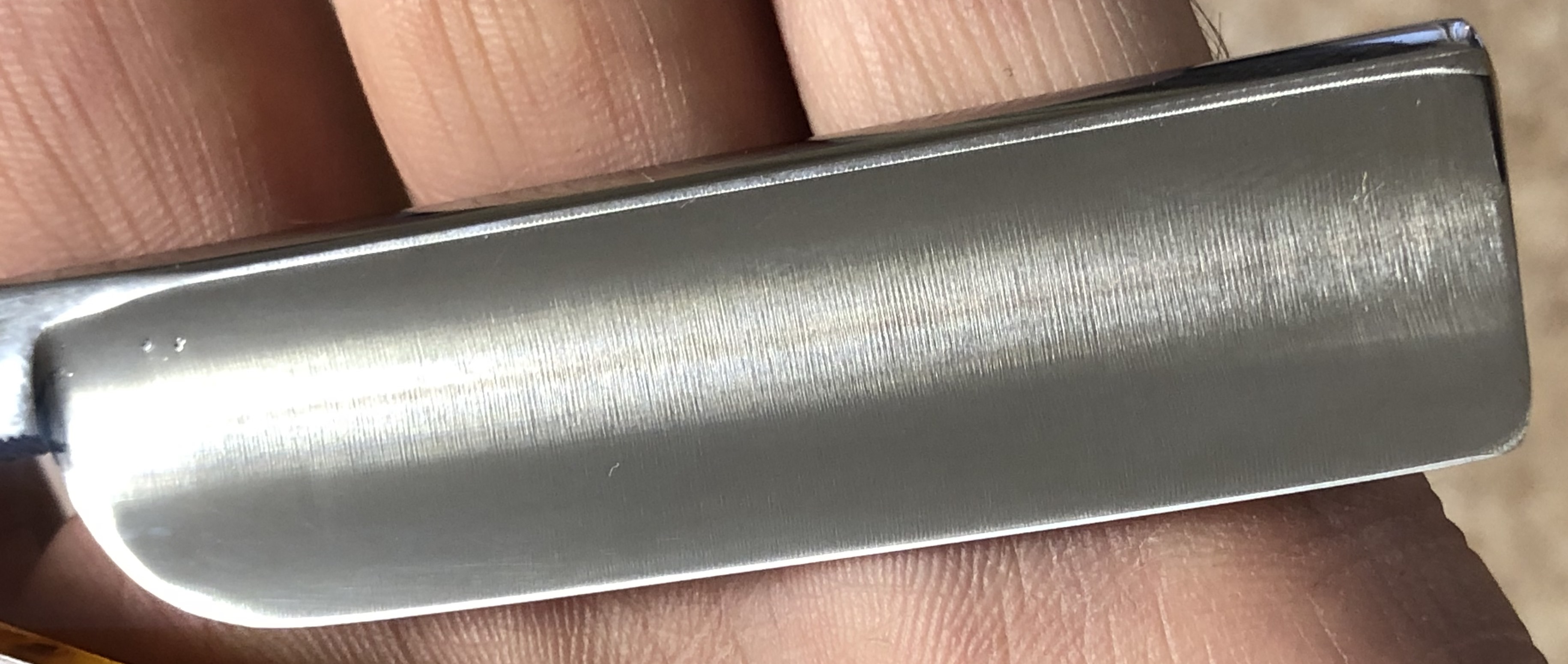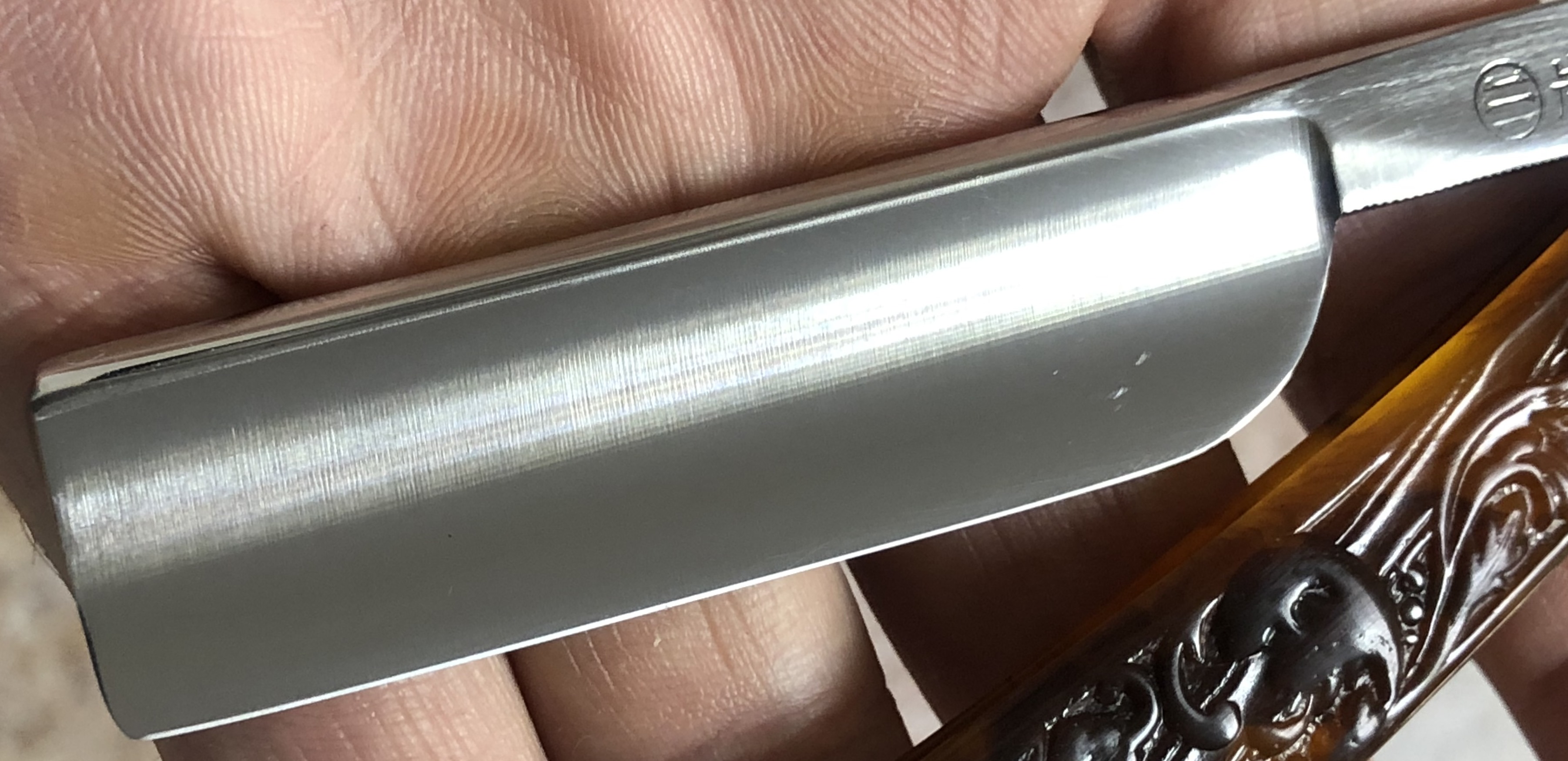 Идеальная геометрия клинка:кромочка равномерна по всей длине и практически незаметна.Редкая, породистая бритва на все времена...Заточена и готова к бритью.