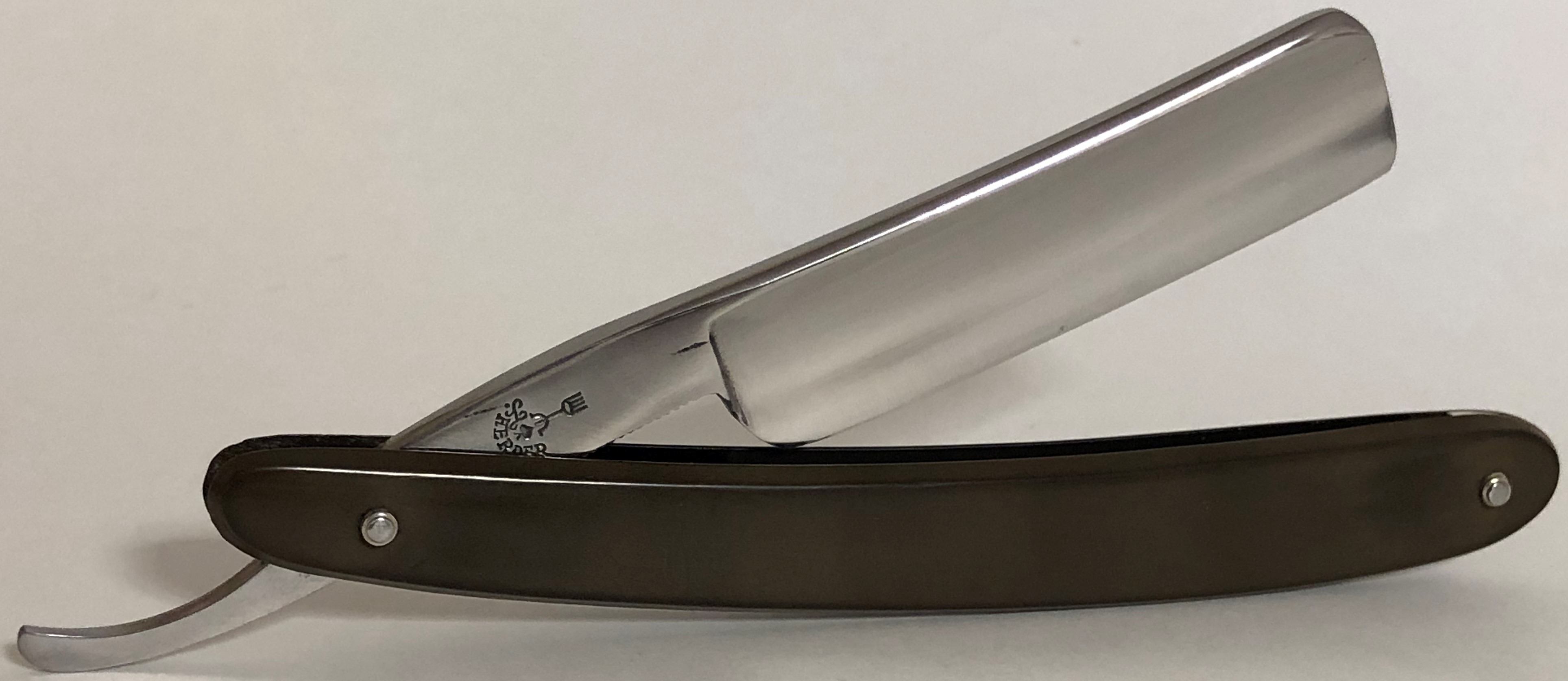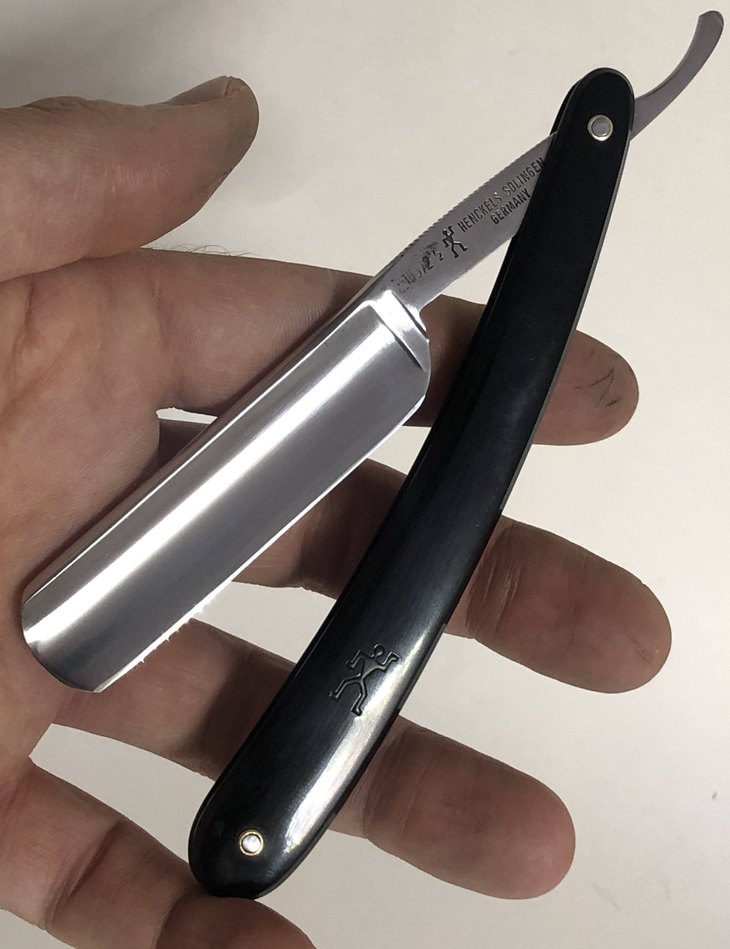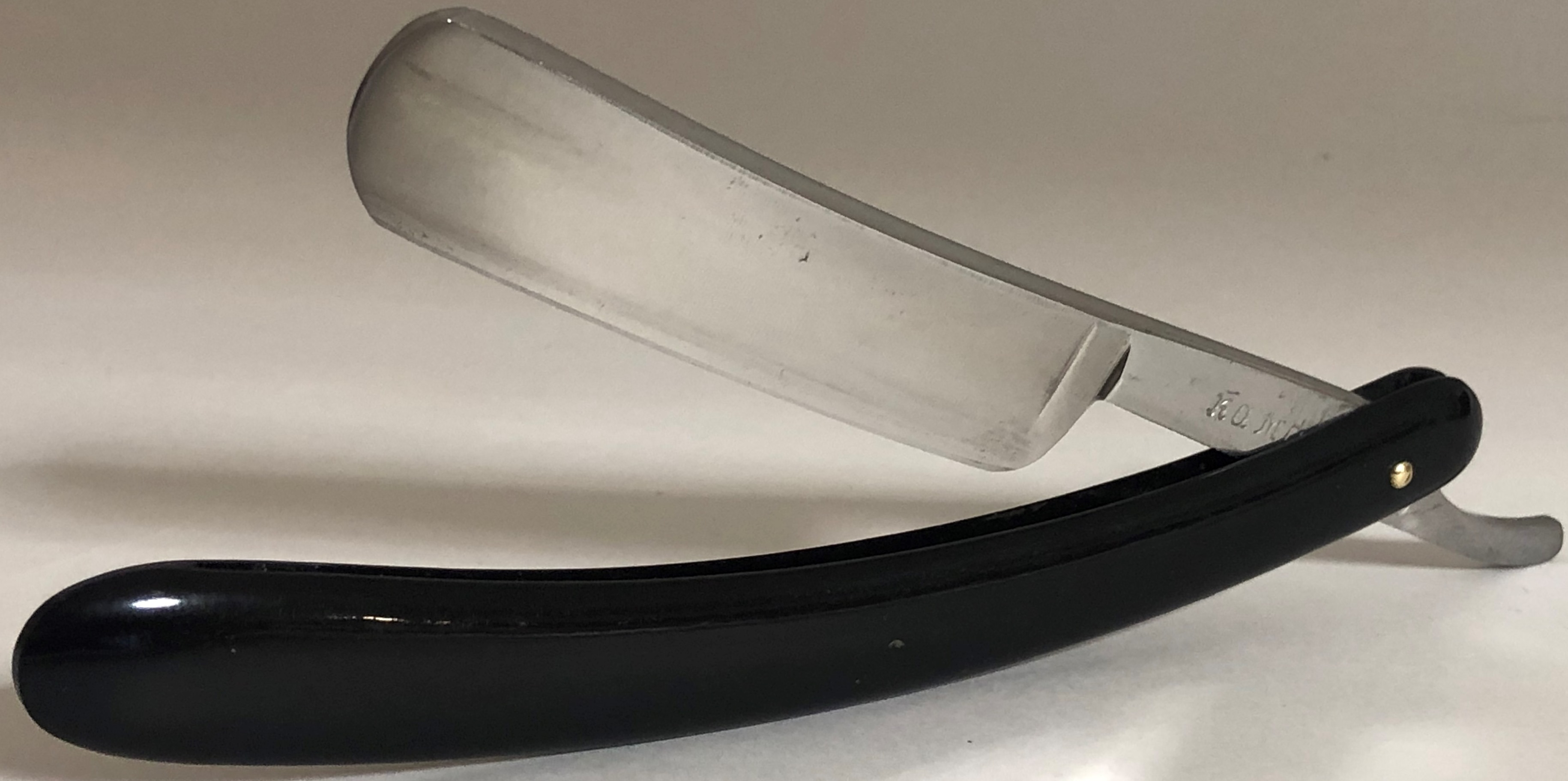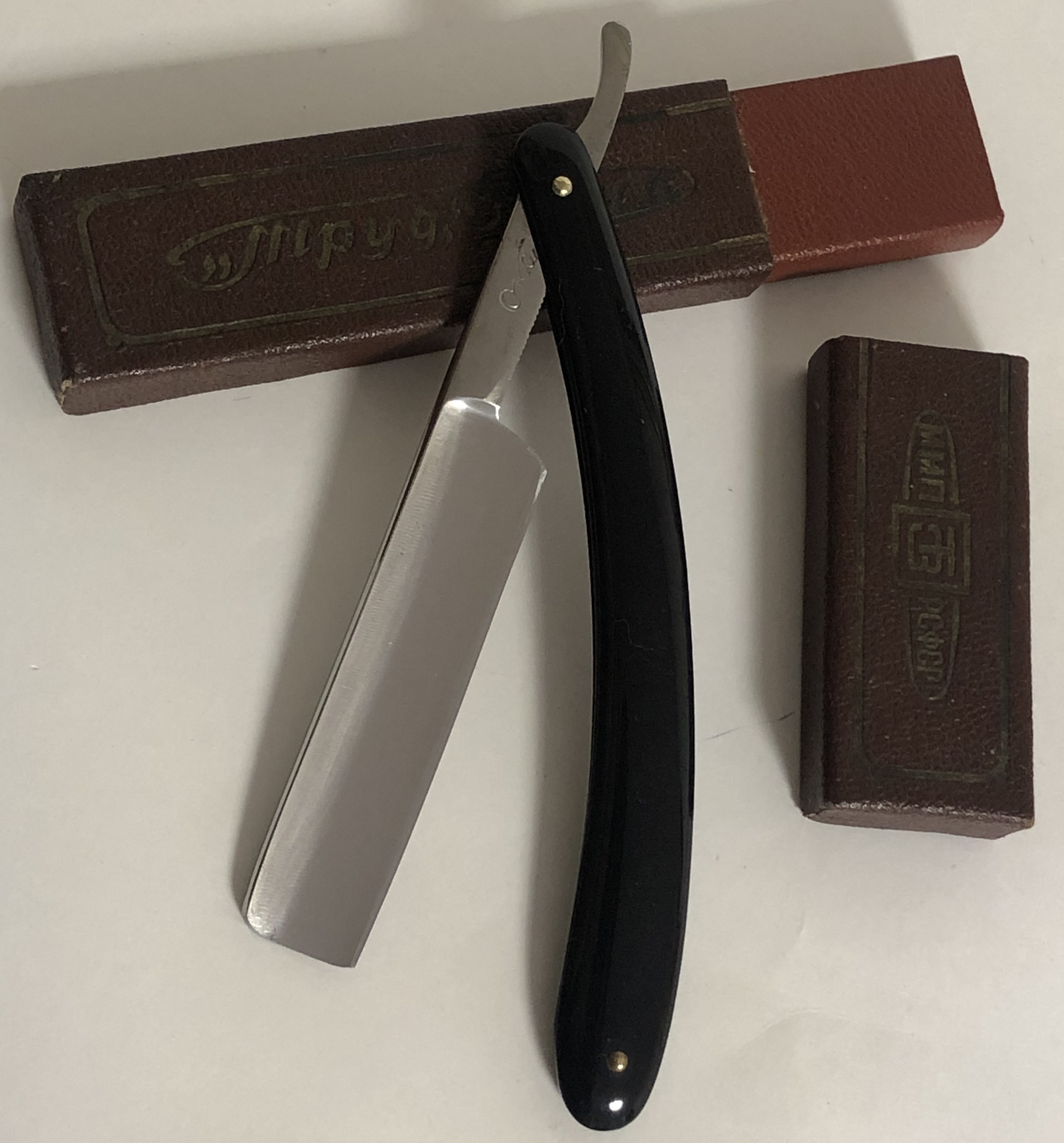 Эффектная немка, в состоянии близком к идеальному. Разобрал, немного освежил клинок , умеренно отполировал и снова собрал, с сохранением оригинальных пинов.Идеальная геометрия клинка. Кромочка равномерна по всей длине. Сталь чистая от разного рода видимых дефектов.Очень удобная бритва прежде всего для новичка.Заточена и готова к бритью.