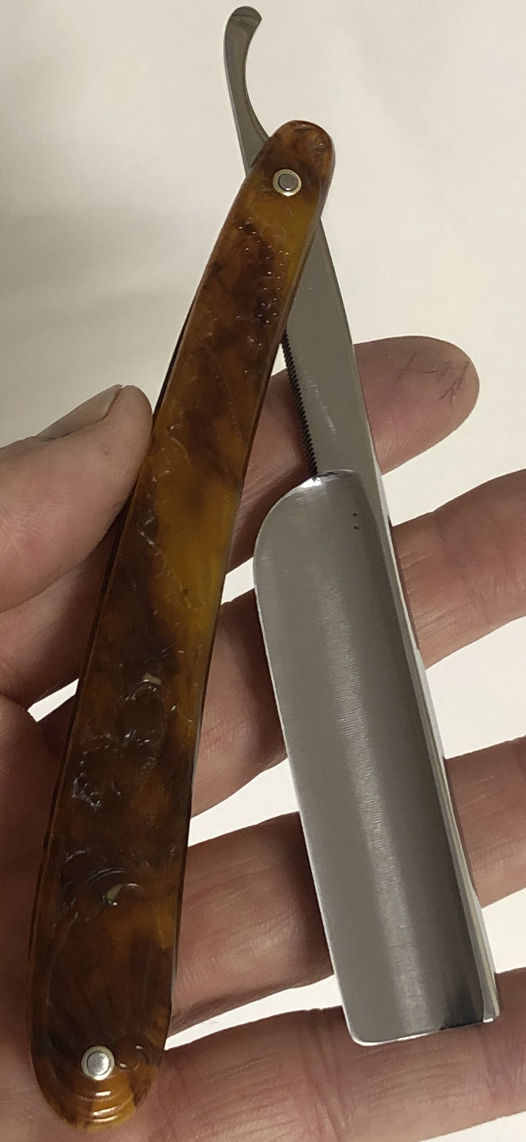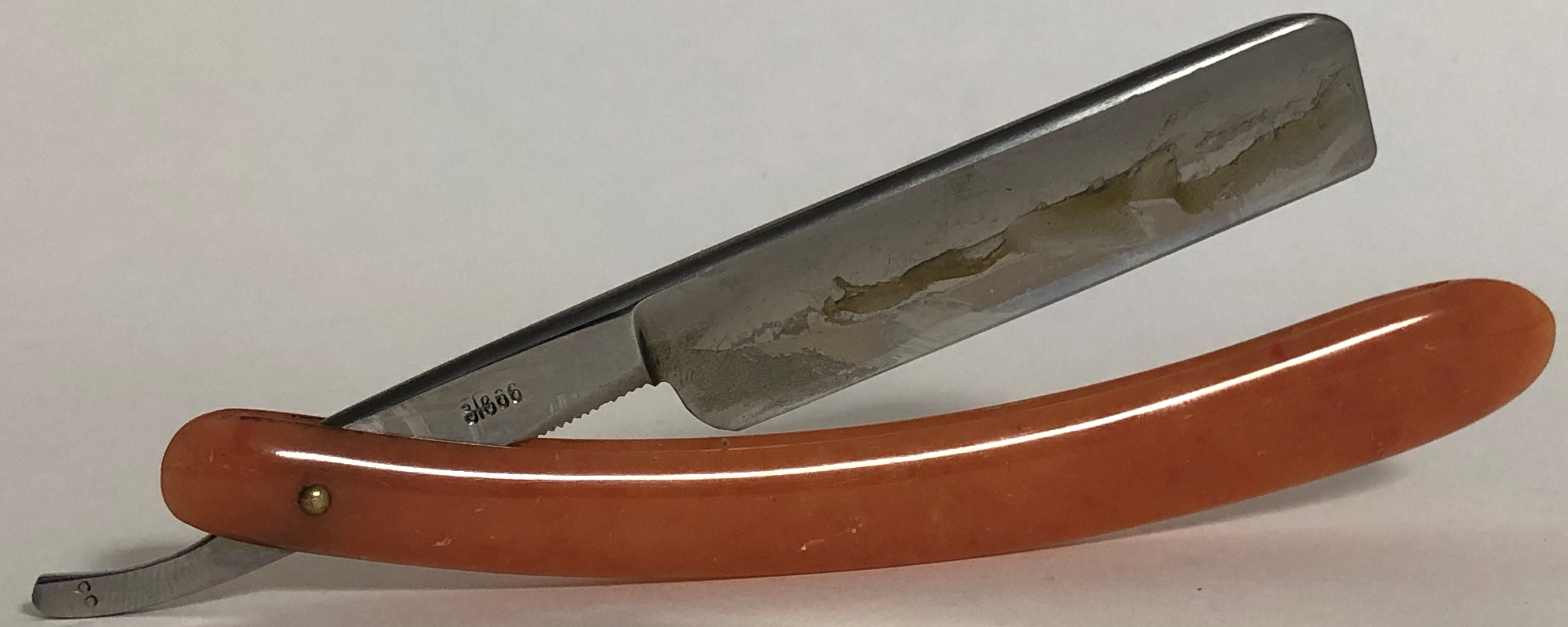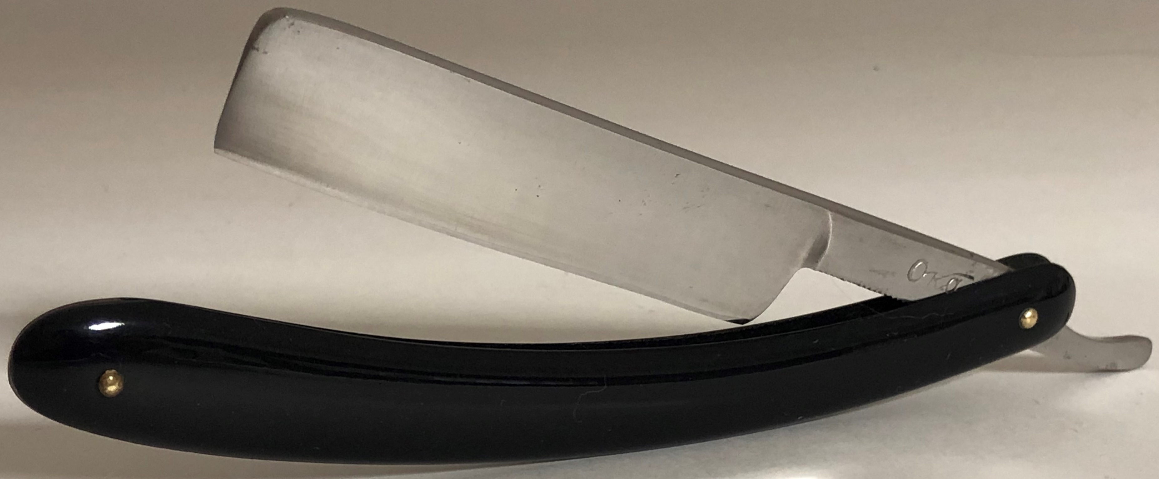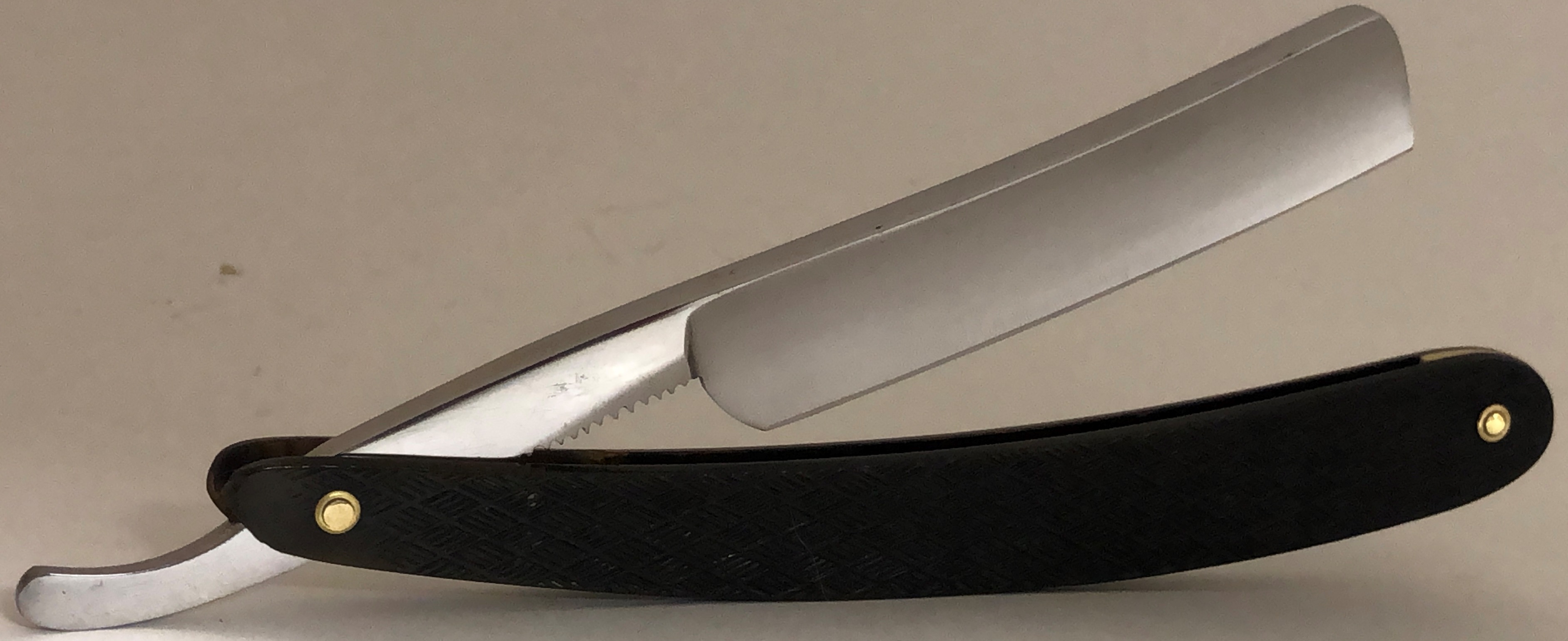 Эффектная немка, в состоянии близком к идеальному. Разобрал, немного освежил клинок , умеренно отполировал и снова собрал, с сохранением оригинальных пинов.Идеальная геометрия клинка. Кромочка равномерна по всей длине. Сталь чистая от разного рода видимых дефектов.Очень удобная бритва прежде всего для новичка.Заточена и готова к бритью.