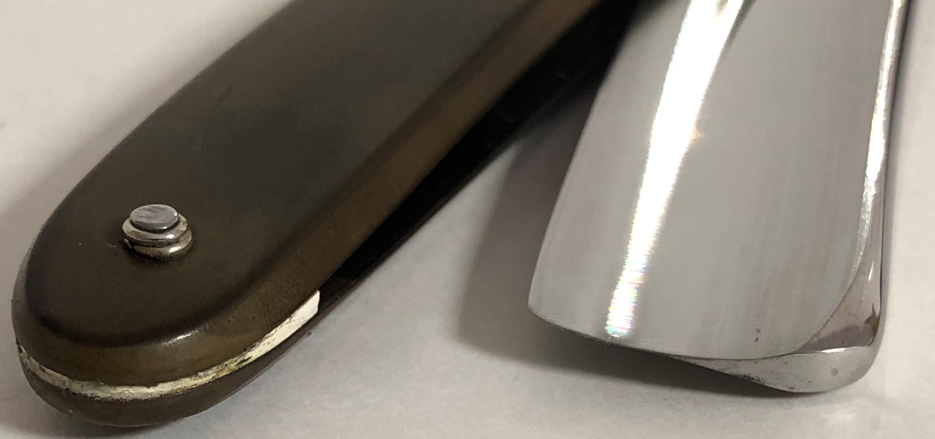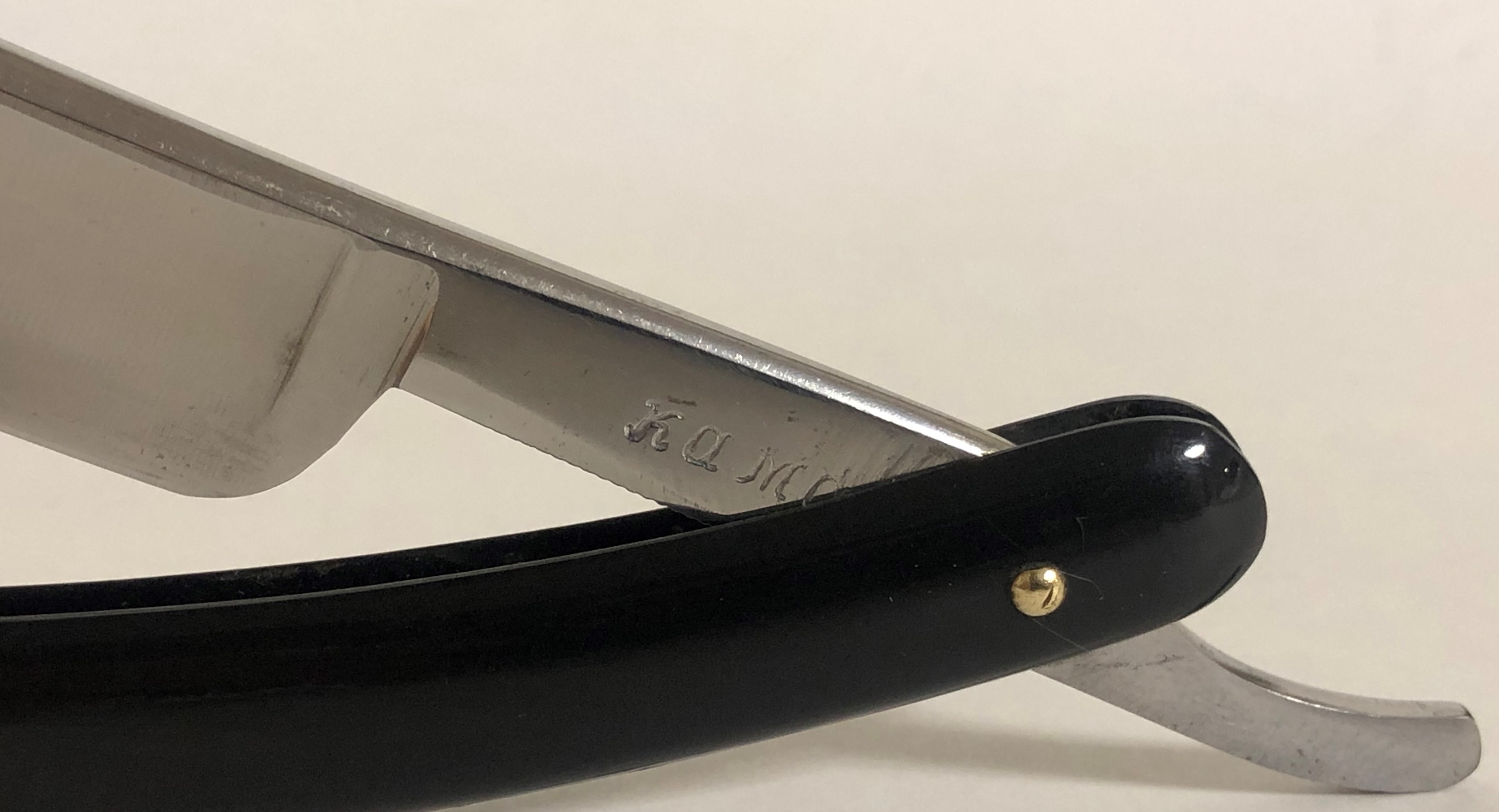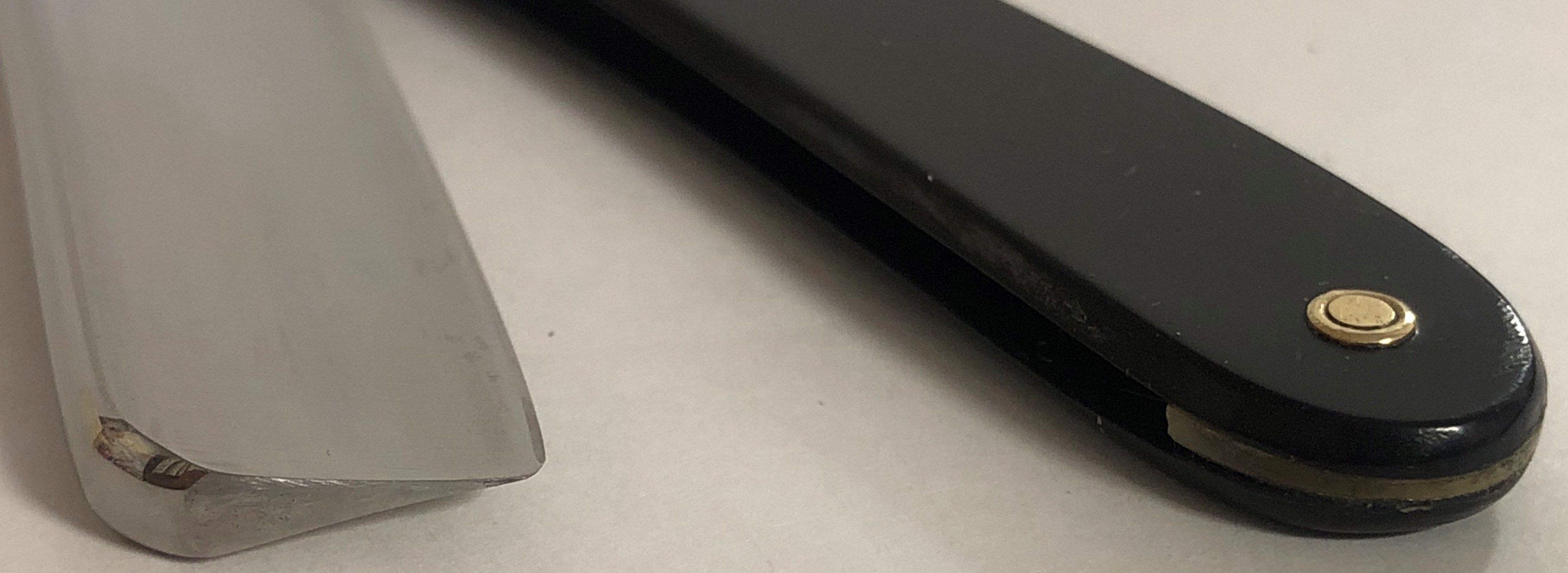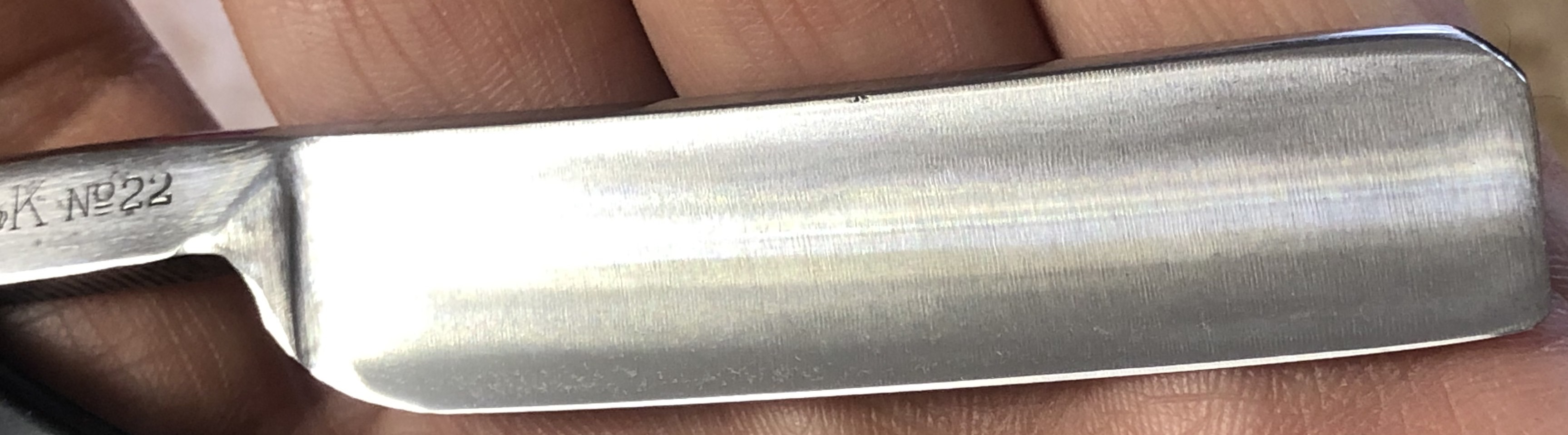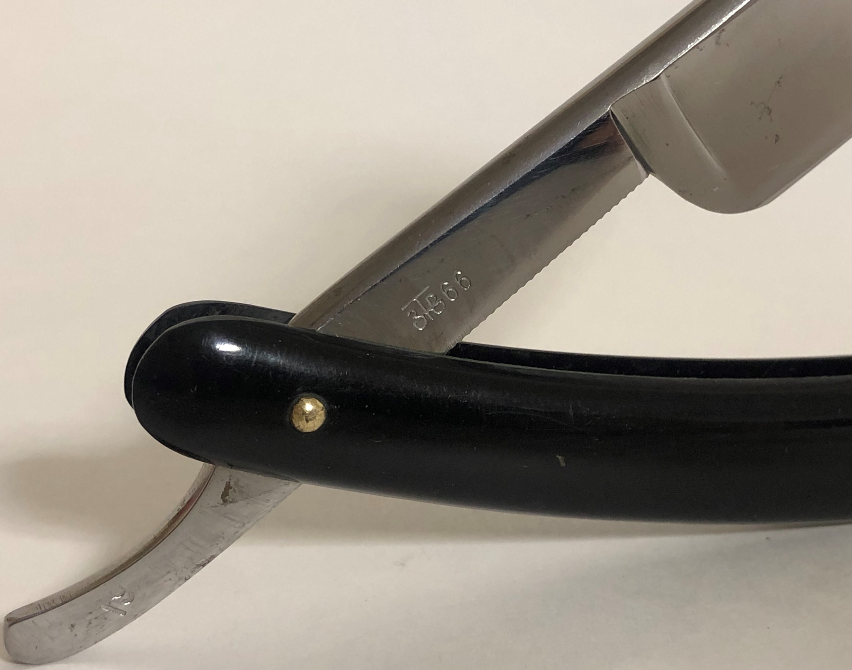 Бритва также в прекрасном состоянии для своих лет. Также была разобрана и приведена в порядок.Был убран небольшой скол в 0,5 мм, поэтому тут полотно немного Уже.По всей видимости эти две бритвы были из одной партии, так как характер нанесения штампа на обратной стороне похожи между собой. Небольшая непроштампованность имеется.Идеальная геометрия.Кромочка равномерна по всей длине.Сталь чистая.Бритва красивая, тяжёлая, с отличной сталью, способную выдавать чистое и мягкое бритье. Проверено лично..Заточена и лично протестирована.Родной коробочки не имеется.