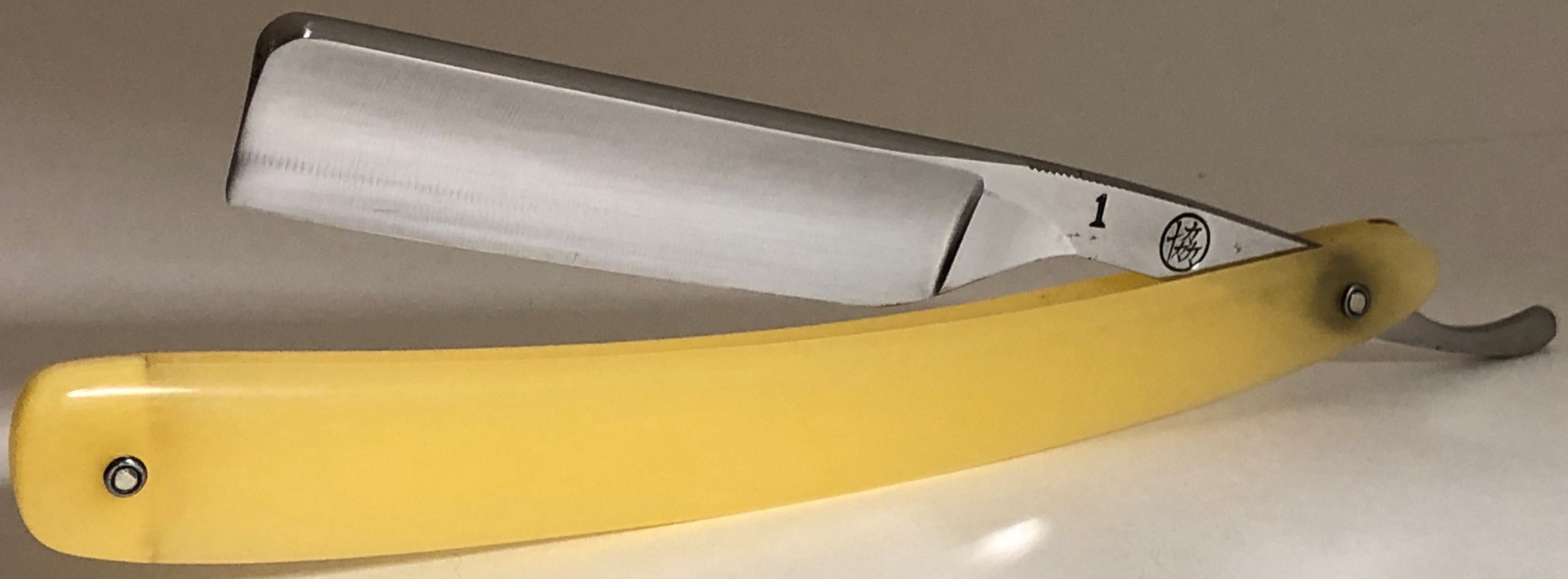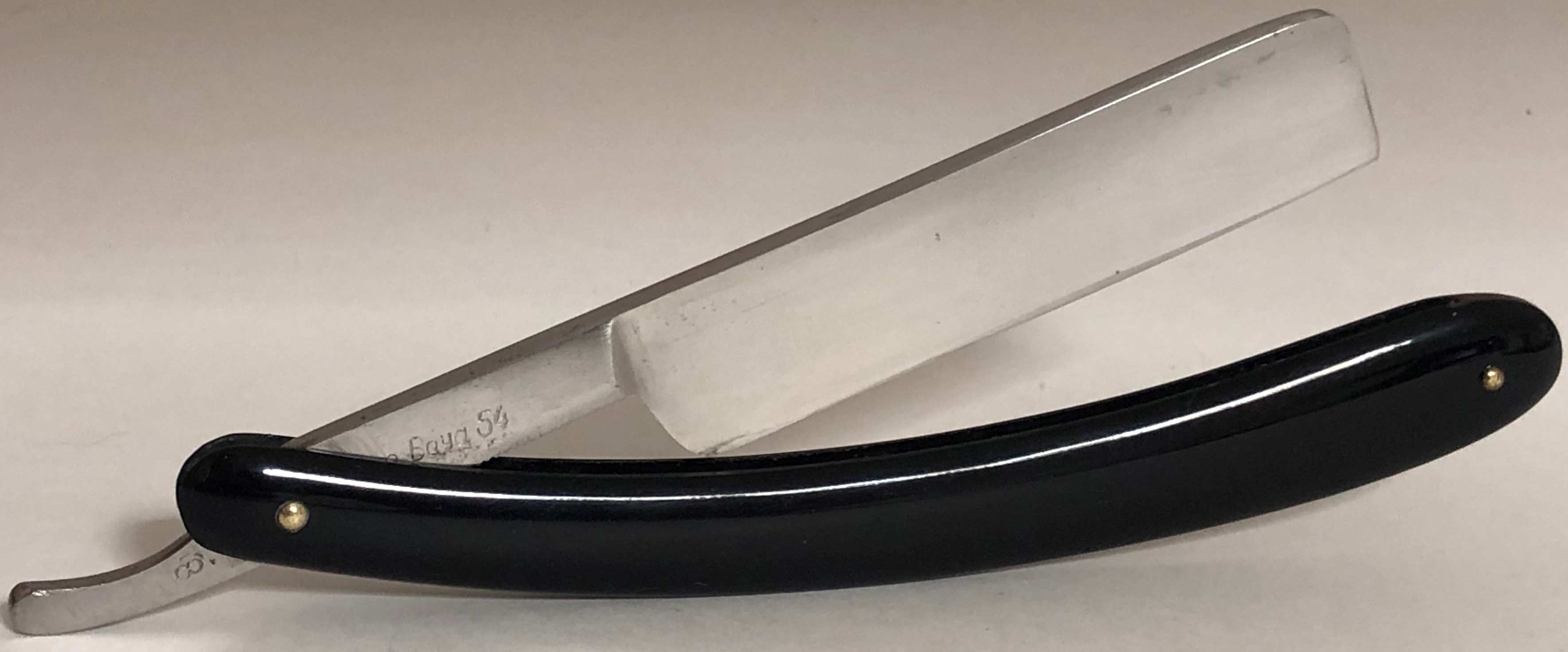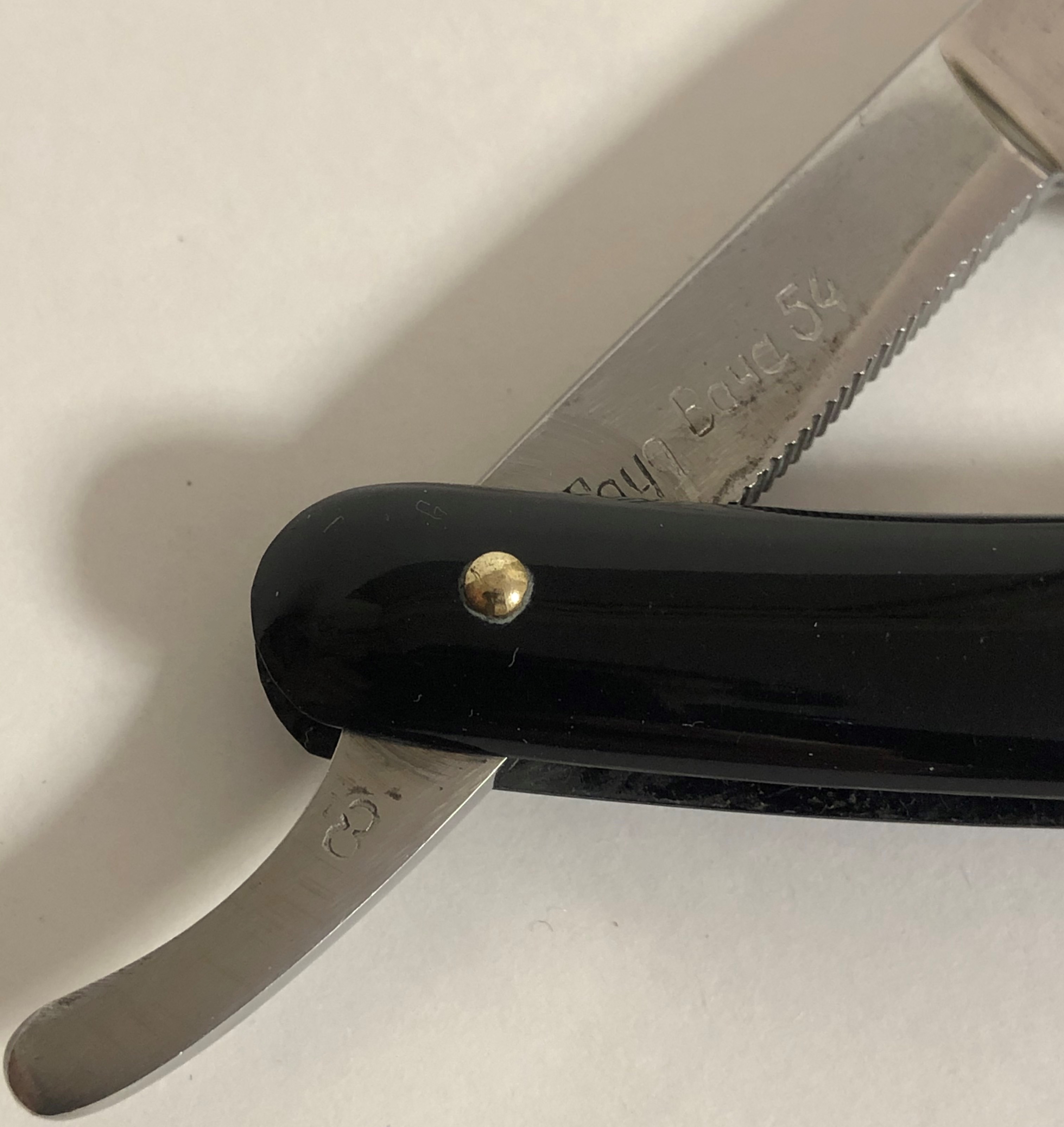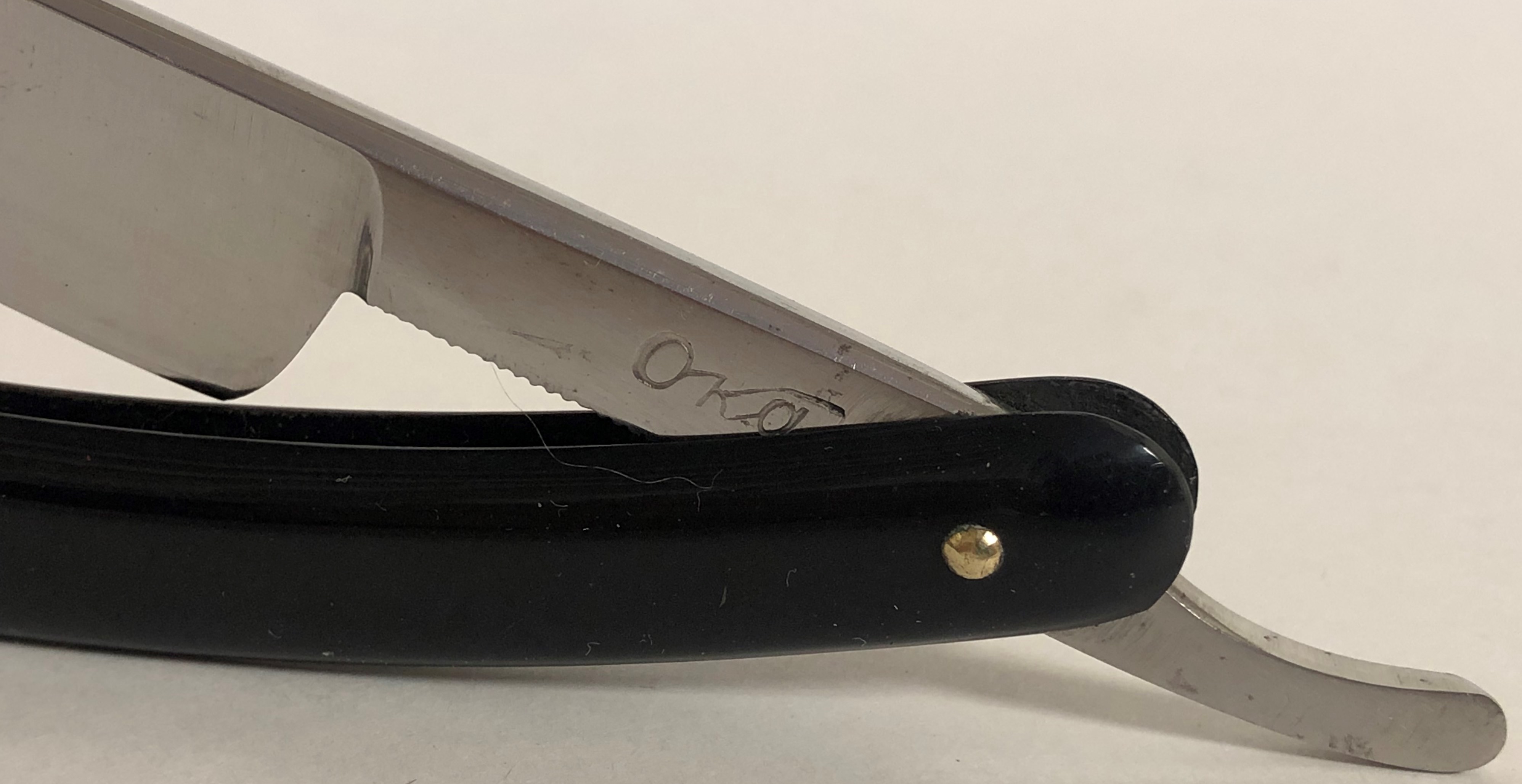 Бритва также в прекрасном состоянии для своих лет. Также была разобрана и приведена в порядок.Был убран небольшой скол в 0,5 мм, поэтому тут полотно немного Уже.По всей видимости эти две бритвы были из одной партии, так как характер нанесения штампа на обратной стороне похожи между собой. Небольшая непроштампованность имеется.Идеальная геометрия.Кромочка равномерна по всей длине.Сталь чистая.Бритва красивая, тяжёлая, с отличной сталью, способную выдавать чистое и мягкое бритье. Проверено лично..Заточена и лично протестирована.Родной коробочки не имеется.