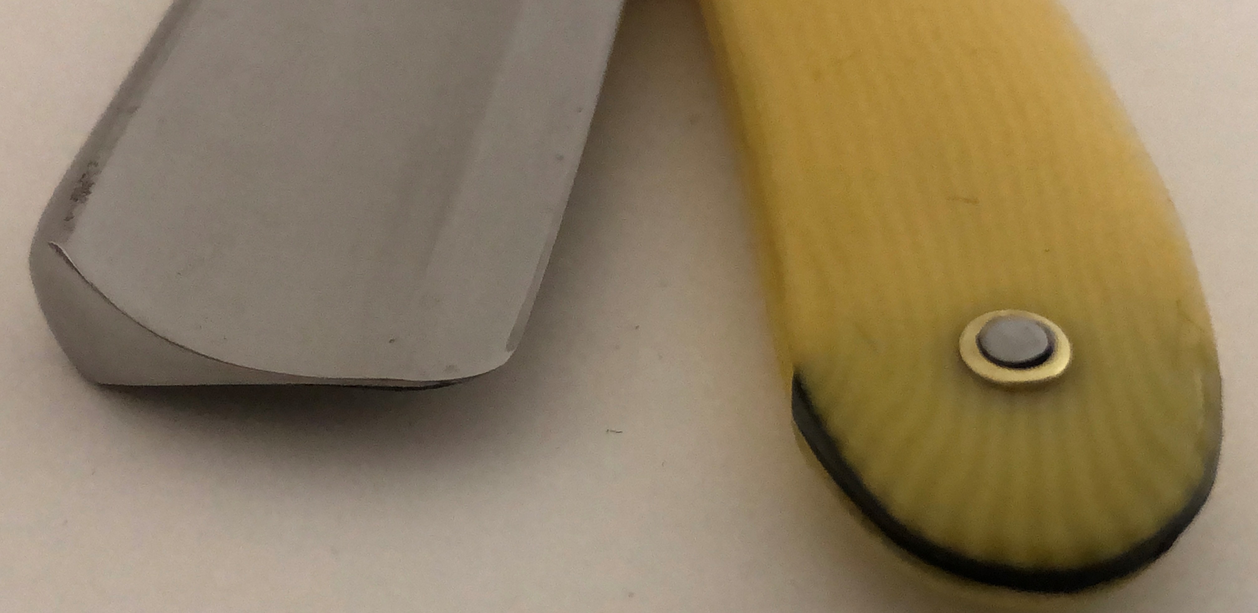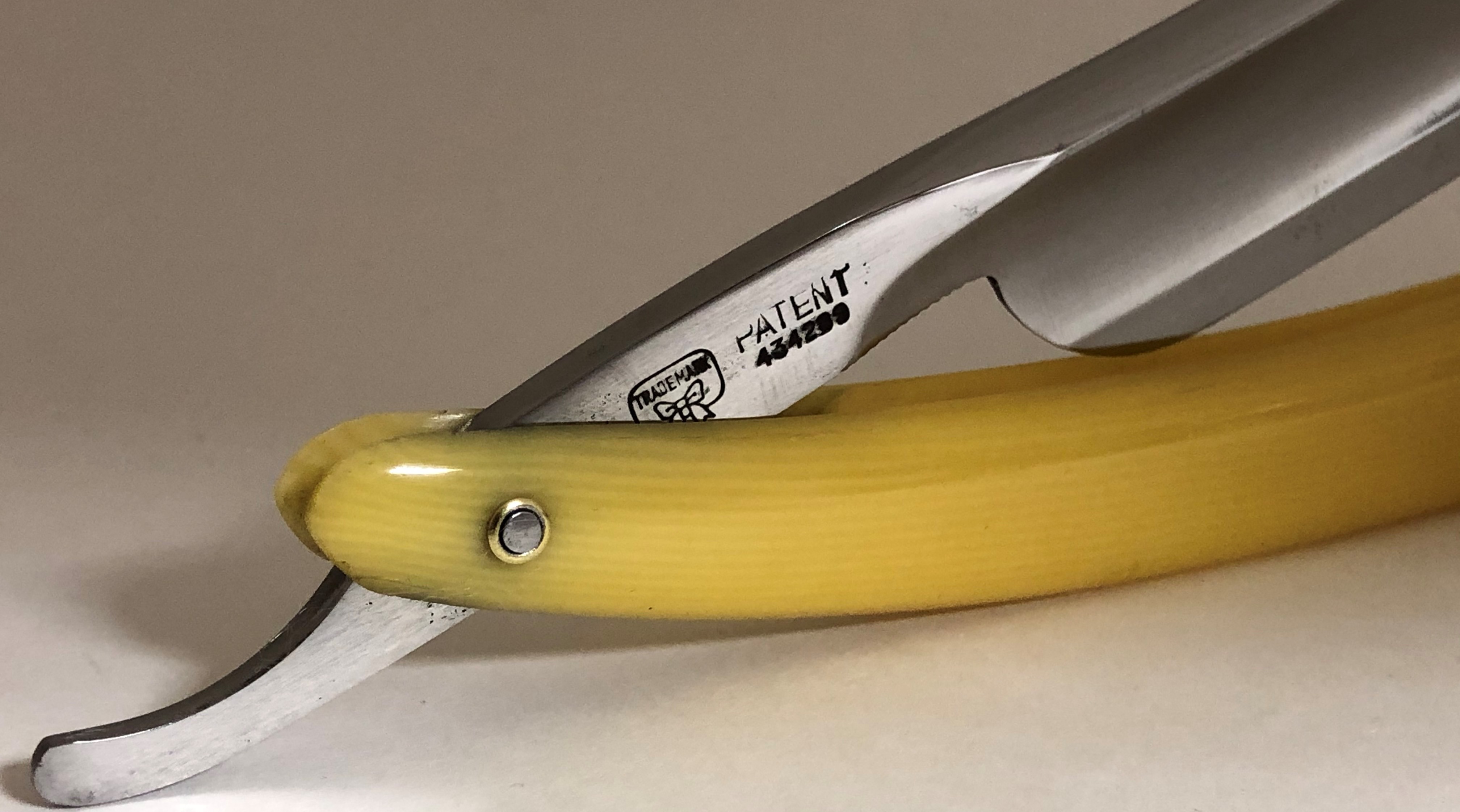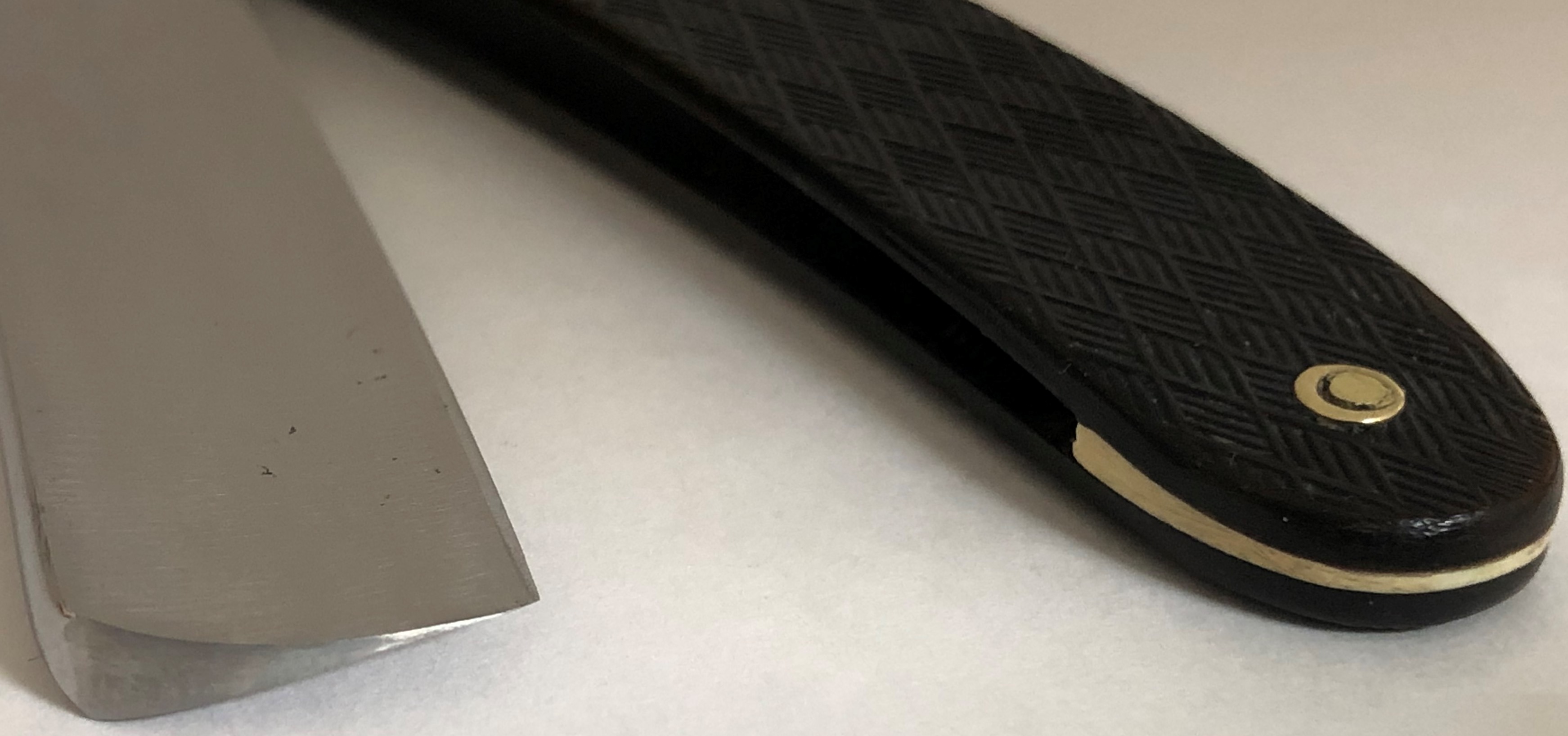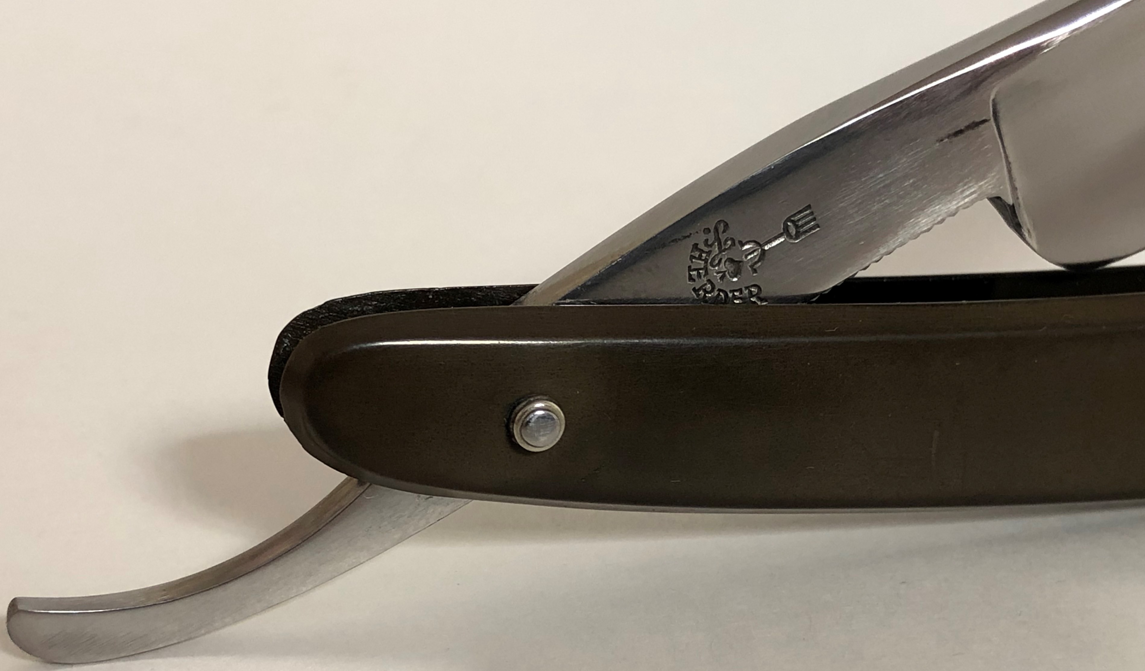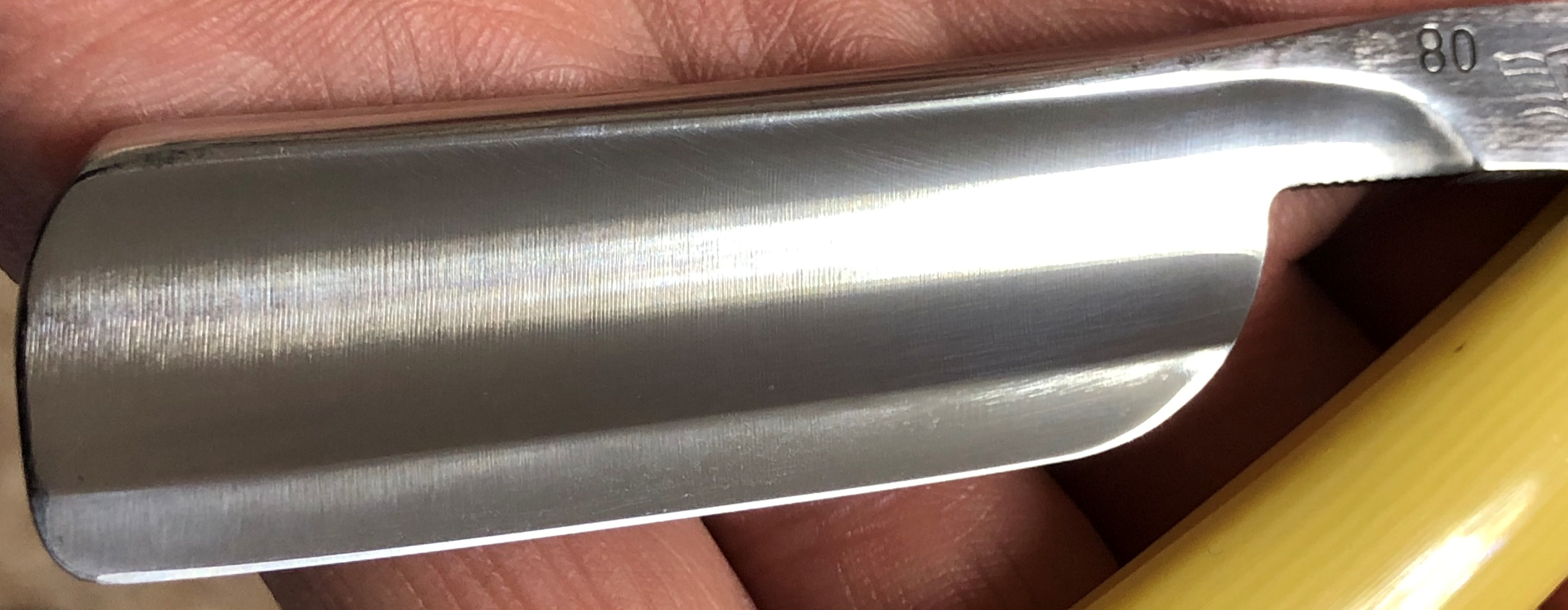 Бритва также в прекрасном состоянии для своих лет. Также была разобрана и приведена в порядок.Был убран небольшой скол в 0,5 мм, поэтому тут полотно немного Уже.По всей видимости эти две бритвы были из одной партии, так как характер нанесения штампа на обратной стороне похожи между собой. Небольшая непроштампованность имеется.Идеальная геометрия.Кромочка равномерна по всей длине.Сталь чистая.Бритва красивая, тяжёлая, с отличной сталью, способную выдавать чистое и мягкое бритье. Проверено лично..Заточена и лично протестирована.Родной коробочки не имеется.