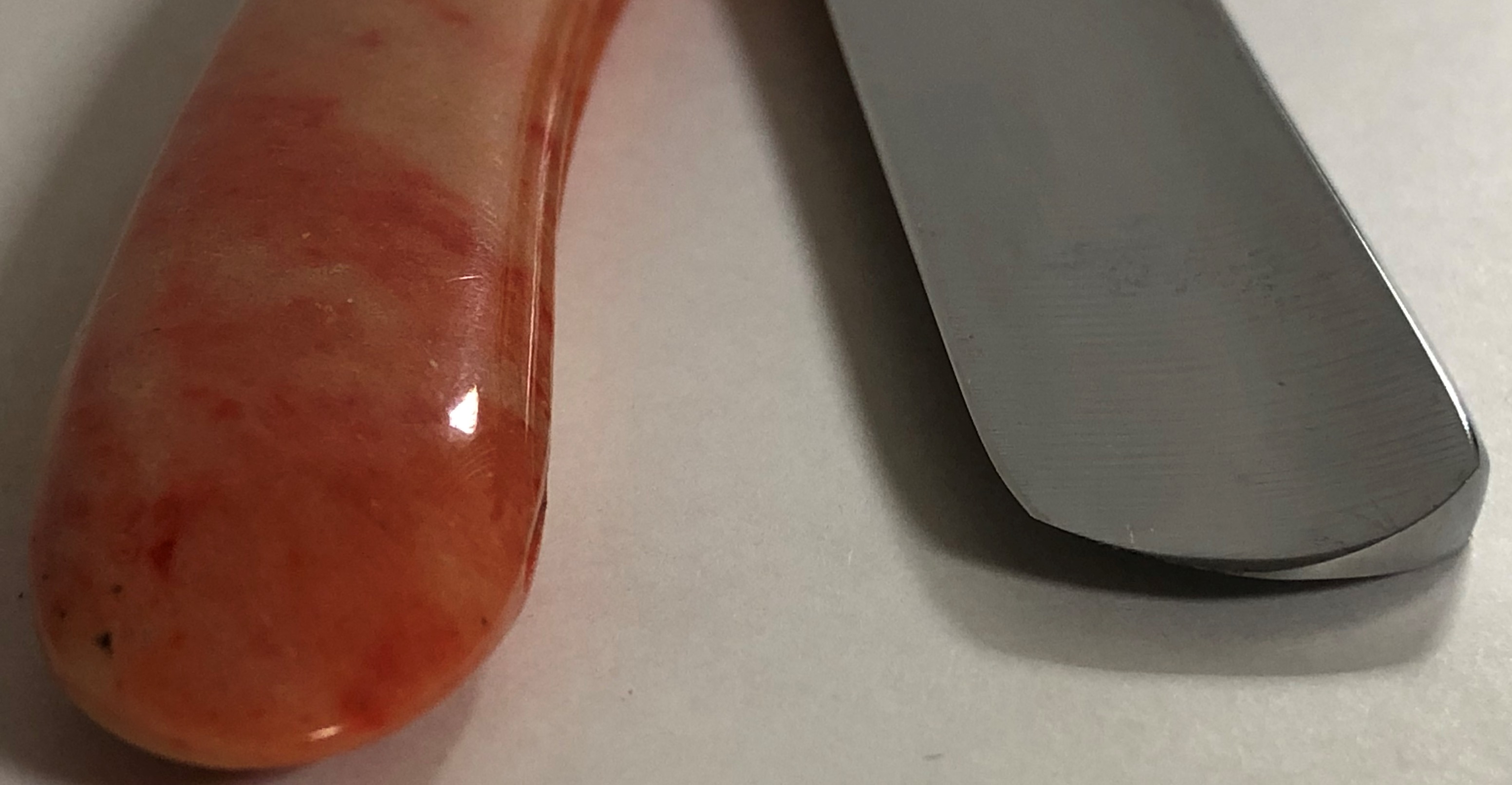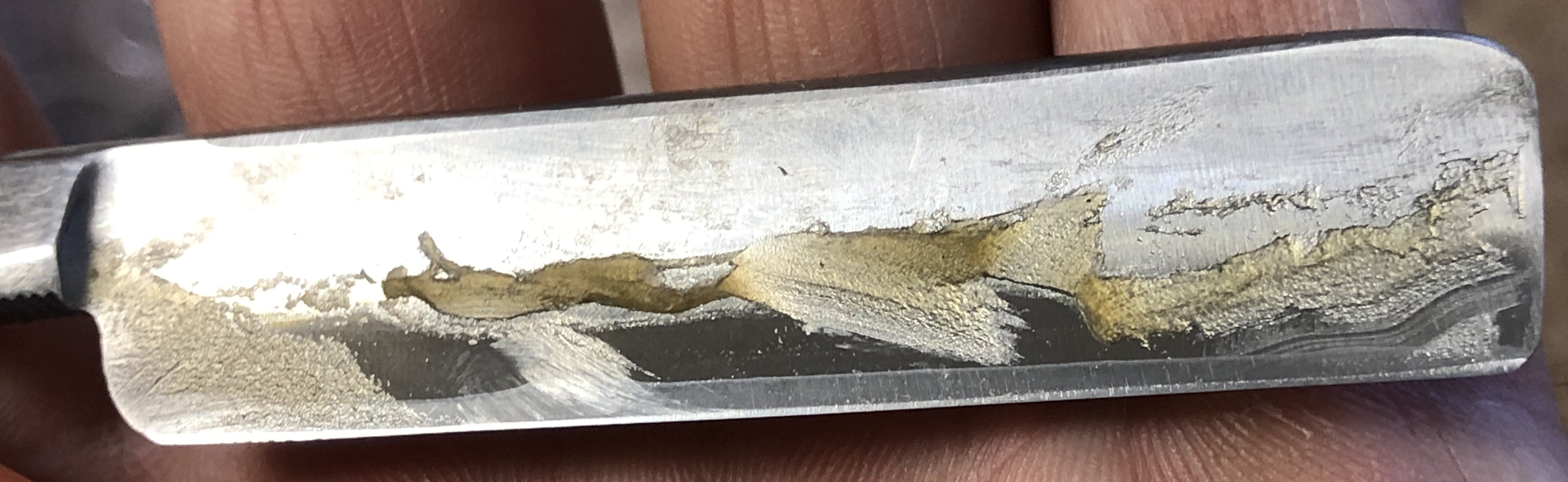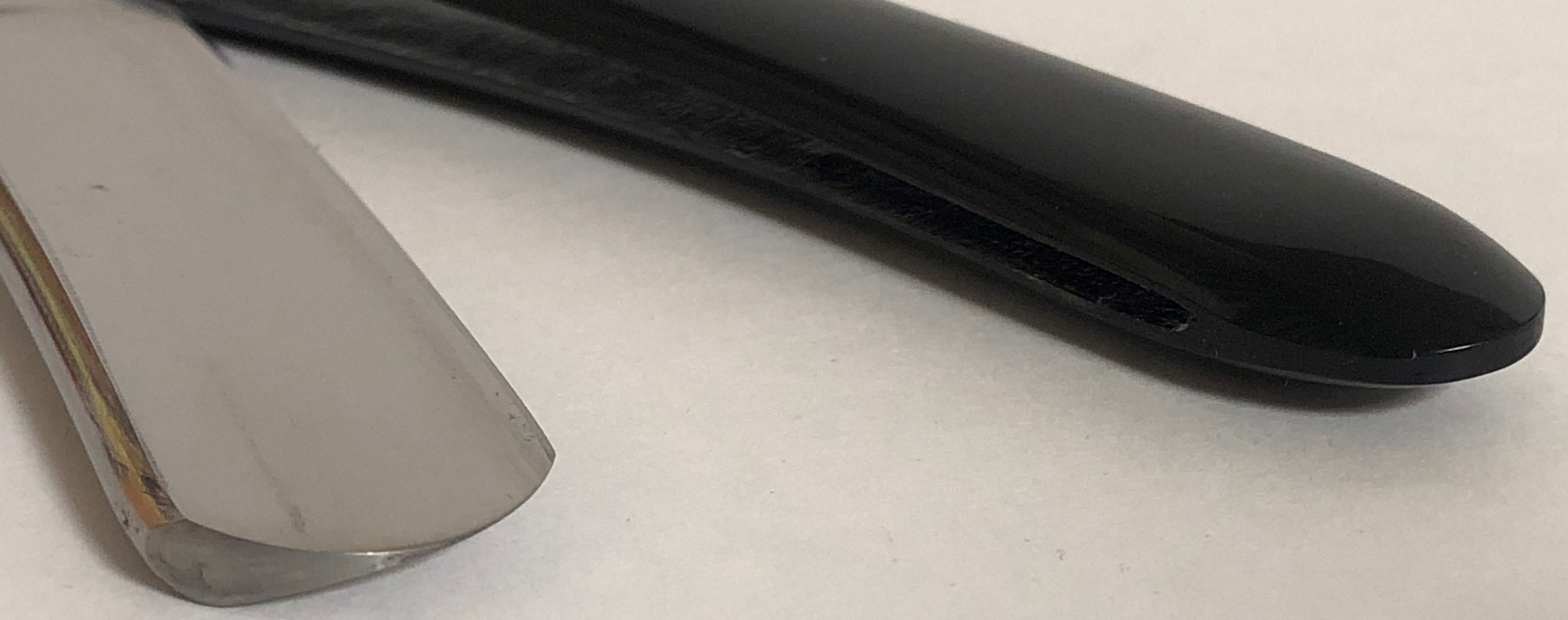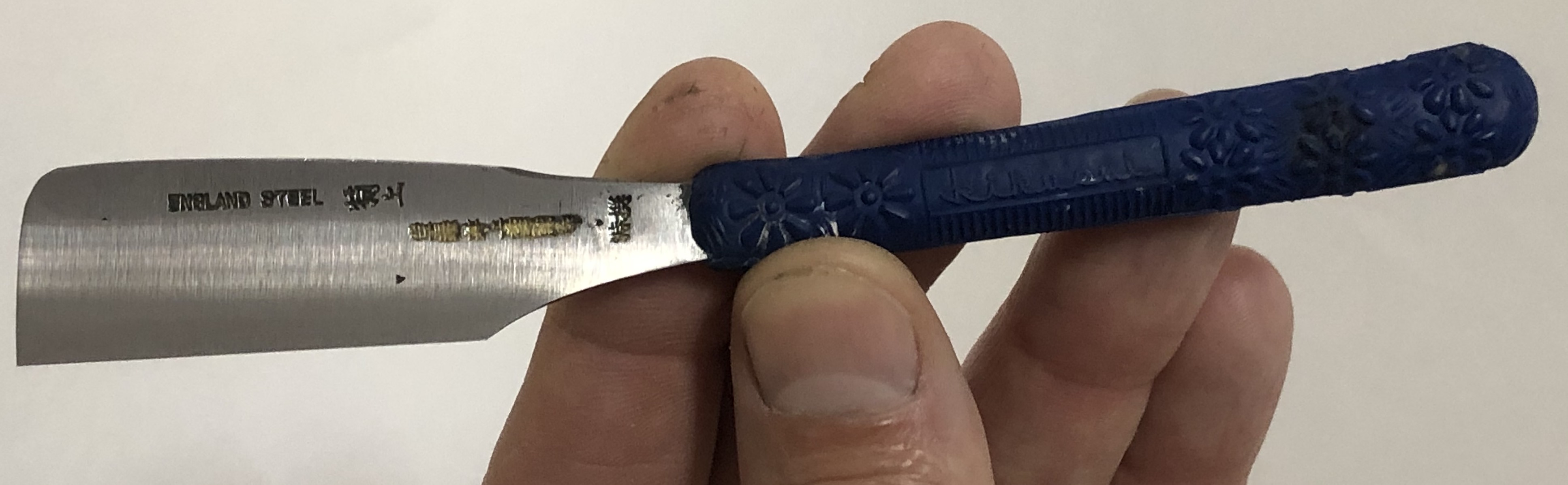 Изначально клинок в пользовании не был, но имел скол , примерно в 1-1,5 мм, который был благополучно сведен на нет.Заодно и немного освежил металл от древней патины,с попыткой повторения"родного"гринда.Сломанная оправа была поменяна на Стизовский донор, того же периода..Идеальная геометрия полотна:кромочка равномерна по всей длине.Заточена и готова к бритью.